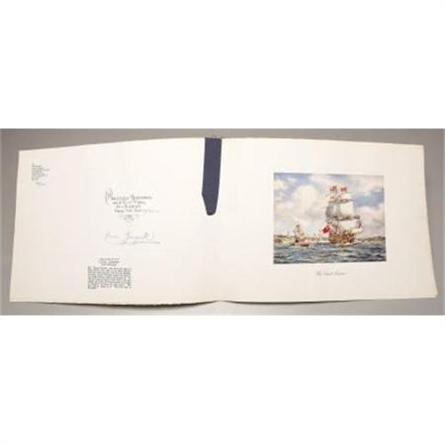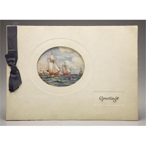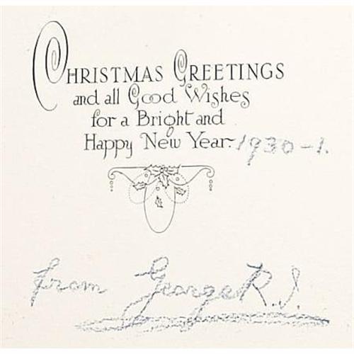 <B>Large Christmas Card from King George V</B></I><BR><BR>1930 Christmas card, oversize, signed by George V, King of Great Britain (r. 1910-1936) and dated in blue crayon, with a reproduction of the "Loyal London"- one of Charles II's sailing ships, on folded ivory cardstock, with navy grosgrain ribbon, 14 x 10 in.<BR><BR><BR><BR><b>Shipping:</b> Requires 3rd Party Shipping (<a target="_blank" href="http://www.heritageauctions.com/common/shipping.php">view shipping information</a>)