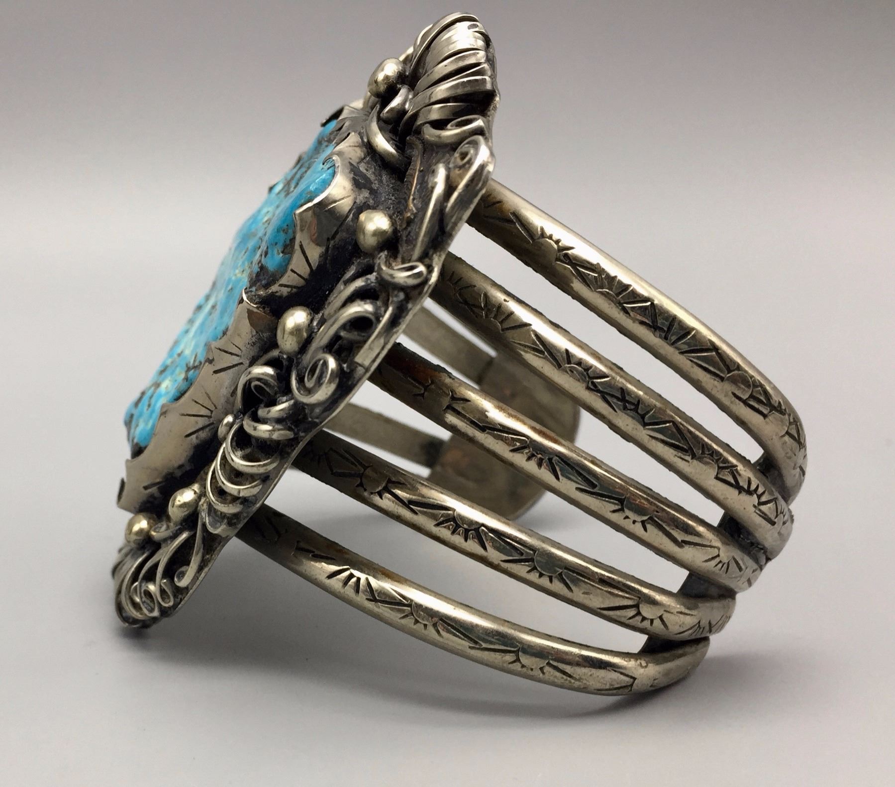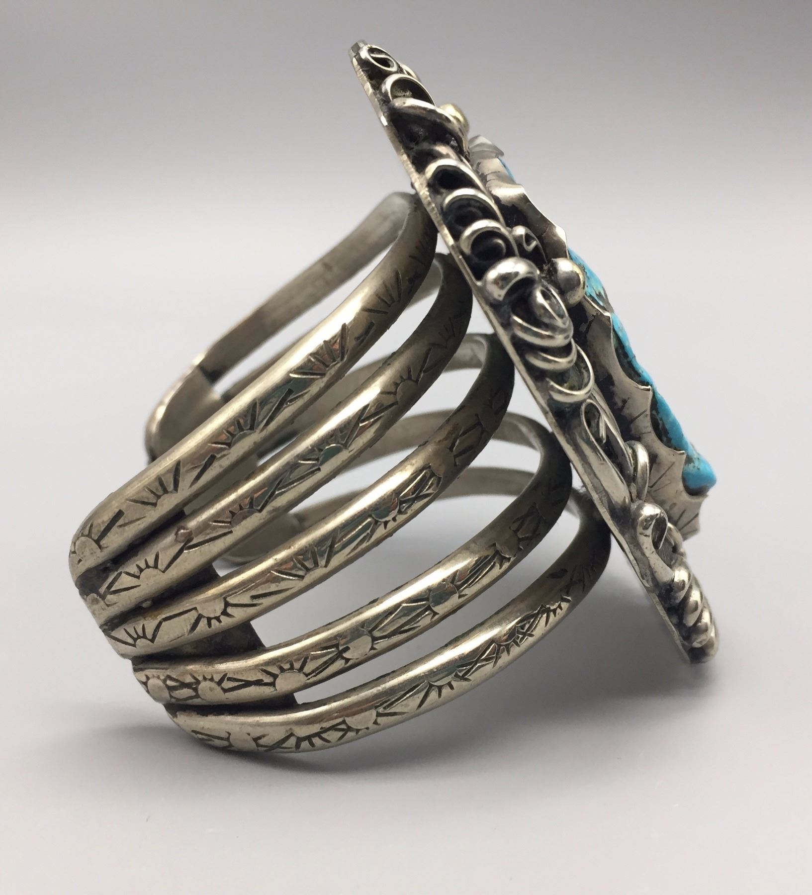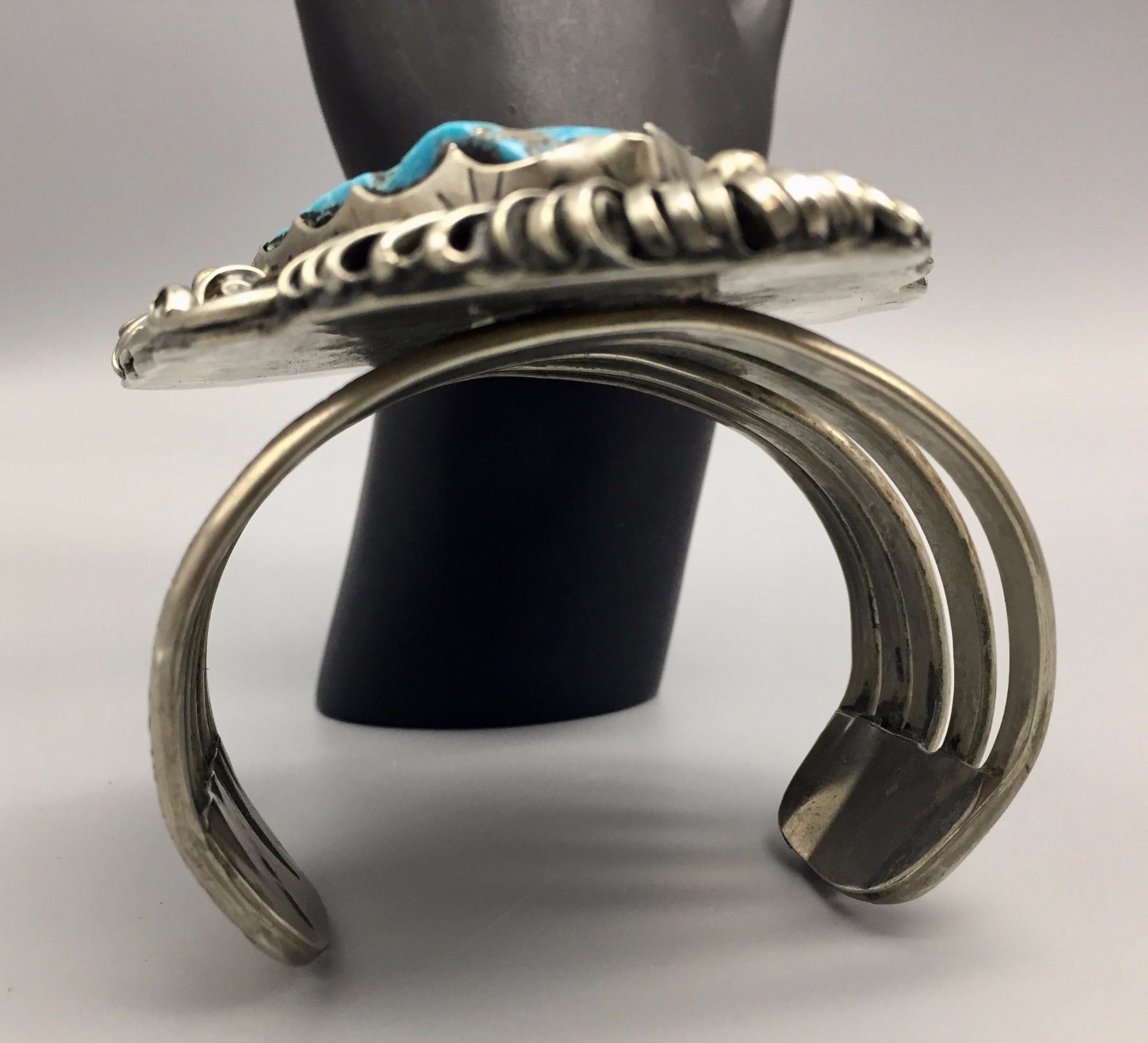 Maker: Unmarked, most likely Navajo. Approx. Age: Vintage (Circa 1970s - 1980s). Size: Inside circumference of bracelet is 5 5/8” plus it has a 1 7/8” opening (making it fit a 7 1/2” wrist). Bracelet is 3” at it’s widest point and weighs 177.8 g. Additional Info: Ginormous turquoise stone set in a heavy and ornate sterling silver. Condition: Good. Normal wear expected. Please look closely at the pictures - they are an important part of our description. Shipping: There will be a $5 handling / packaging fee for shipping this lot. The actual cost of postage will be added on top of that.