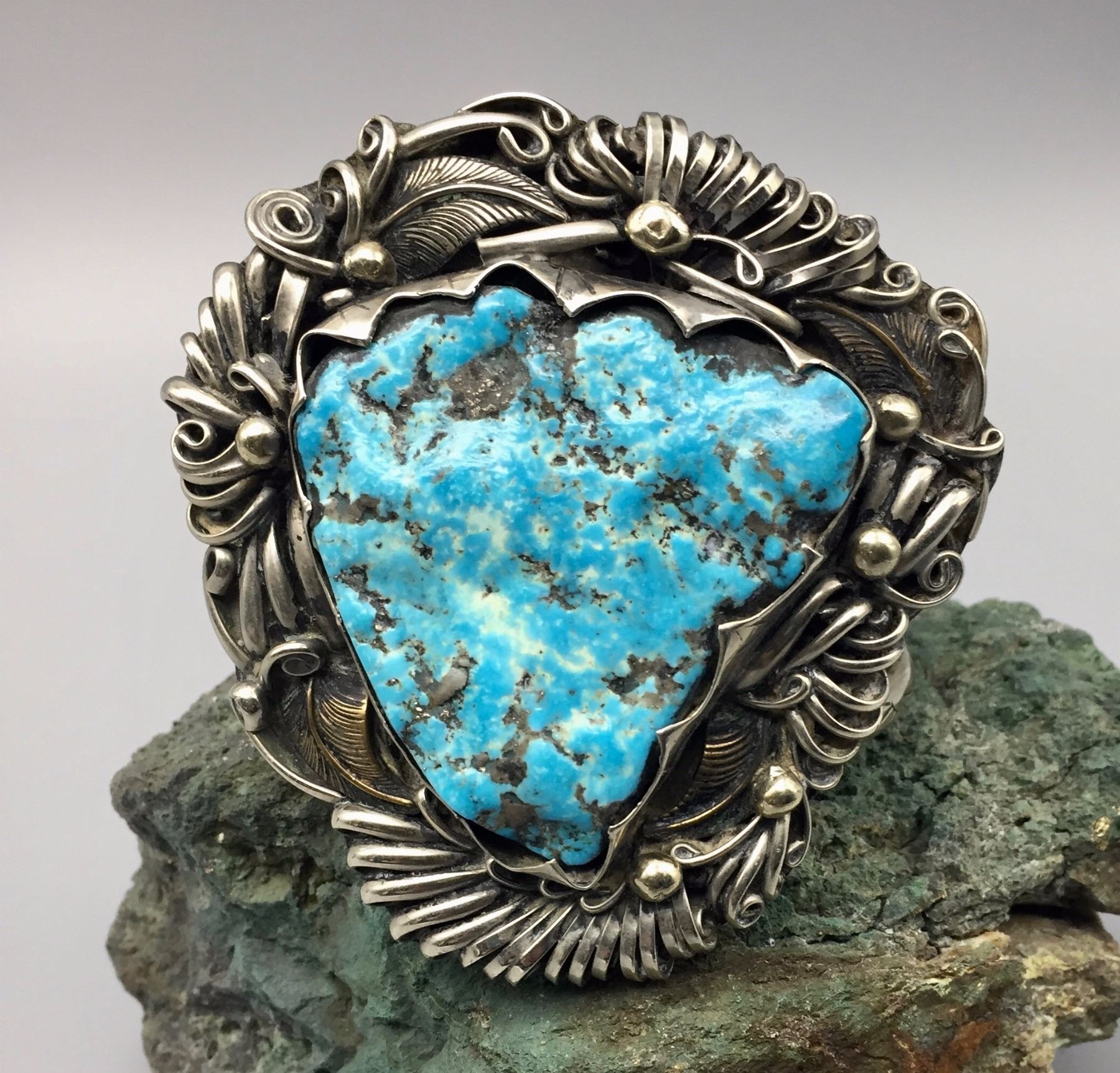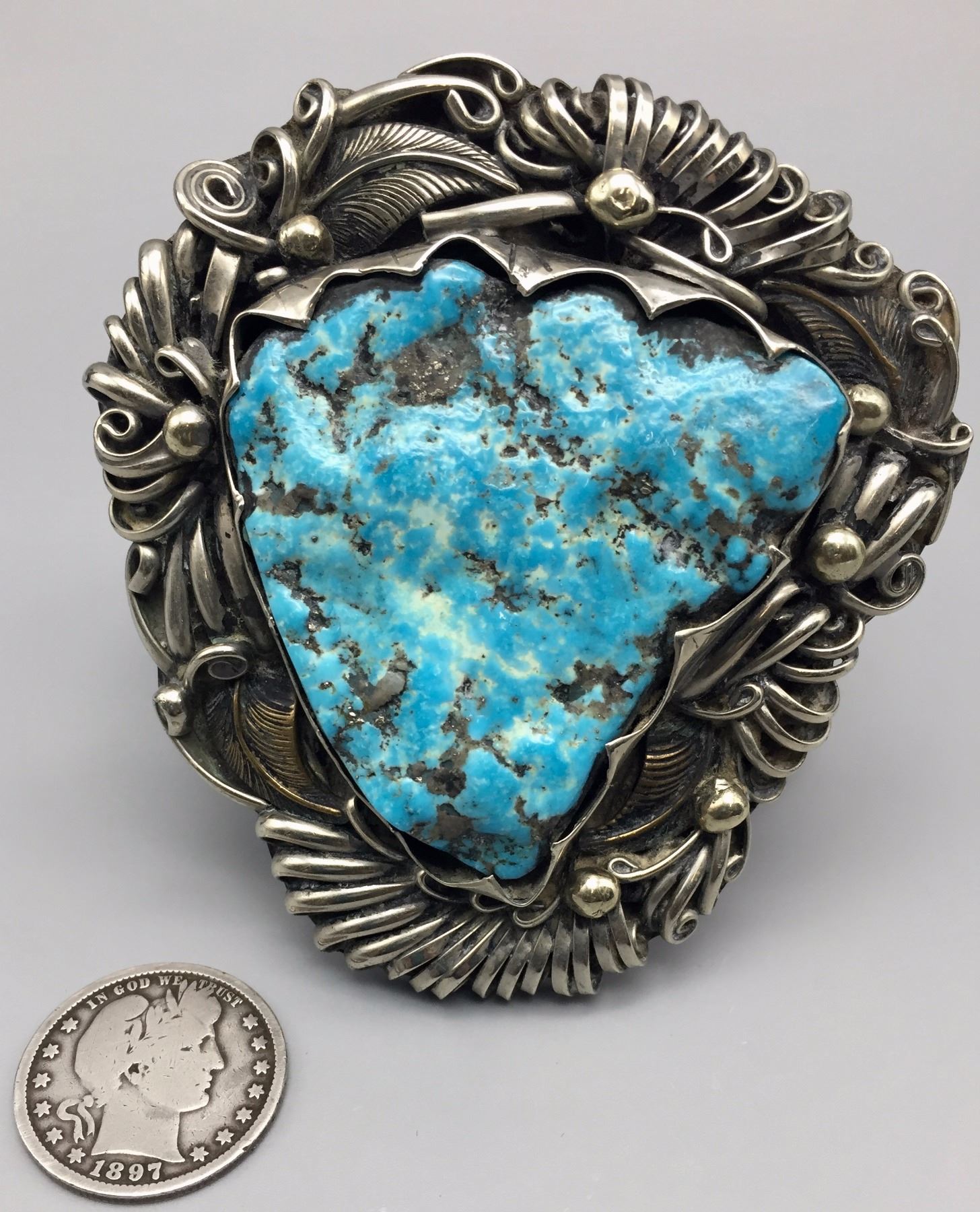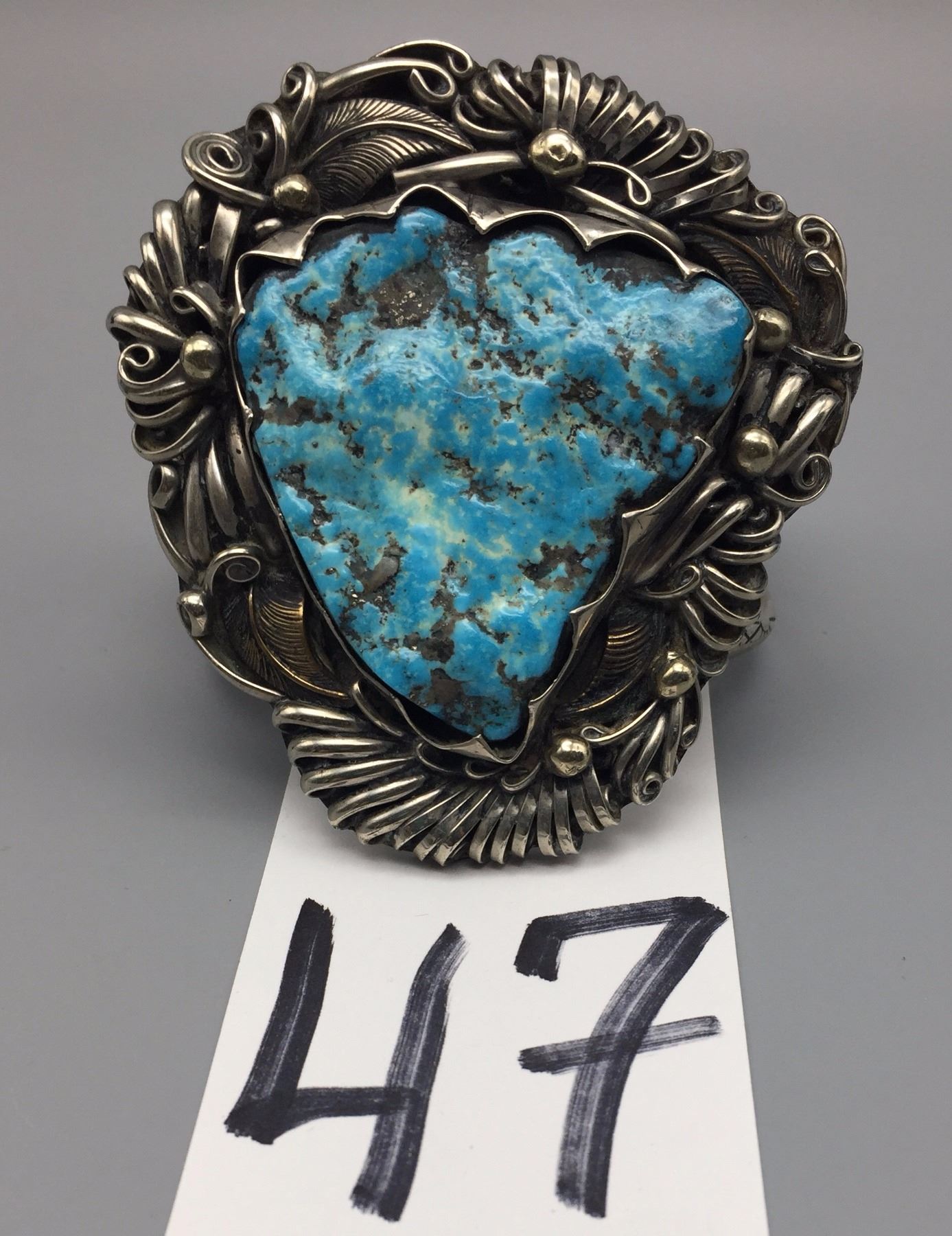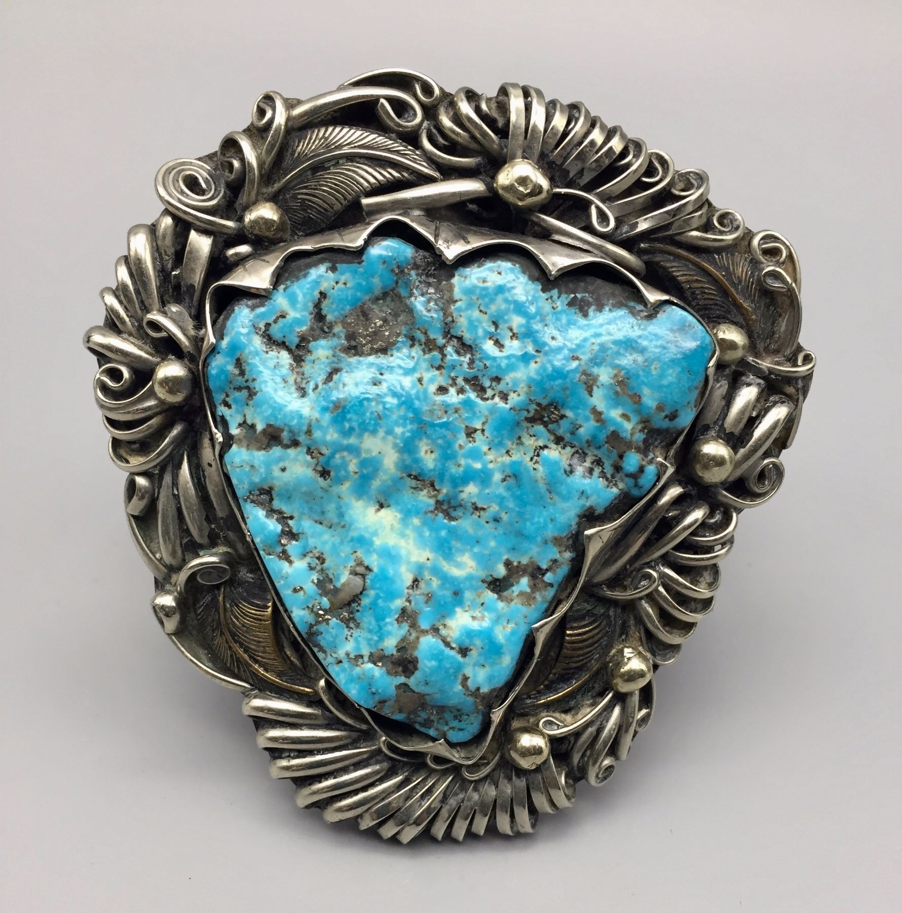 Maker: Unmarked, most likely Navajo. Approx. Age: Vintage (Circa 1970s - 1980s). Size: Inside circumference of bracelet is 5 5/8” plus it has a 1 7/8” opening (making it fit a 7 1/2” wrist). Bracelet is 3” at it’s widest point and weighs 177.8 g. Additional Info: Ginormous turquoise stone set in a heavy and ornate sterling silver. Condition: Good. Normal wear expected. Please look closely at the pictures - they are an important part of our description. Shipping: There will be a $5 handling / packaging fee for shipping this lot. The actual cost of postage will be added on top of that.