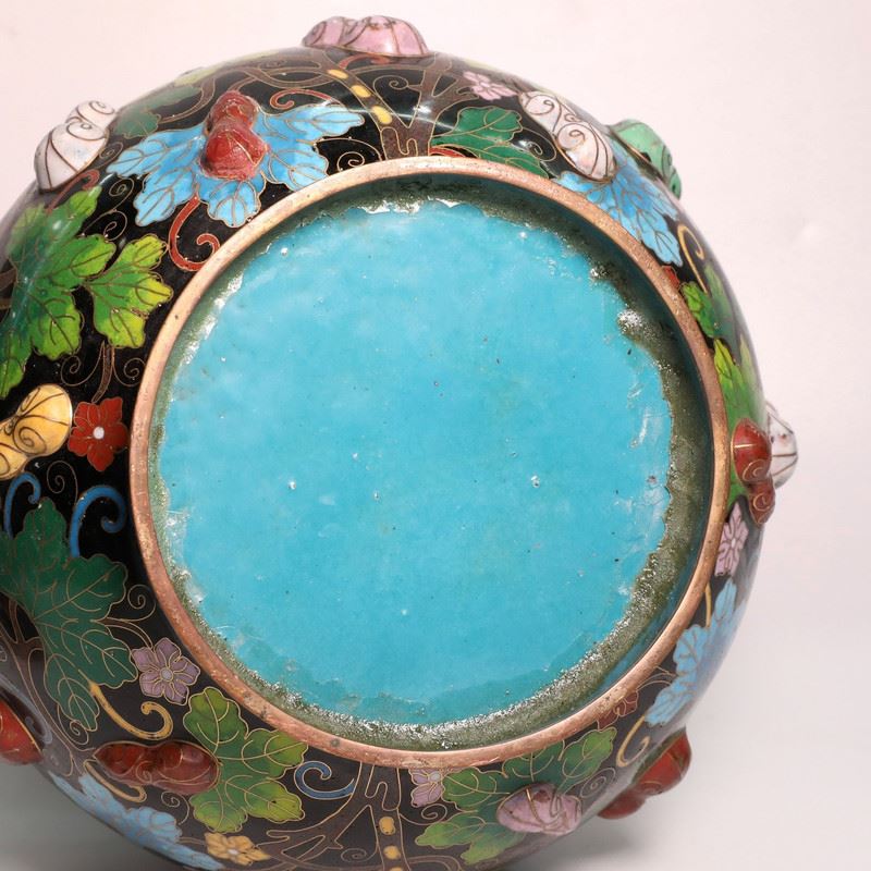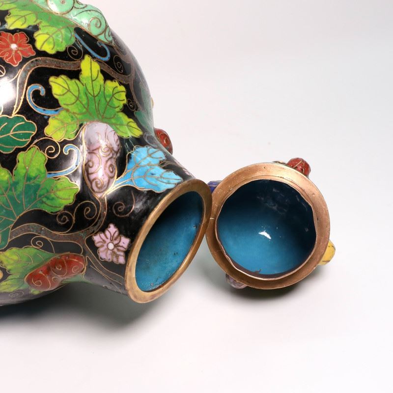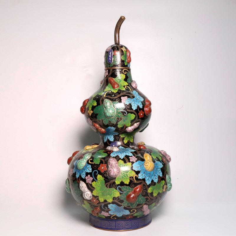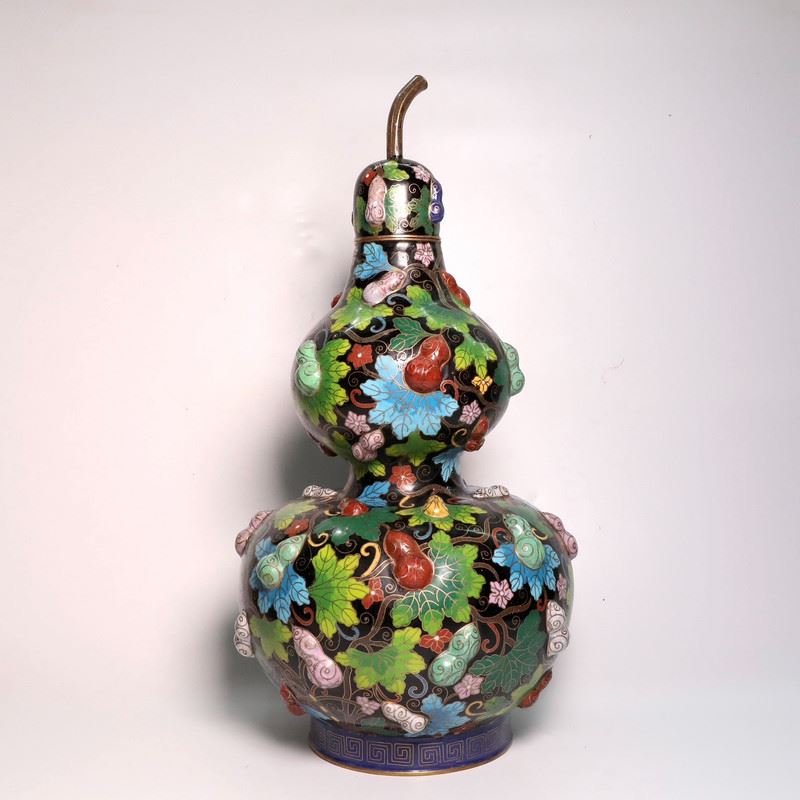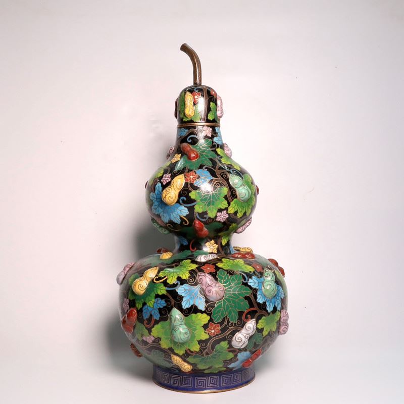 This large cloisonné double-gourd vase, crafted on a copper base, features a full and elegant form symbolizing “fortune and prosperity.” The body is richly decorated with entwined grape vines, vibrant leaves, and plump fruits, interspersed with lingzhi motifs symbolizing longevity and blessings. The black enamel ground enhances the brilliance of the colorful cloisonné design. Exquisite in craftsmanship and grand in appearance, it is a remarkable piece of both decorative and collectible value.