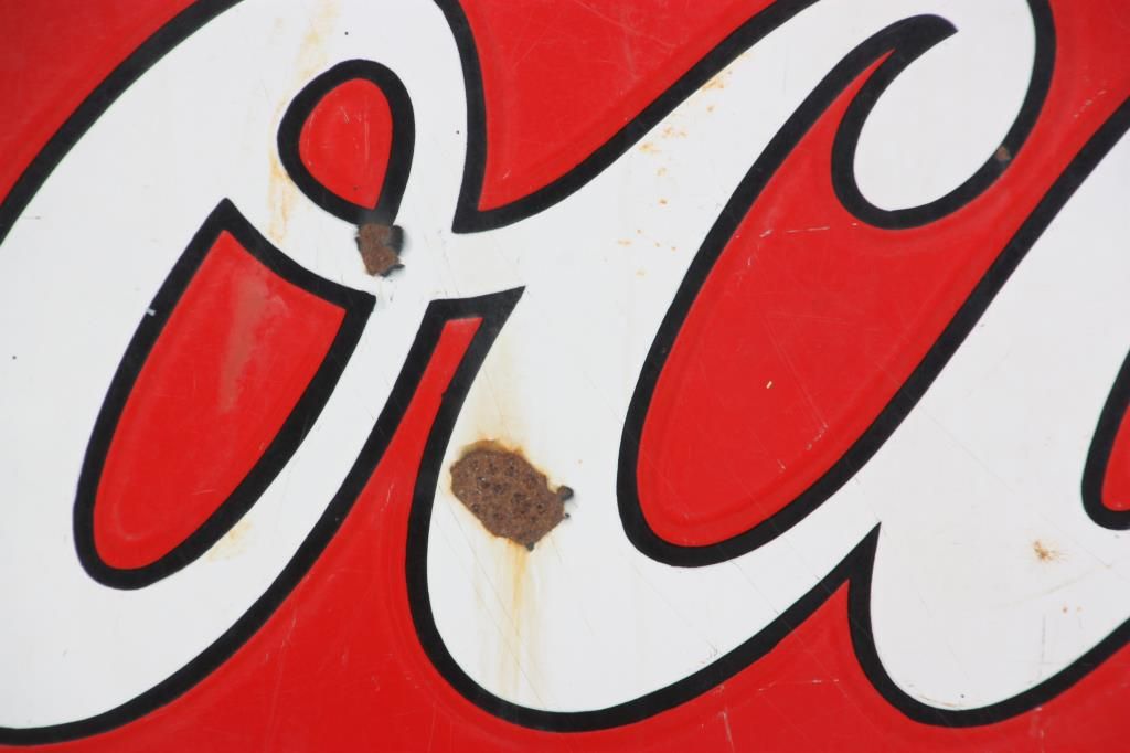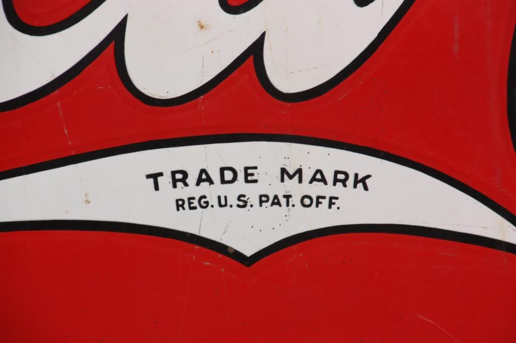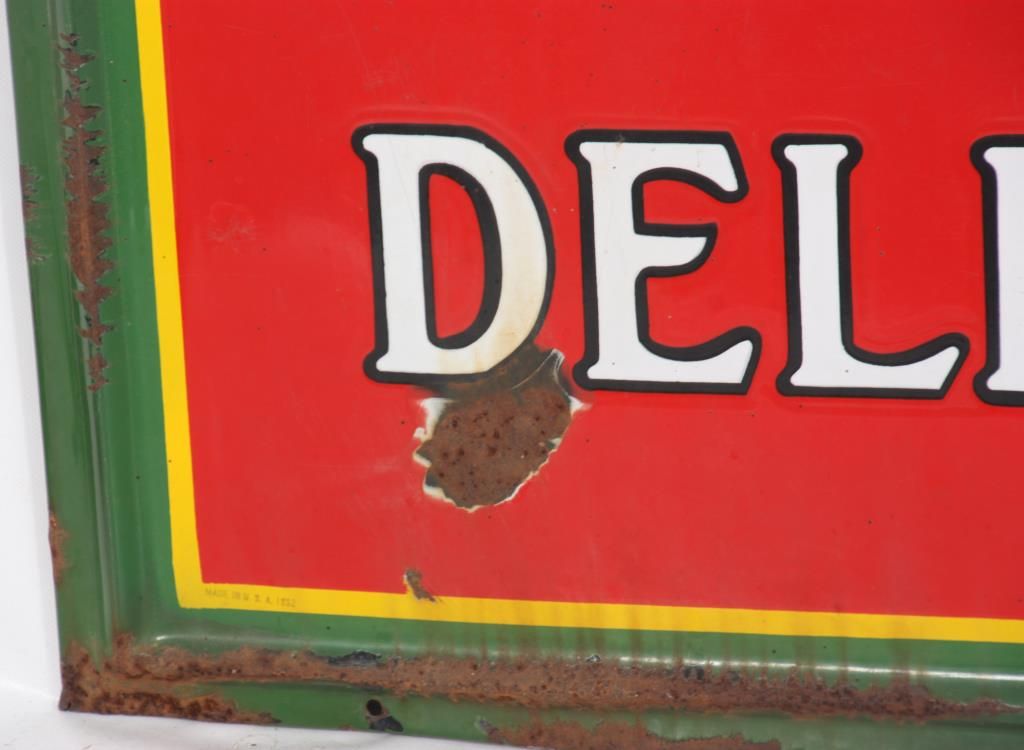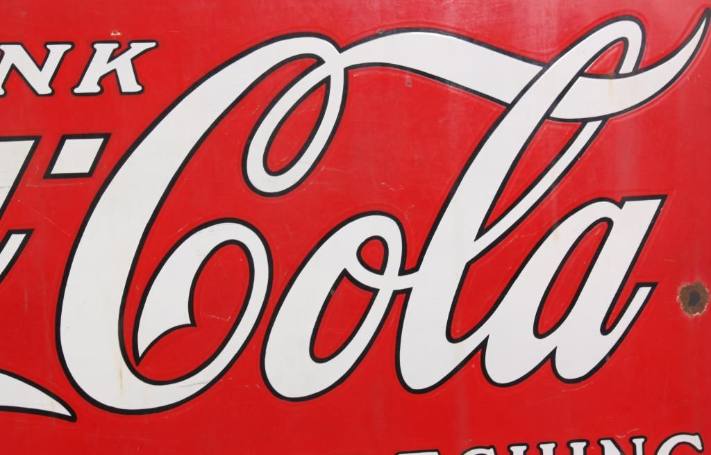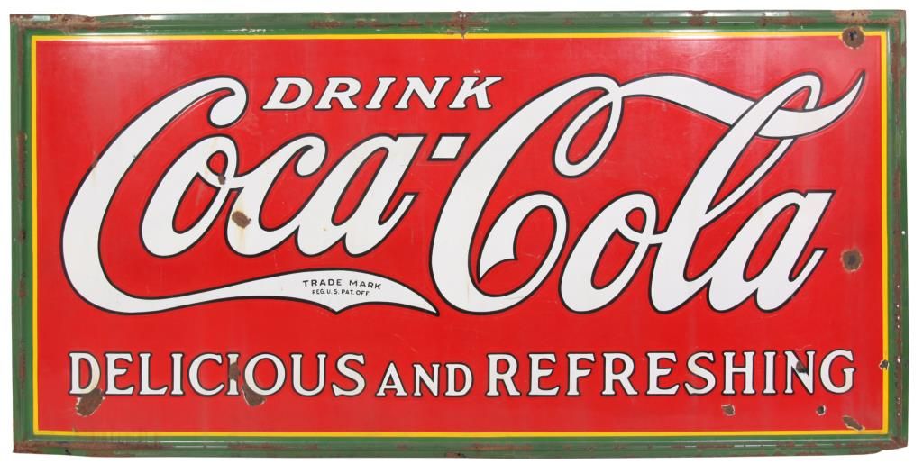 Large Coca-Cola Enamel Sign. Sign has a vibrant red background with white lettering “Drink Coca-Cola, Delicious and Refreshing”, has a dark green border with yellow edges. Signed in the lower right corner “Tenn. Mfg. Co., Nashville”. In good overall condition, has some chips and rust spots on the front. 48 in. high x 96 in. wide.