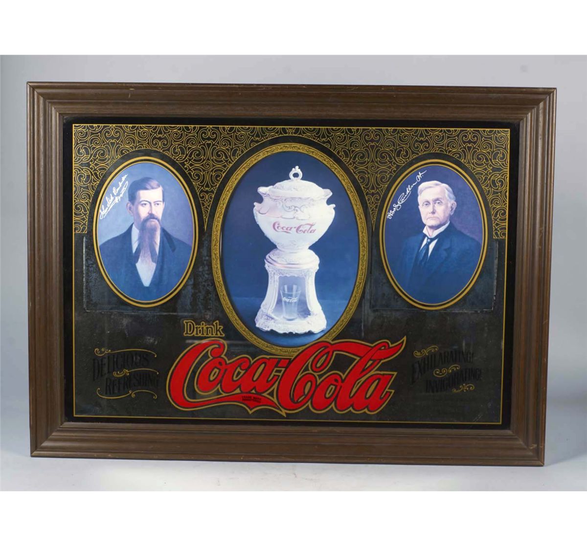 Reverse on glass printed sign showing company founder Candler, formula originator Pemberton and the famous 1896 Syrup dispenser in the middle, Limited Edition of 1000, circa 1977. Condition (Near mint plus). Size 26" x 36"