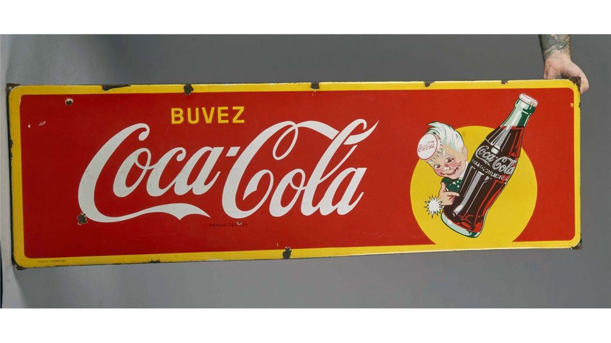 French language "Buvez Coca-Cola" by Foremail circa 1954. Possibly from Canada. Has some chipping. Condition (Very good). Size 18" x 57"