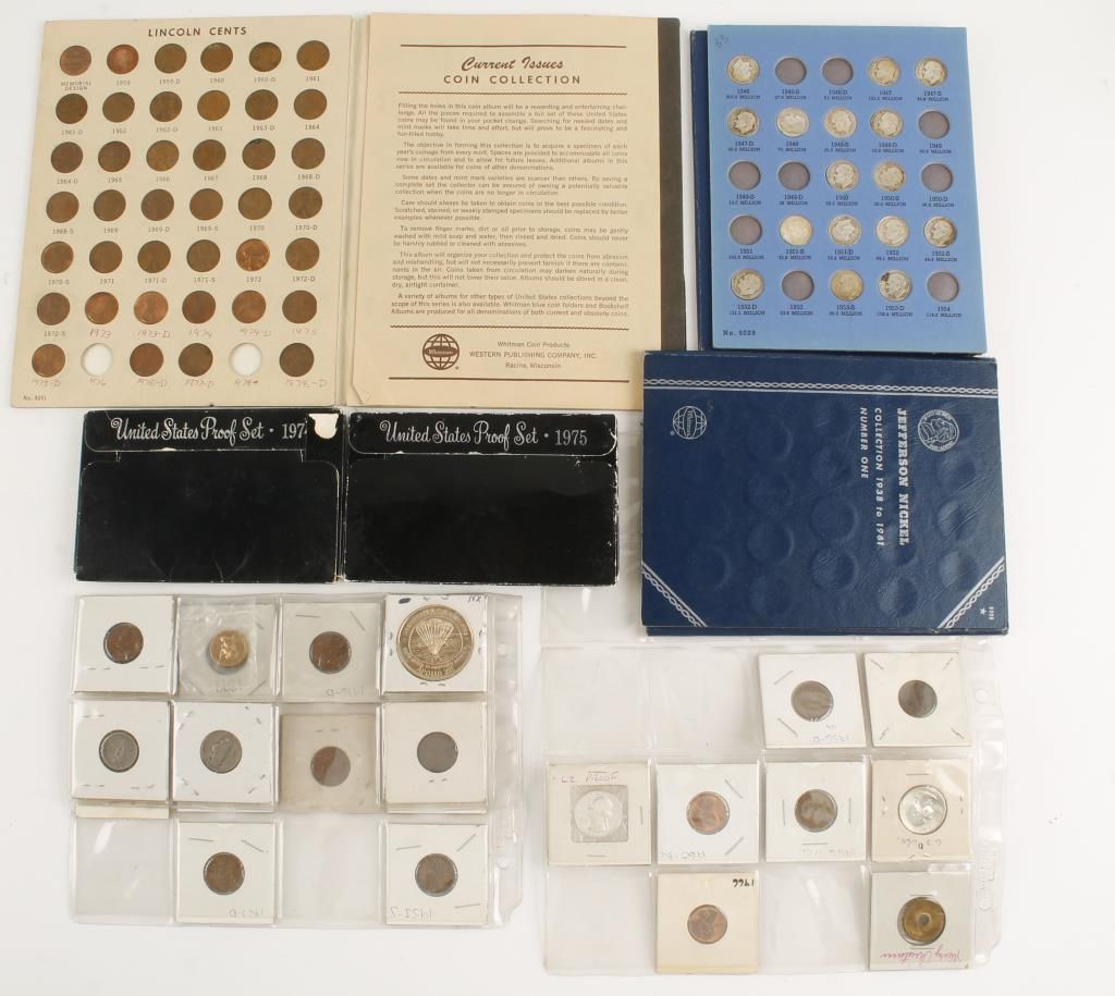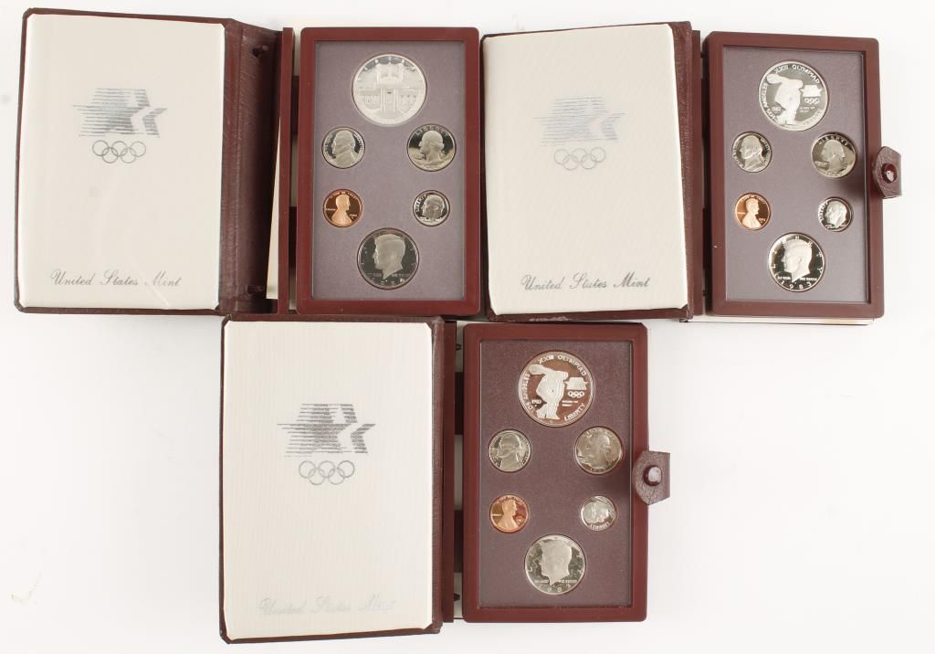 U.S. Mint 1979 uncirculated coin sets in original wrappers. (4) each: one-dollar, half-dollar, quarter, nickel, dime, and penny. (1) U.S. Mint 1965 uncirculated coin set in original wrapper. (1) each: half-dollar, quarter, nickel, dime, penny, and mint token. U.S. Mint 1984 uncirculated coin sets in original wrappers. Including (4) each: half-dollar, quarter, dime, nickel, penny, and mint coin. U.S. Mint 1985 uncirculated coin set. Includes (2) each: half-dollar, quarter, dime, nickel, penny, and mint coin. U.S. Mint 1986 uncirculated coin set. Includes (8) each: half-dollar, quarter, dime, nickel, penny, and mint coin. (1) 1974 Bicentennial Commemorative Medal. (1) 1976 Bicentennial Commemorative Medal. (1) 1974 Eisenhower Uncirculated Silver Dollar in original wrapper with treasury token. (1) Set of 1976 coins in original seal: dollar, half dollar, and quarter. (1) Set of approx (59) pennies in collection folder, various dates 1959-1978. (1) Set of approx (33) dimes in collection folder, various dates 1946-1963. (1) Set of (18) Mercury head dimes in collection folder, various dates 1924-1945. (1) Set of (16) Jefferson nickels in collection folder, various dates 1940-1951. (3) Buffalo nickels 1923 and 1927. Approx (80) nickels various dates 1938-1976. Approx (100) pennies various dates 1903-1964. Includes wheat penny with Mason stamp. And (24) other various coins including Apollo 13 token, medallion with Lincoln head on one side and Washington head on the other. (2) United States Proof Sets 1974 and 1975. Each set comes in original protective case and original box, and contains dollar, half dollar, nickel, quarter, dime, and penny. U.S. Mint Olympic Proof Sets: (2) 1983 sets with commemorative one dollar coin and standard currency half dollar, quarter, dime, nickel, and penny. In original leather case and box, with Bureau of the Mint documentation. (1) 1984 set with commemorative one dollar coin and standard currency half dollar, quarter, dime, nickel, and penny. In original leather case and box, with Bureau of the Mint documentation. (46) United States Proof Sets, various years from 1968-1987. In original boxes. (2) 1979 Susan B Anthony dollars. (1) 1987 Uncirculated Coin Set, in original seal. (1) United States 1986 Prestige Set, in original box with case.