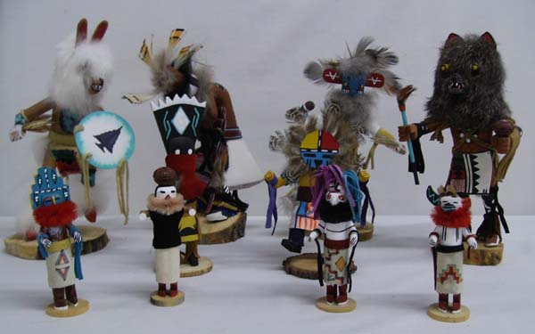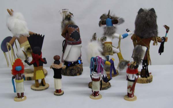 Large Collection Native American Navajo Kachinas. Some signed by the artist. Largest Kachina measures approx. 8 1/2''H x 4 1/2''W x 2 1/2''D. Removable head on some Kachinas. Some feather damage and broken pieces. Buyers Pay Actual Shipping and Handling Charges(see terms and conditions for more information).