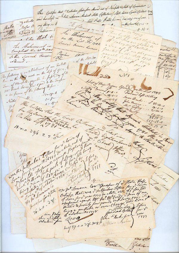 Lot of 16 Connecticut Abatement and Tax Documents. Colonial dates from the 1750’s to the early 1780’s manuscript documents, includes: 8 pp. folio Manuscript Document Signed, being an Abatement of Persons moved out of Norfolk and State of Connecticut, 1785, listing over twenty people, signed by three Justices of Peace and three selectmen. Many other Connecticut revolutionary names are included on documents that read, for example: “A list of those Person Absconded from the list 1783.” Plus several tax documents and other abatement documents, signed by Justices of the Peace and local selectmen. Towns include Fairfield, Salisbury, Colchester, Hebron, Mansfield, Lyme, etc. All VG or better. A nice collection.