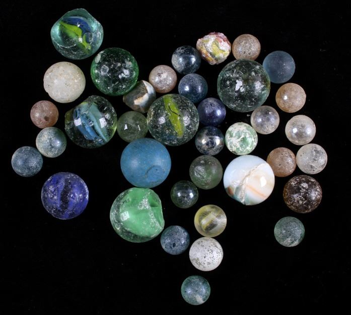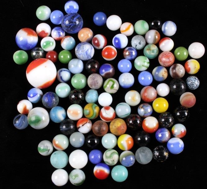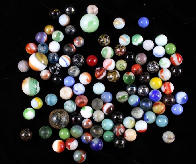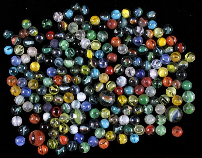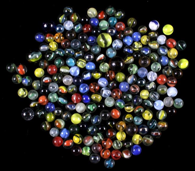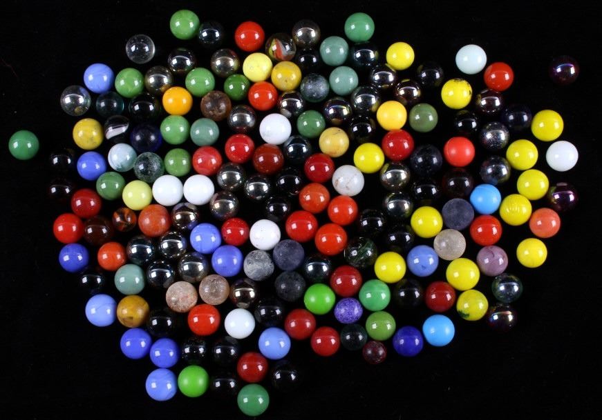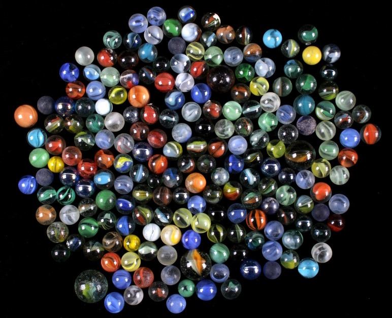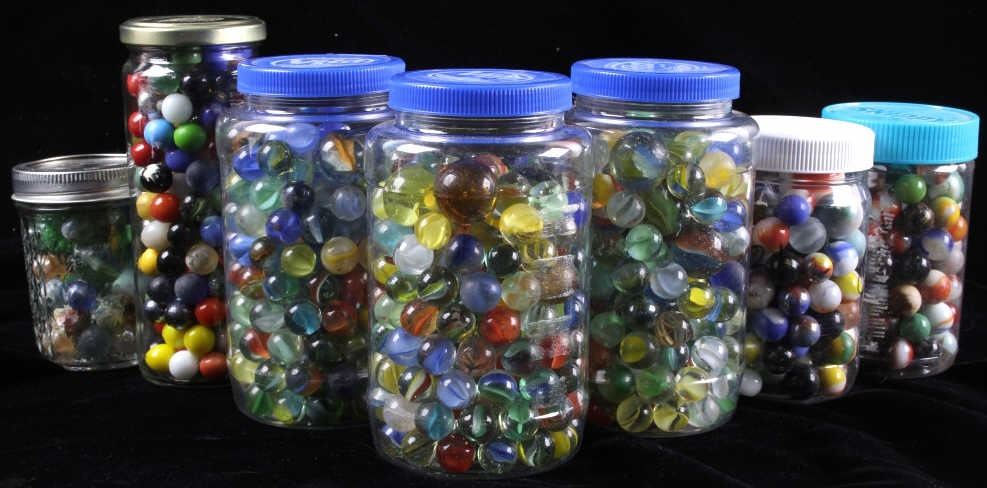 This lot features seven jars full of marbles. The jars contains marbles of various sizes, from .5" to over 1". They are multiple variations of solid, swirl, and many other styles of marbles. This large group is a great addition to any marble collection. The marbles show good to fair condition.