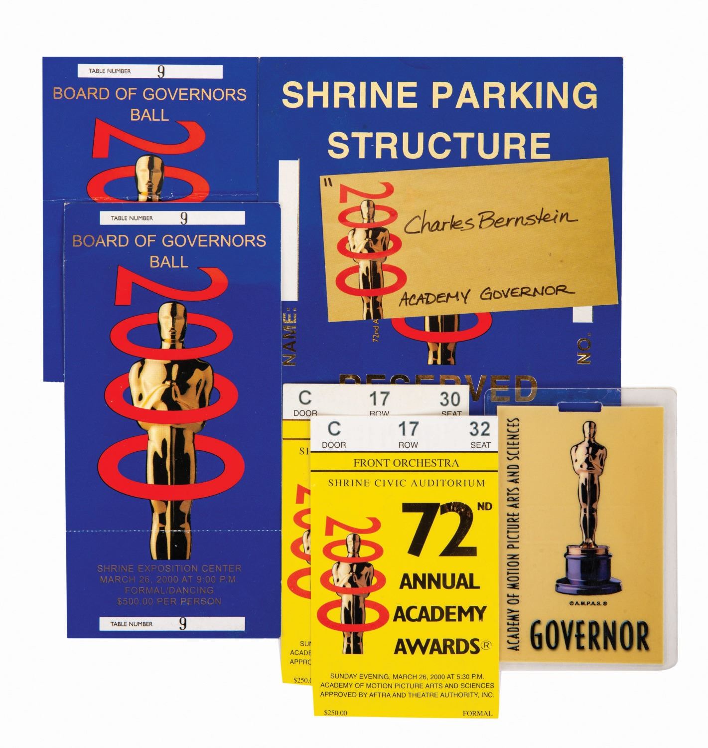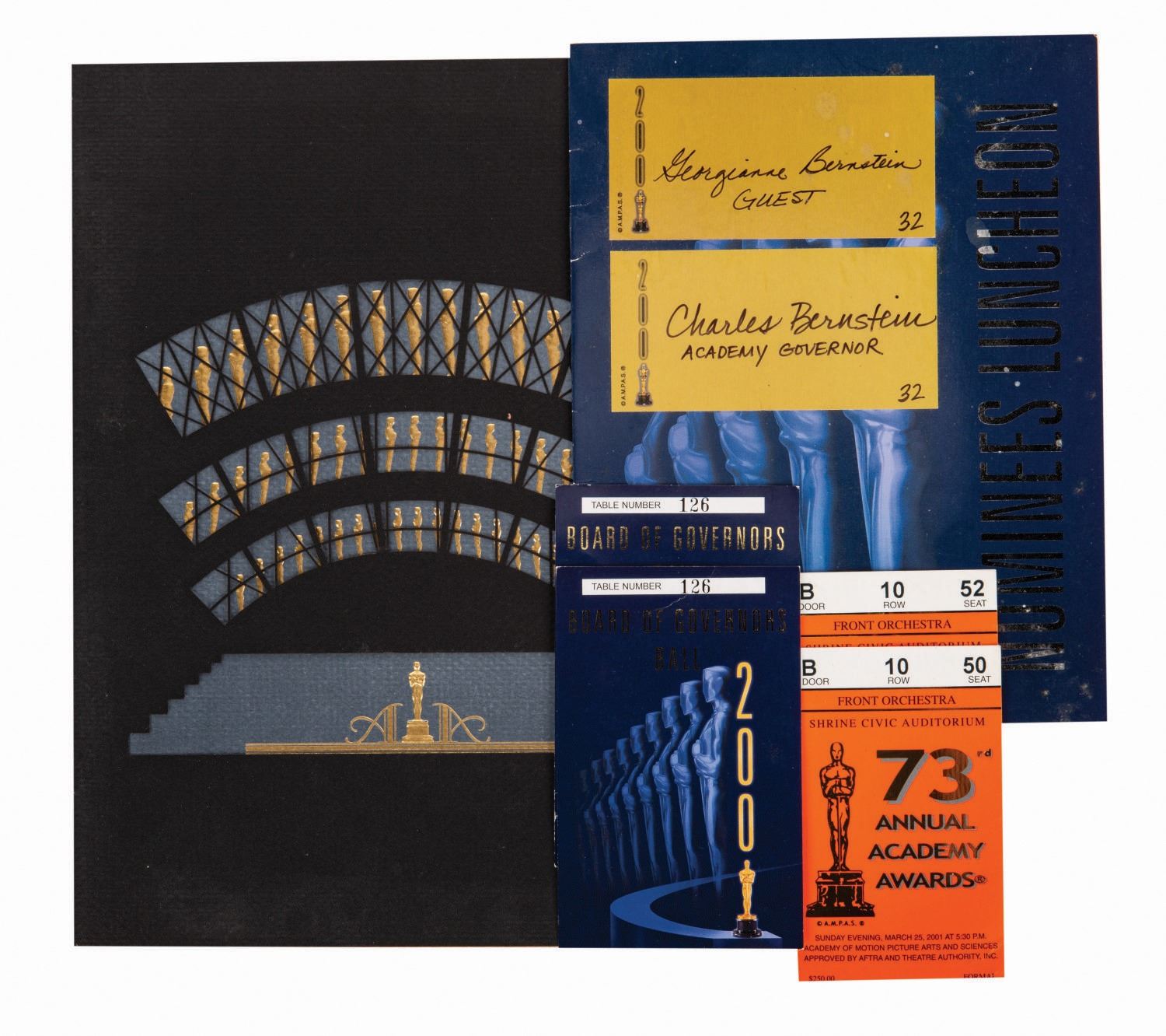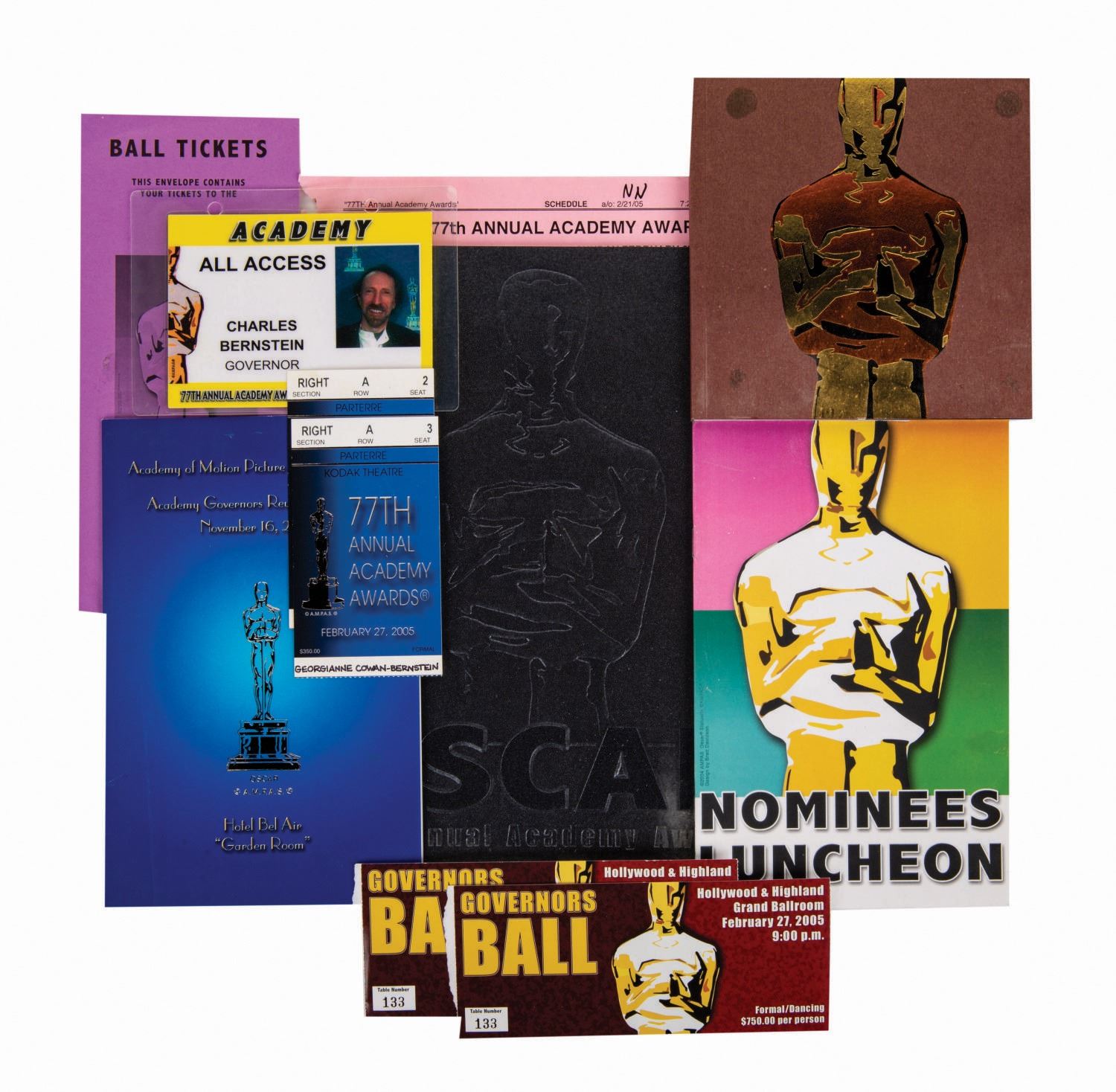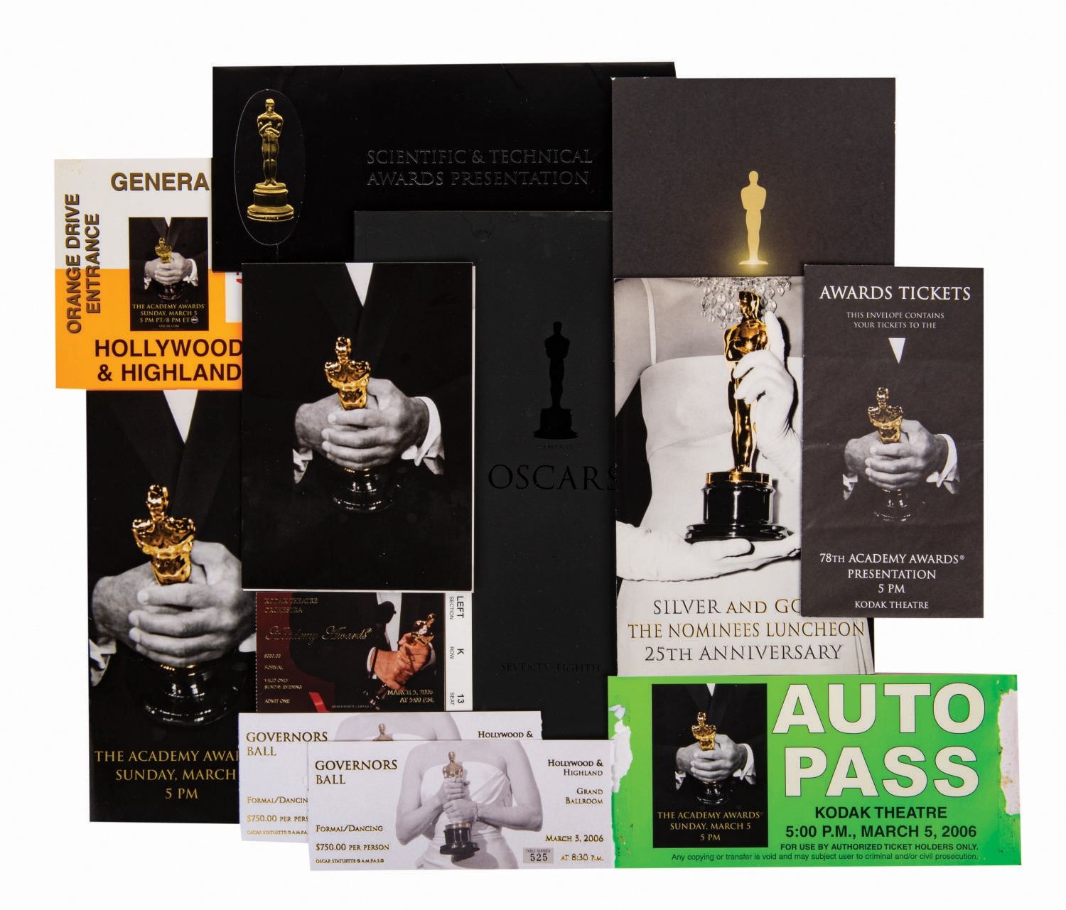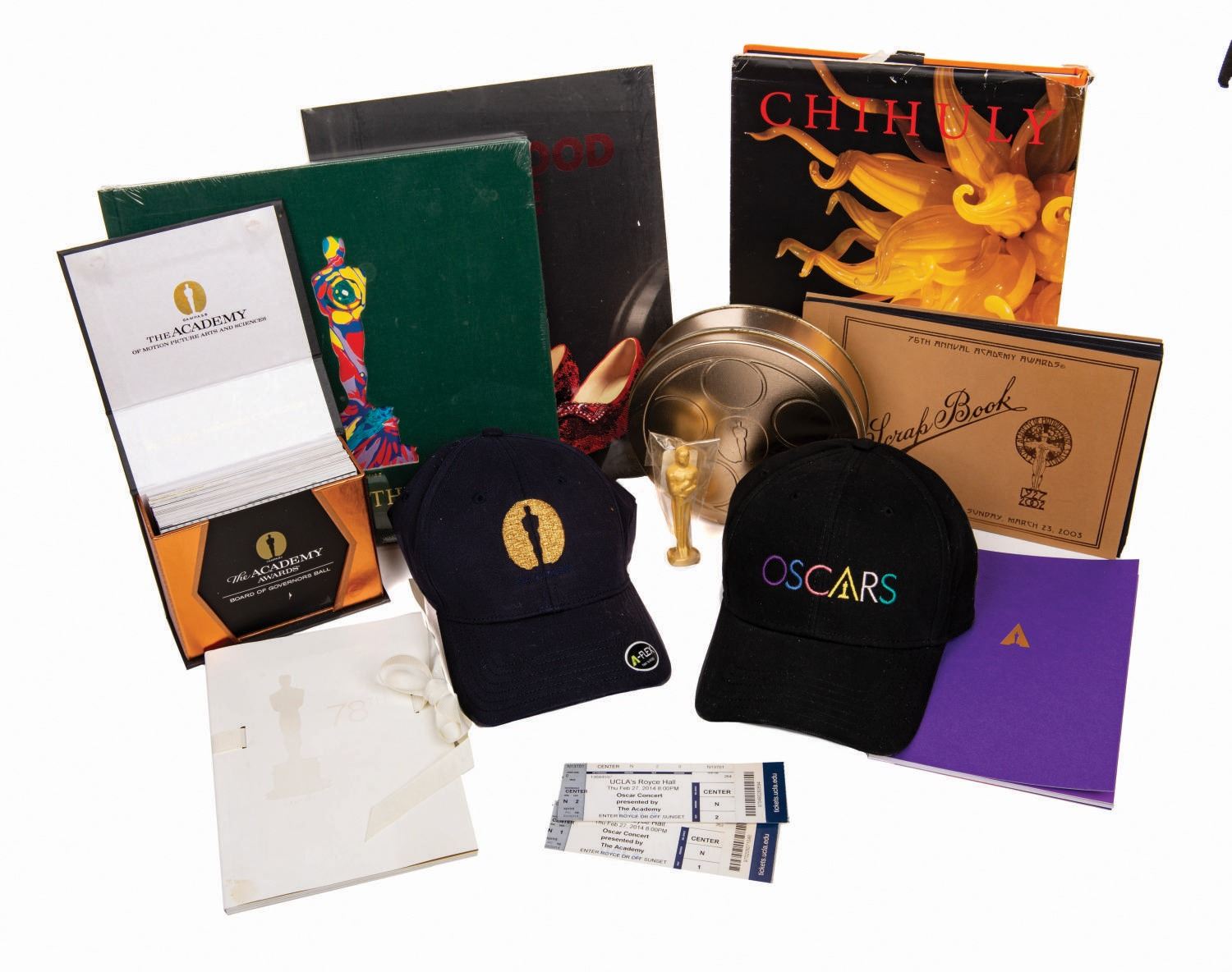 (AMPAS, 1985-2021) A large collection of Academy Awards memorabilia. Including ticket stubs, programs, notepads, table cards, film guides, a jacket, a sweatshirt, baseball caps, coins, pencils, posters, rare books, and more. Spanning over 25 years, this collection offers a glimpse into the Oscar experience for attendees and showcases the range of materials prepared for Hollywood's biggest night. The clothing are size S, while the other pieces range from the 1.5" diameter coins to the 40"x27" poster. The items are in good to fine condition with wear from use and storage. A couple of the parking stickers have lost their backing and adhered to other items.