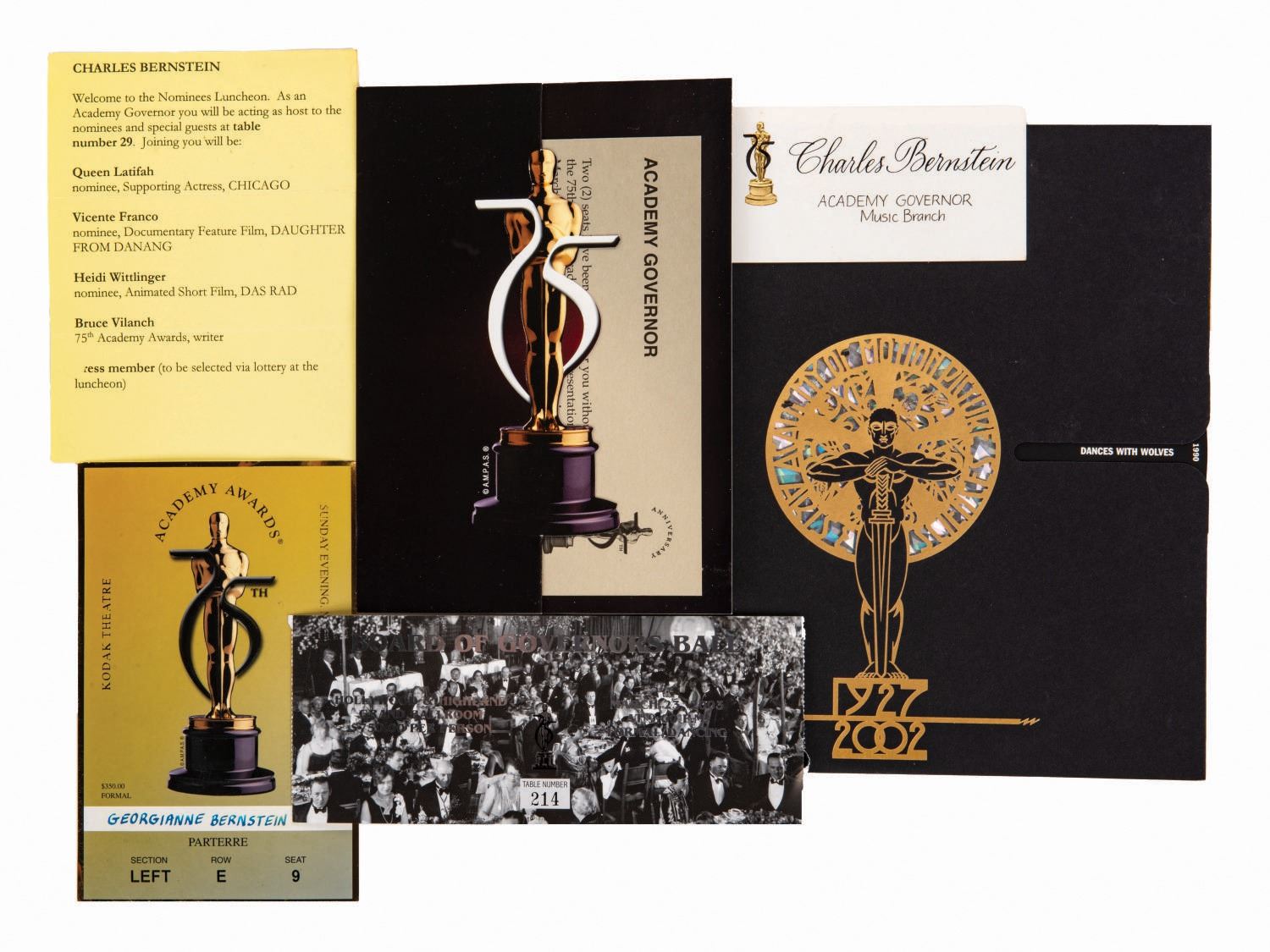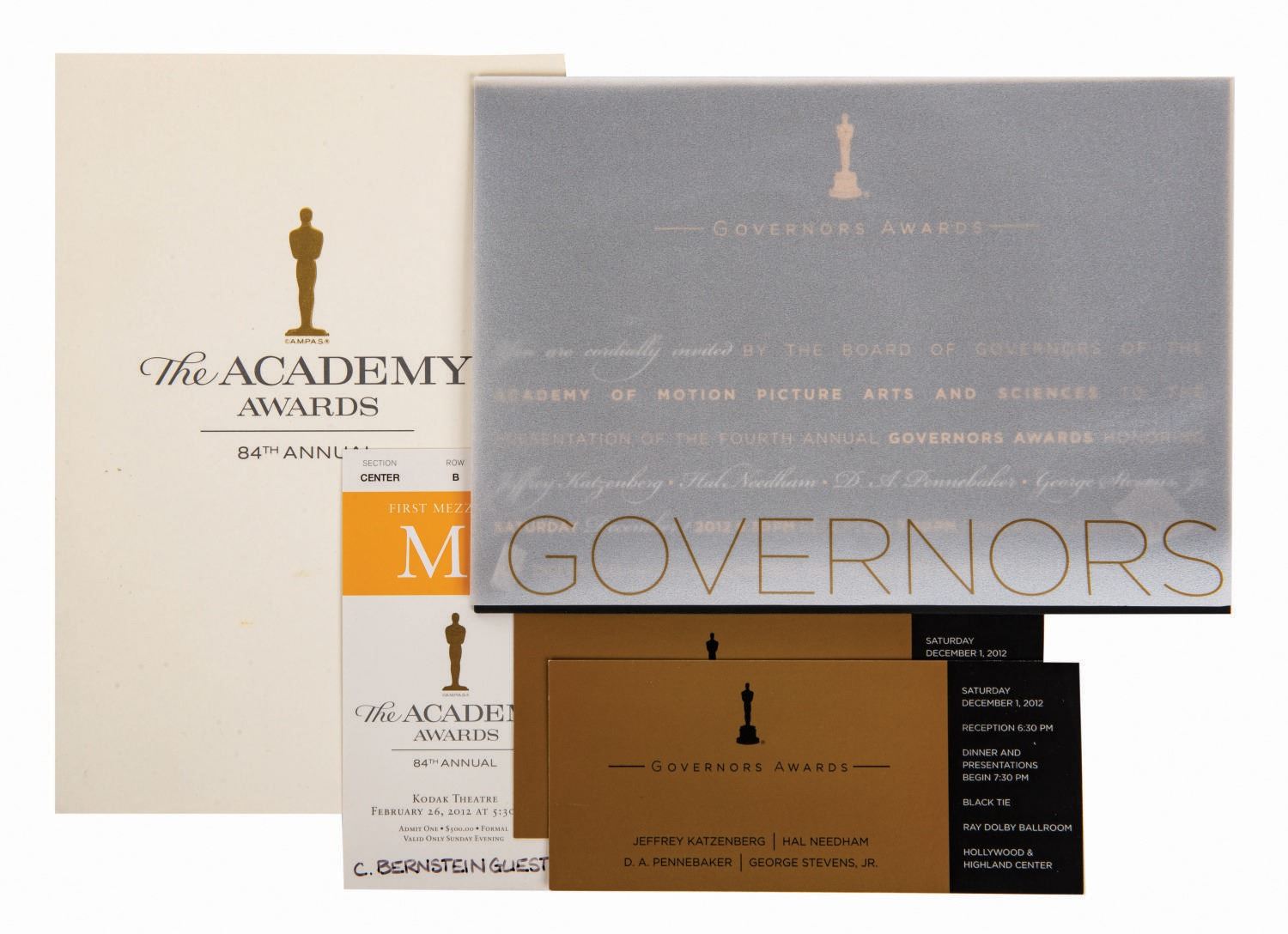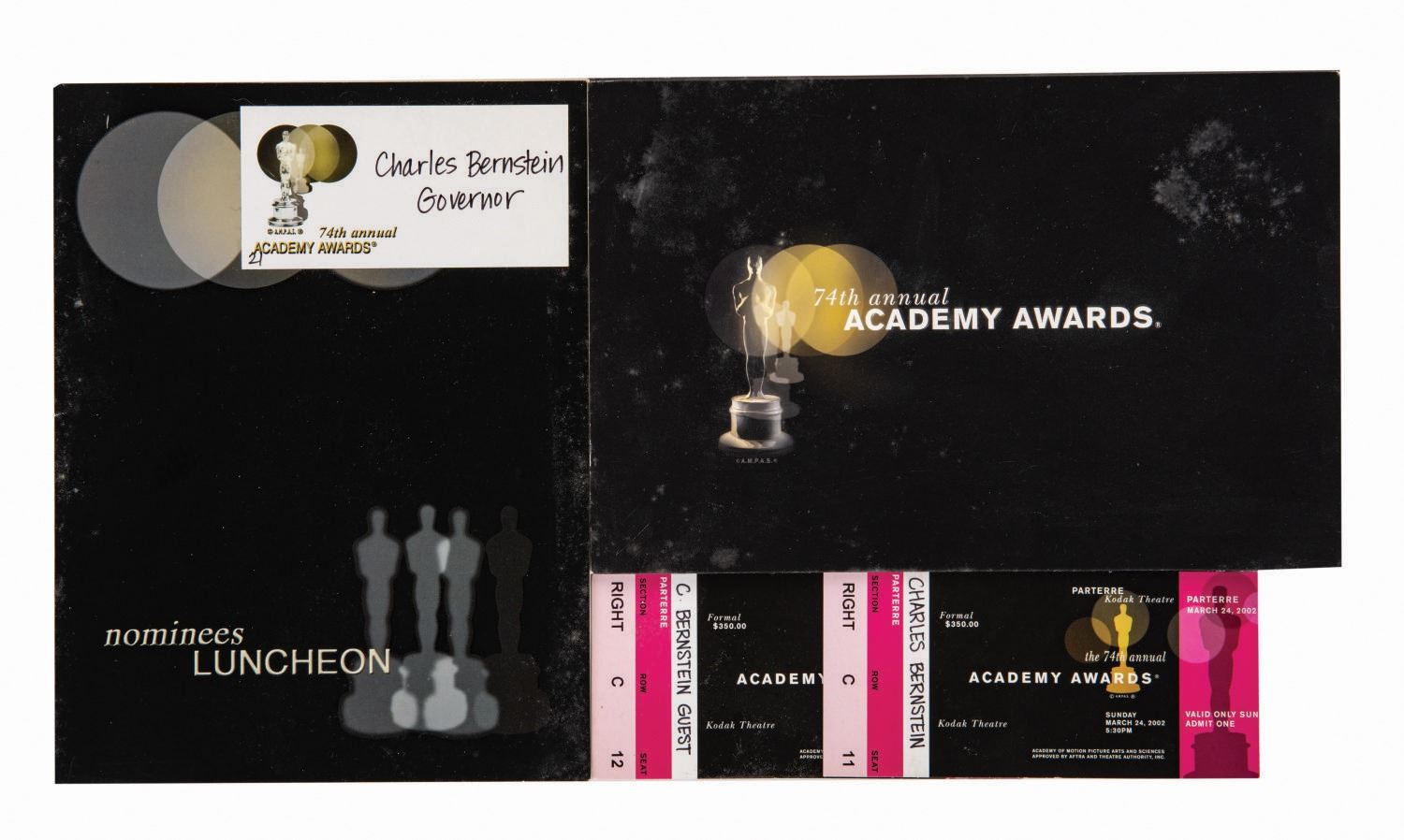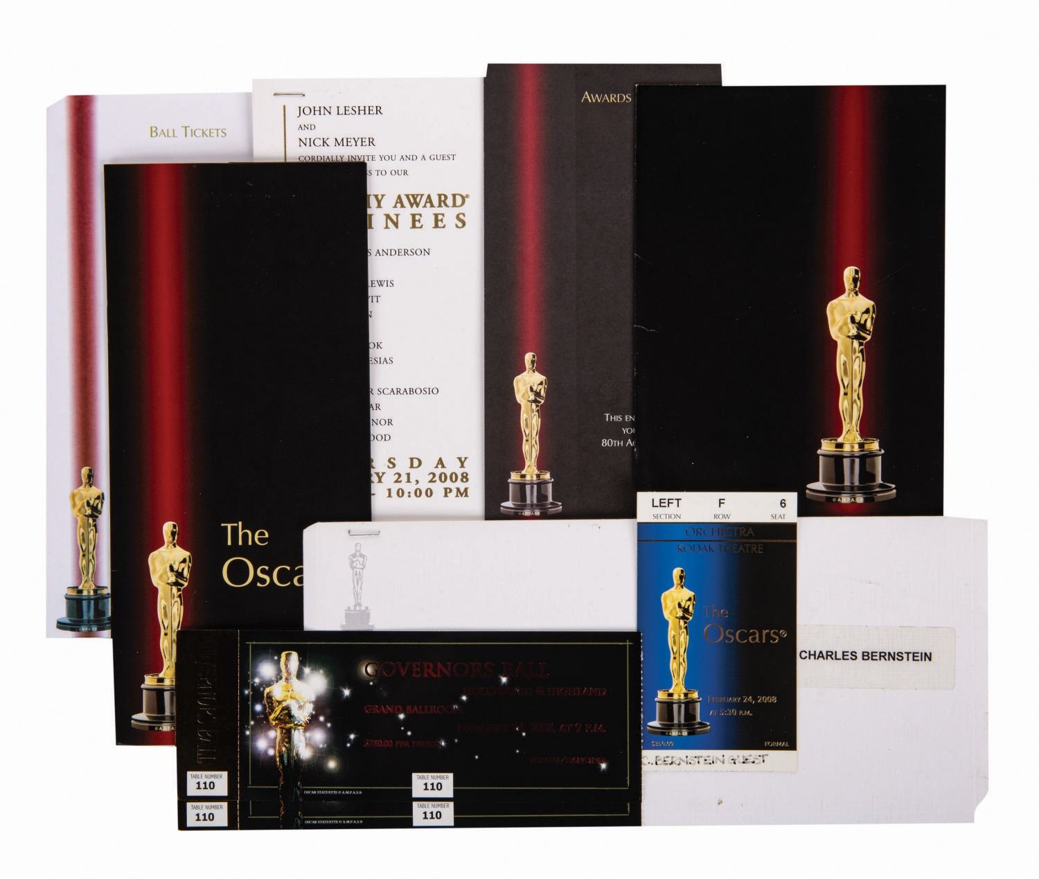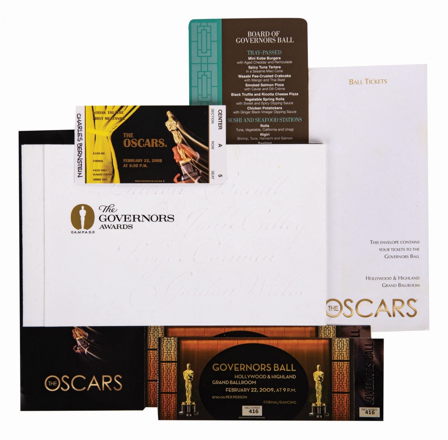 (AMPAS, 1985-2021) A large collection of Academy Awards memorabilia. Including ticket stubs, programs, notepads, table cards, film guides, a jacket, a sweatshirt, baseball caps, coins, pencils, posters, rare books, and more. Spanning over 25 years, this collection offers a glimpse into the Oscar experience for attendees and showcases the range of materials prepared for Hollywood's biggest night. The clothing are size S, while the other pieces range from the 1.5" diameter coins to the 40"x27" poster. The items are in good to fine condition with wear from use and storage. A couple of the parking stickers have lost their backing and adhered to other items.
