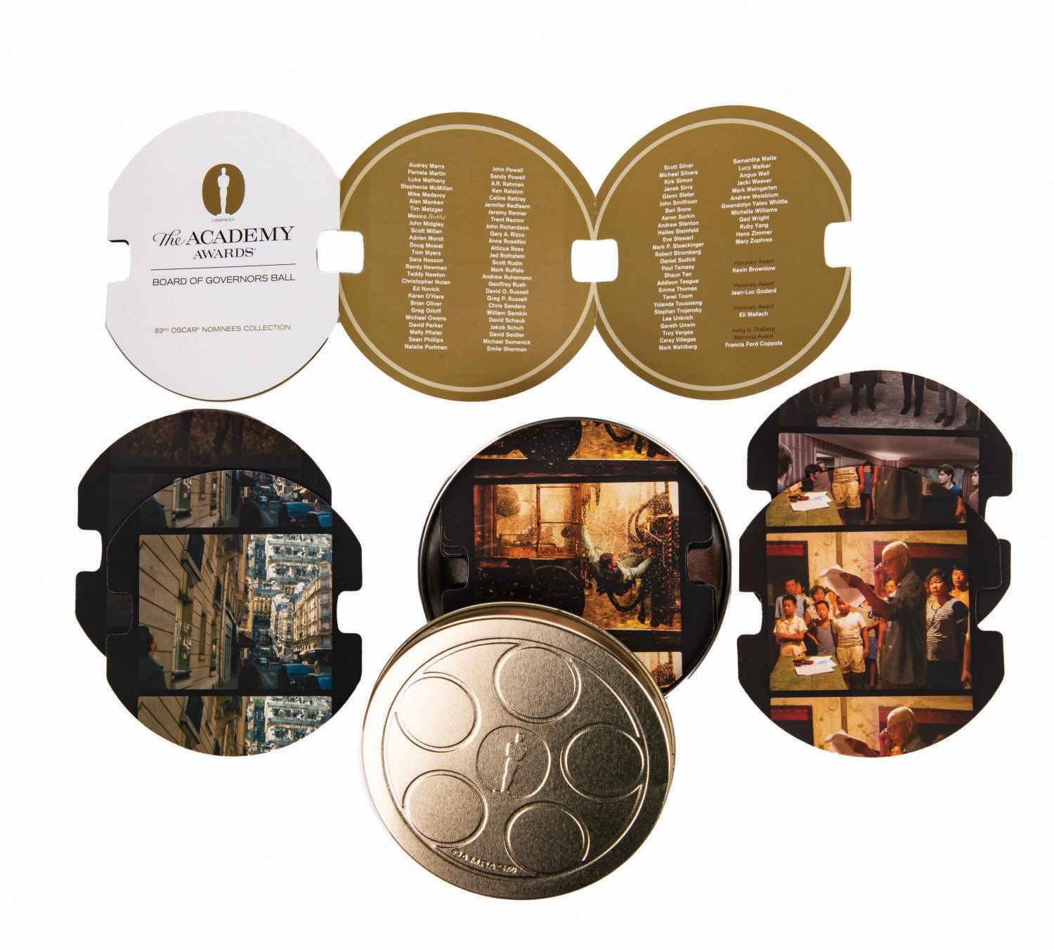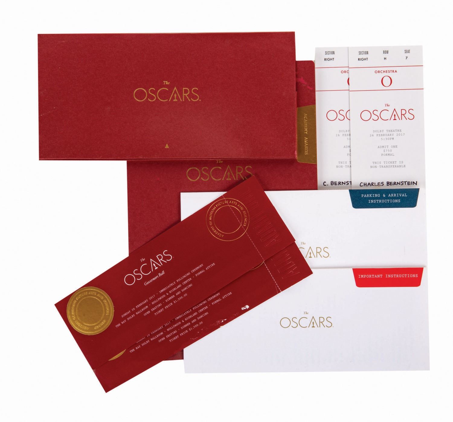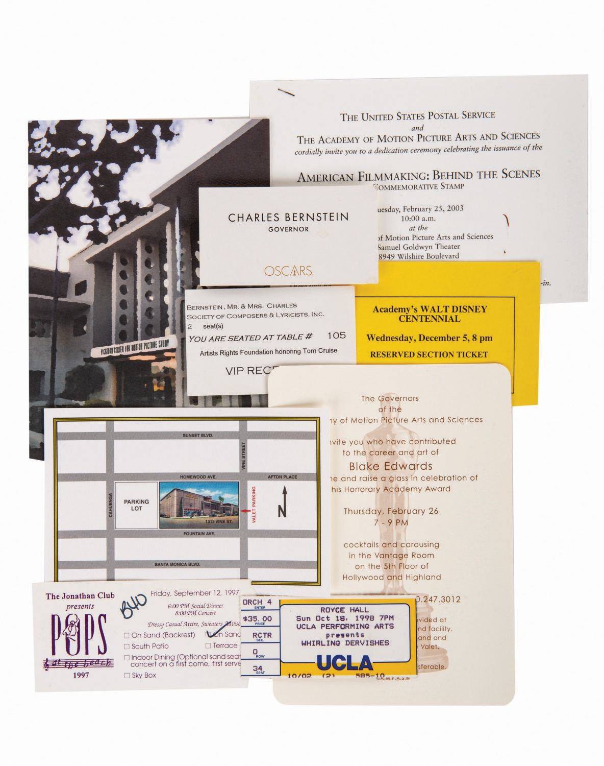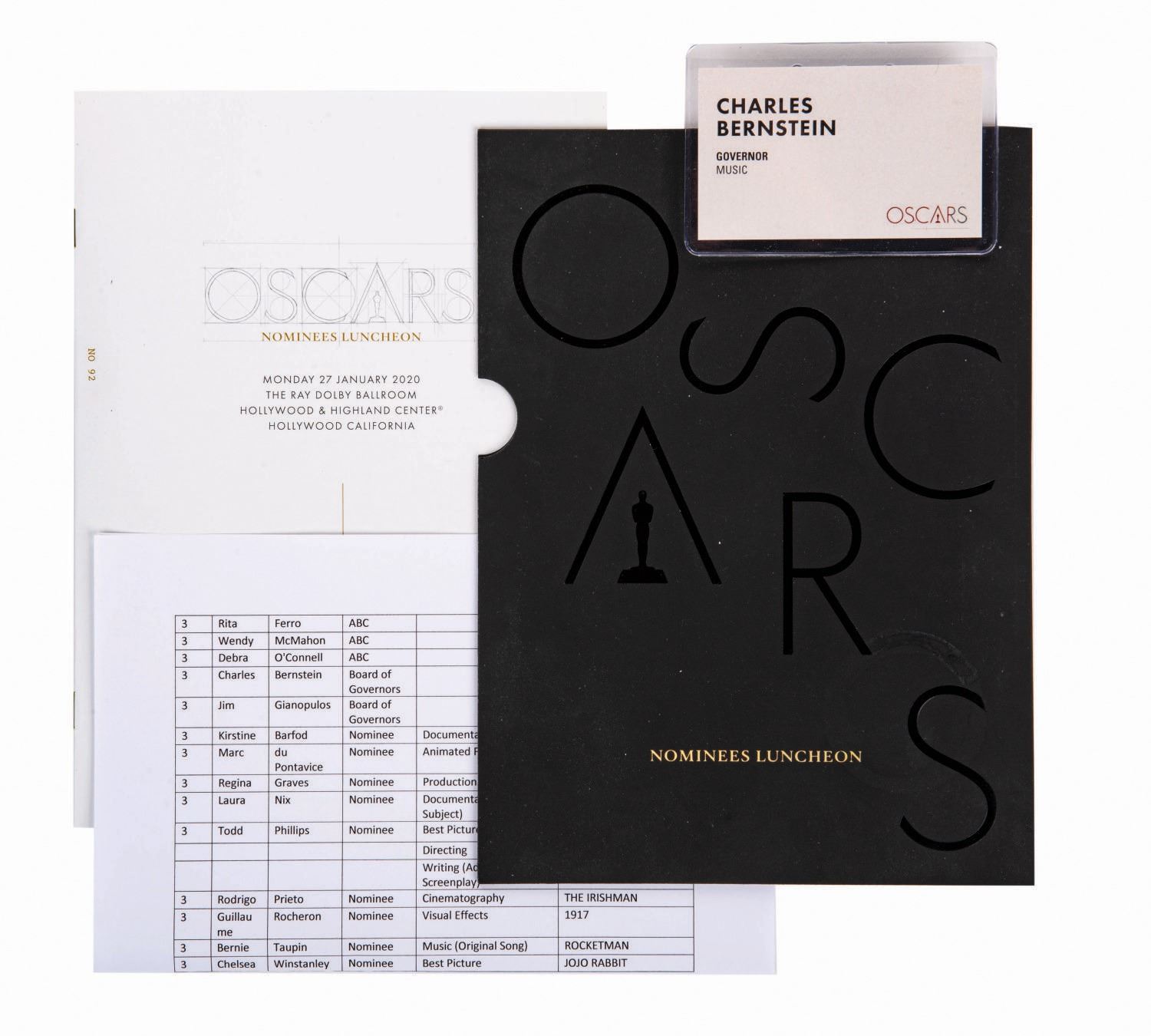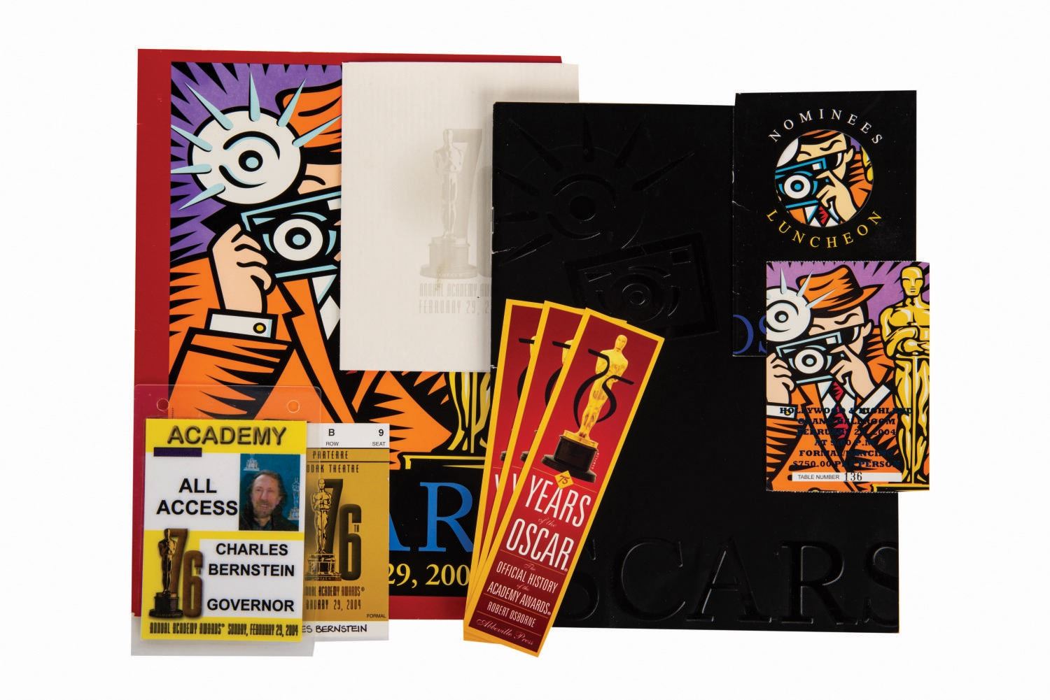 (AMPAS, 1985-2021) A large collection of Academy Awards memorabilia. Including ticket stubs, programs, notepads, table cards, film guides, a jacket, a sweatshirt, baseball caps, coins, pencils, posters, rare books, and more. Spanning over 25 years, this collection offers a glimpse into the Oscar experience for attendees and showcases the range of materials prepared for Hollywood's biggest night. The clothing are size S, while the other pieces range from the 1.5" diameter coins to the 40"x27" poster. The items are in good to fine condition with wear from use and storage. A couple of the parking stickers have lost their backing and adhered to other items.
