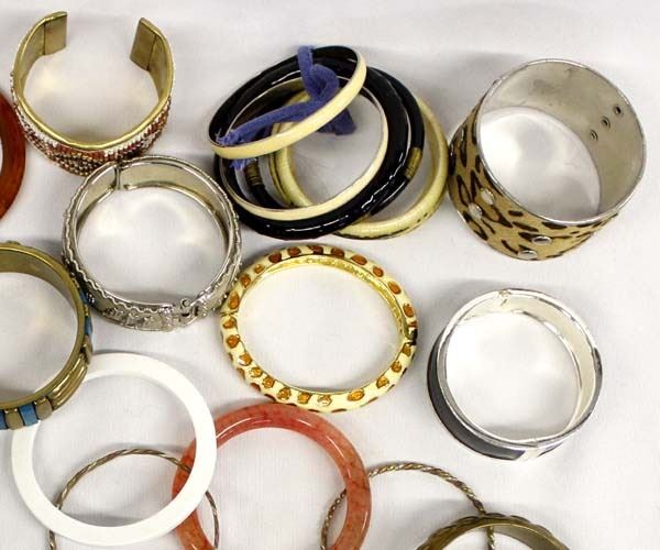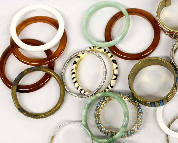 Large Collection of Estate Bangle Bracelets, includes bamboo, faux fur, brass and beadwork, brass, jadeite, enamelware, various metals, plastic, lacquerware, rhinestone, agate, wood, and shell, approximately 49 in all