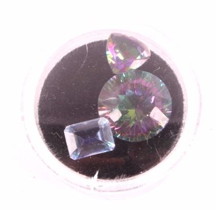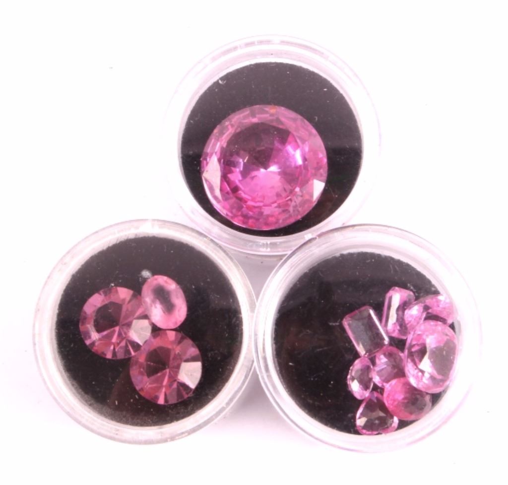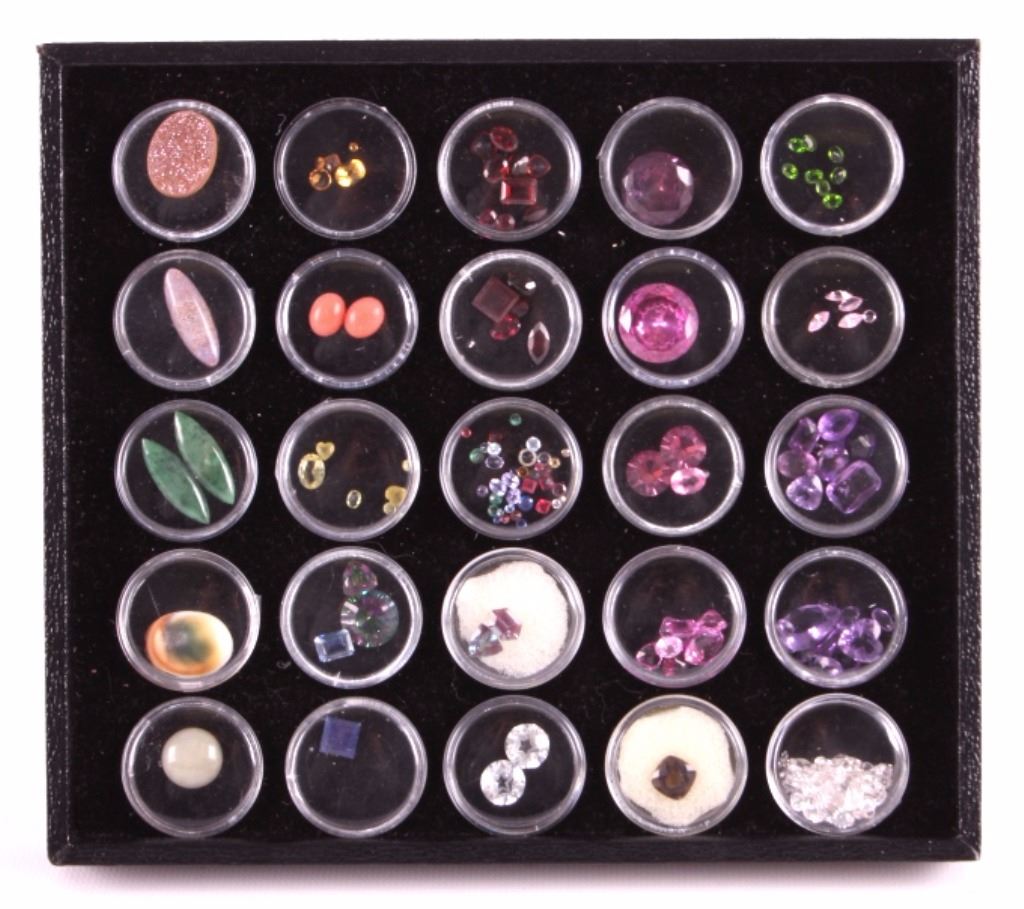 This is a large estate collection of faceted and cabochon precious and semi-precious stones. Included in this collection are garnets, amethyst, pink topaz, Alexandrite, sapphire, smoky quartz, green garnet, pink coral, peridot, citrine, jade, and more. All the stones are in good condition. A great addition to any collection. The display box measures 7.25" x 8.25".