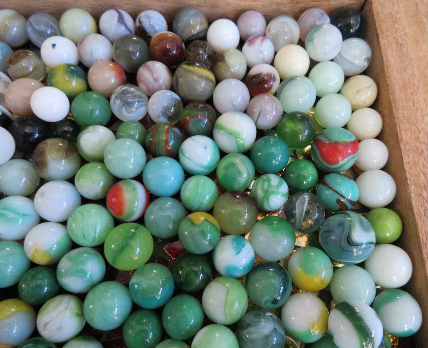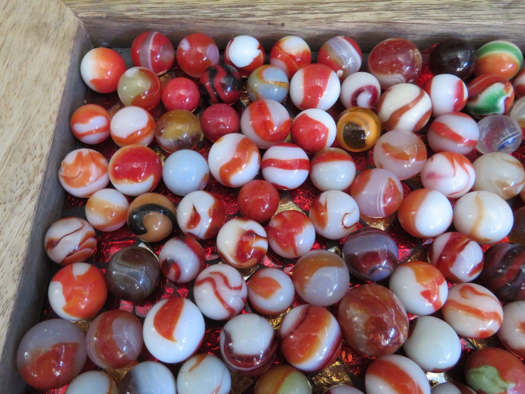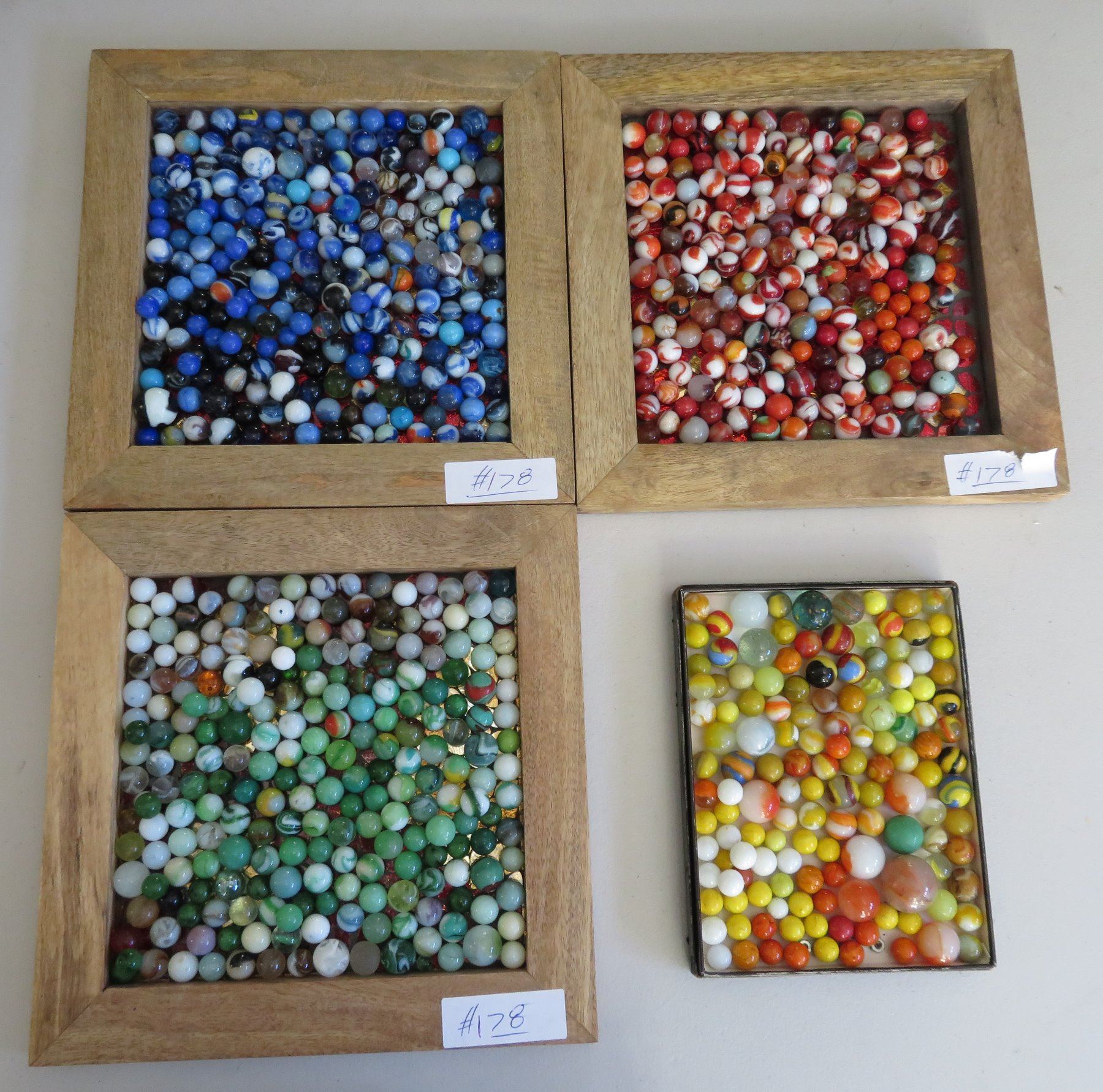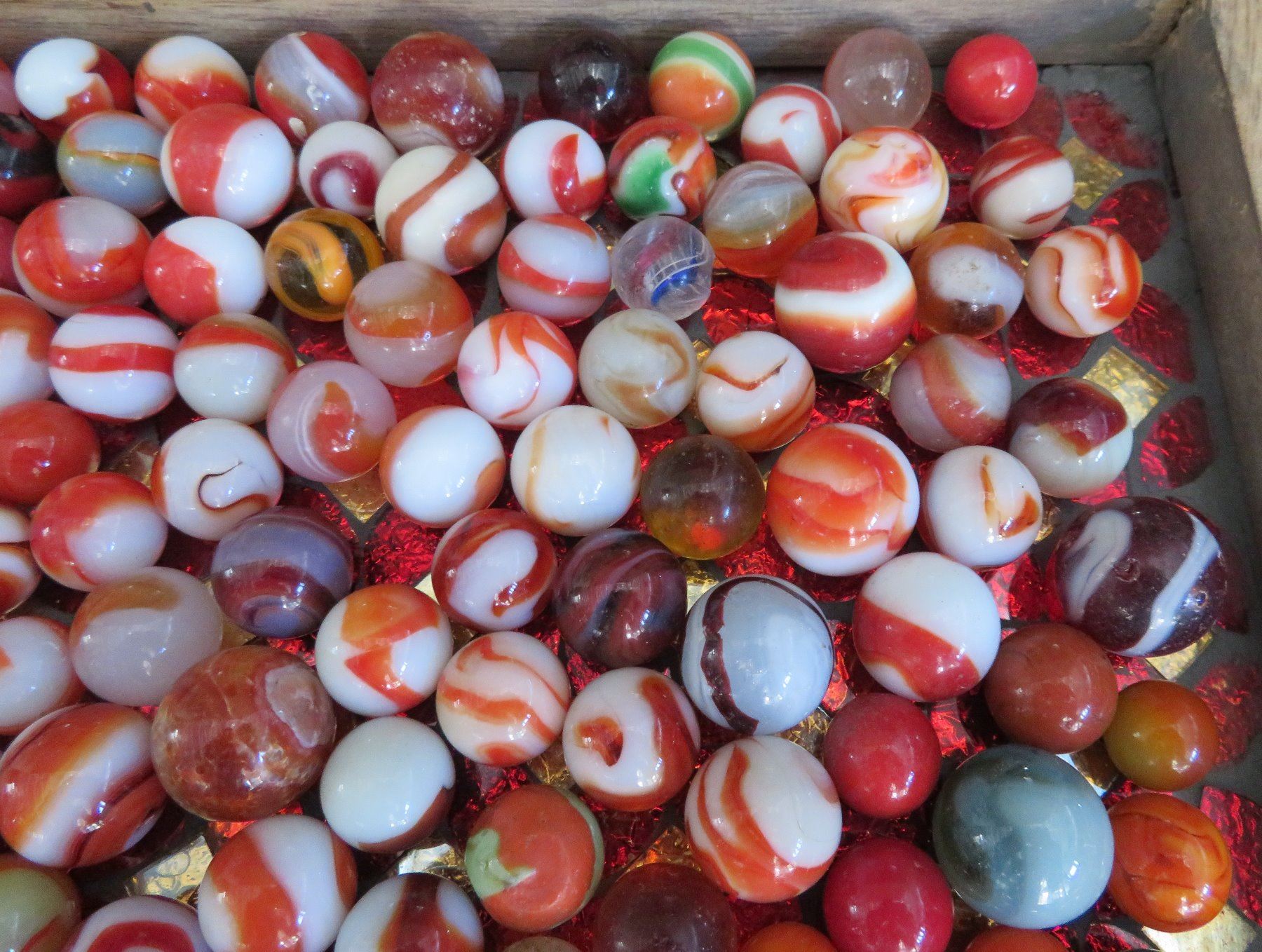 Large Collection of Marbles, c. 1900-40s. Made of glass and agate, the largest is 1 1/8". USA. Hundreds of marbles, frames not included. Condition: Good, some minor nicks, see images. Shipping: $50.00 w/insurance and signature, due to weight.