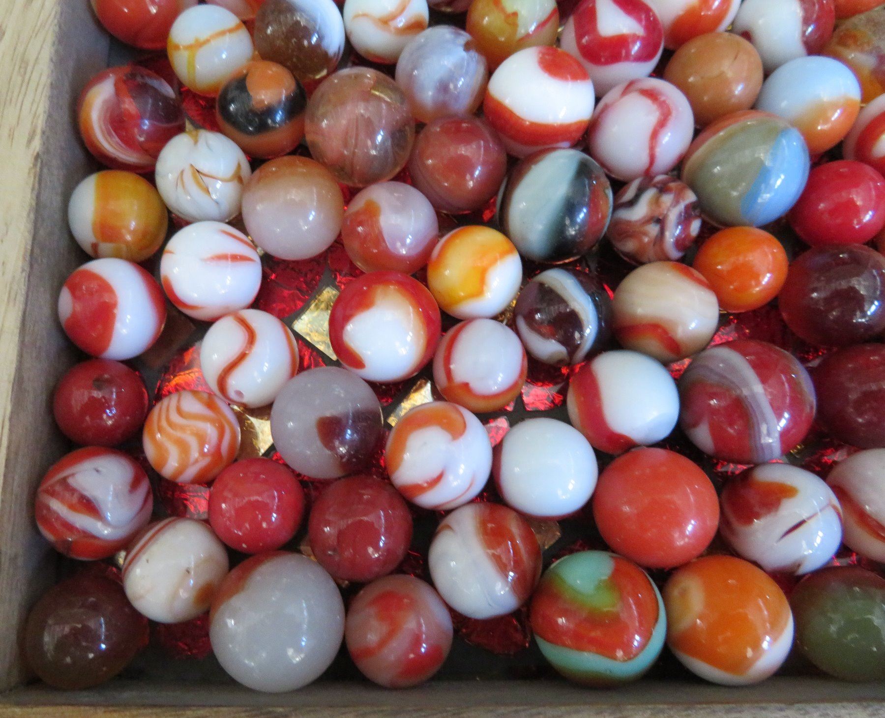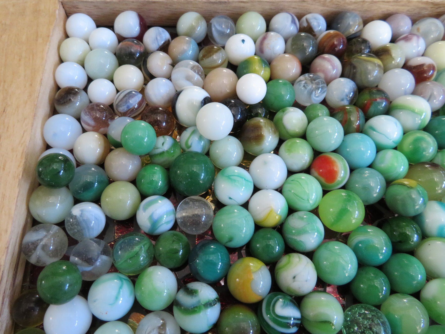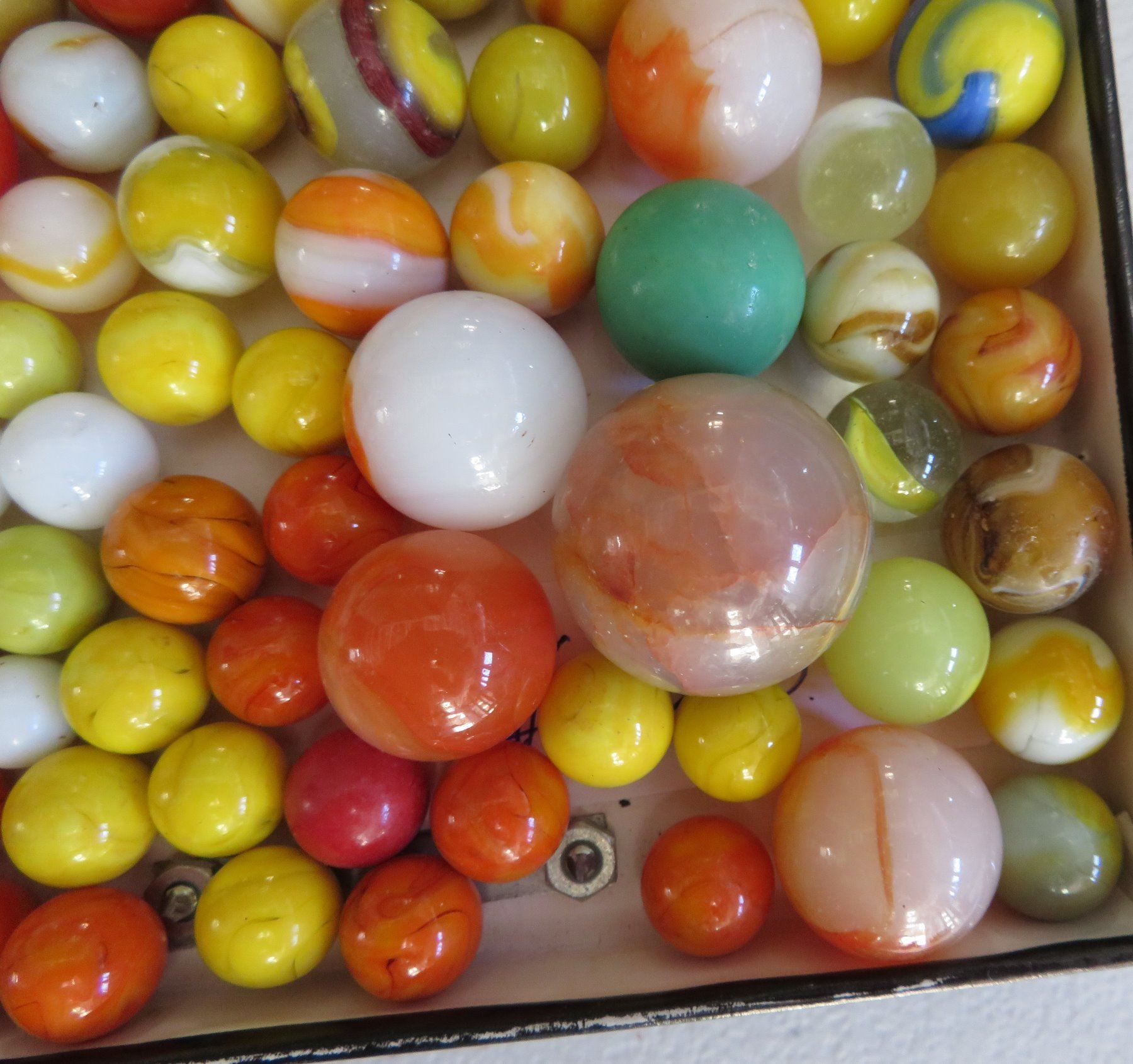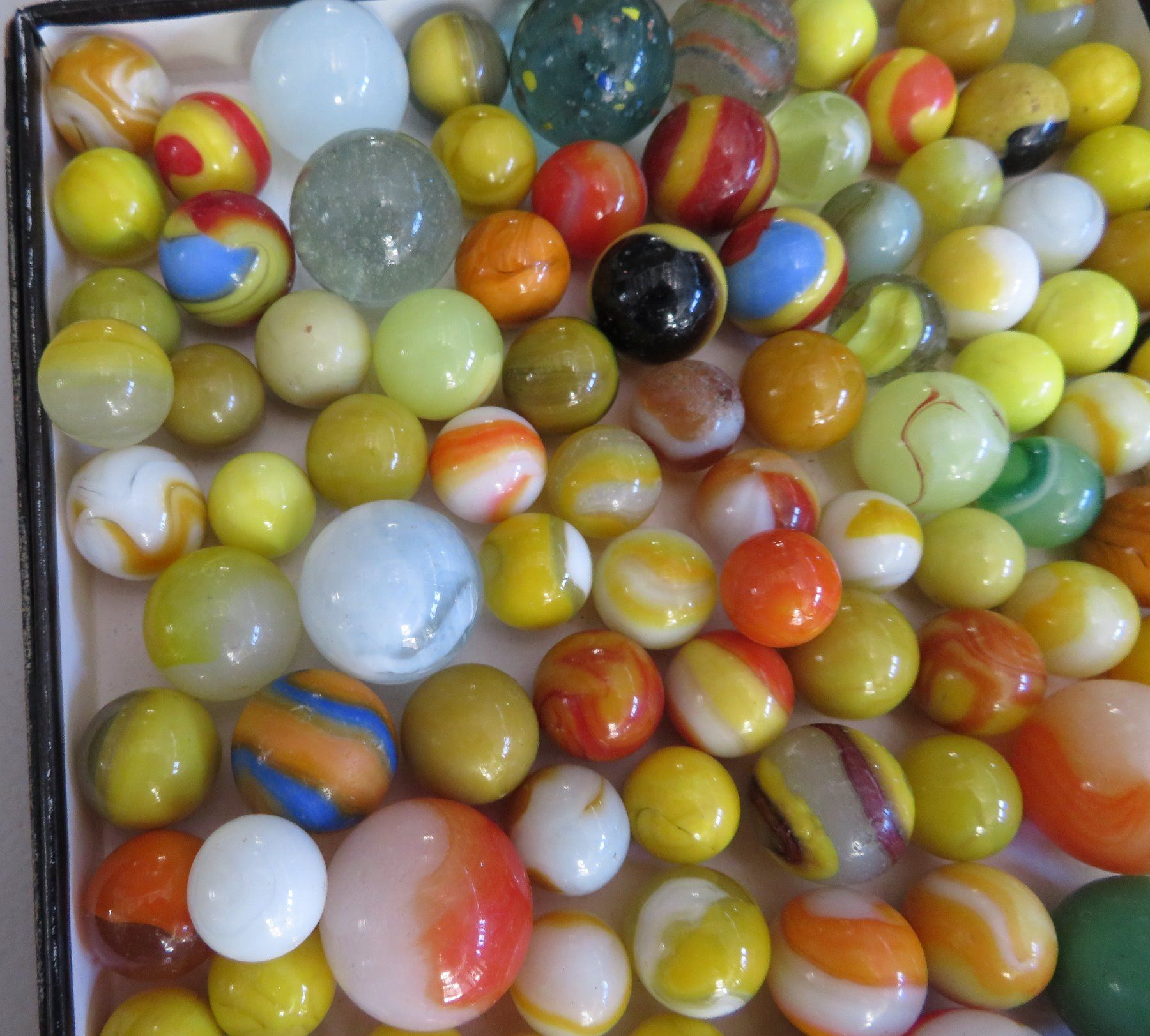 Large Collection of Marbles, c. 1900-40s. Made of glass and agate, the largest is 1 1/8". USA. Hundreds of marbles, frames not included. Condition: Good, some minor nicks, see images. Shipping: $50.00 w/insurance and signature, due to weight.