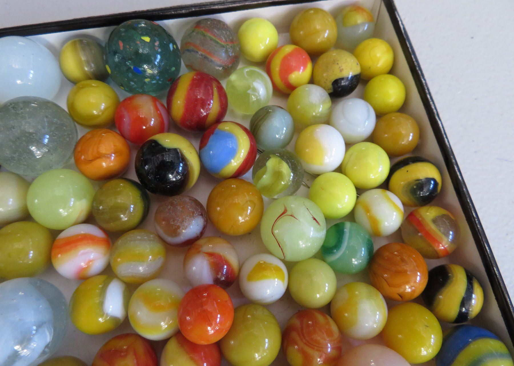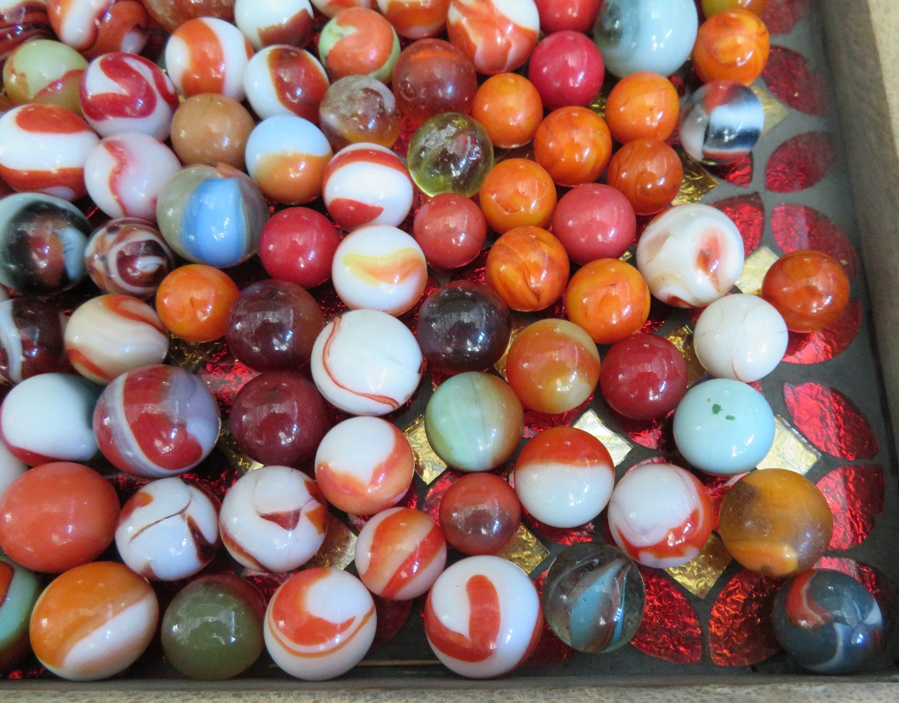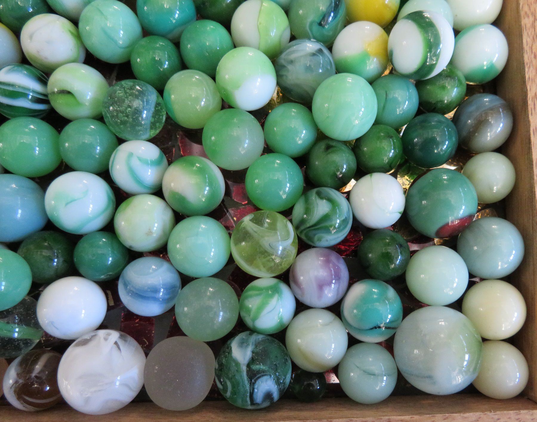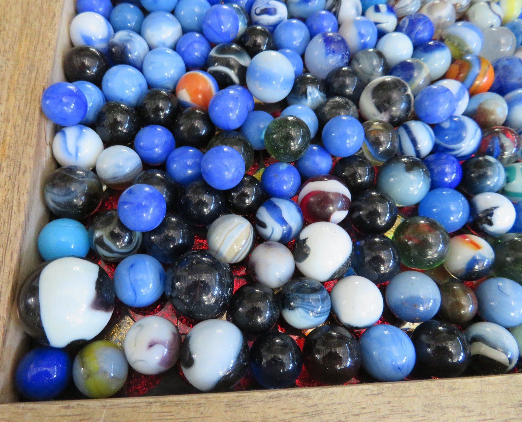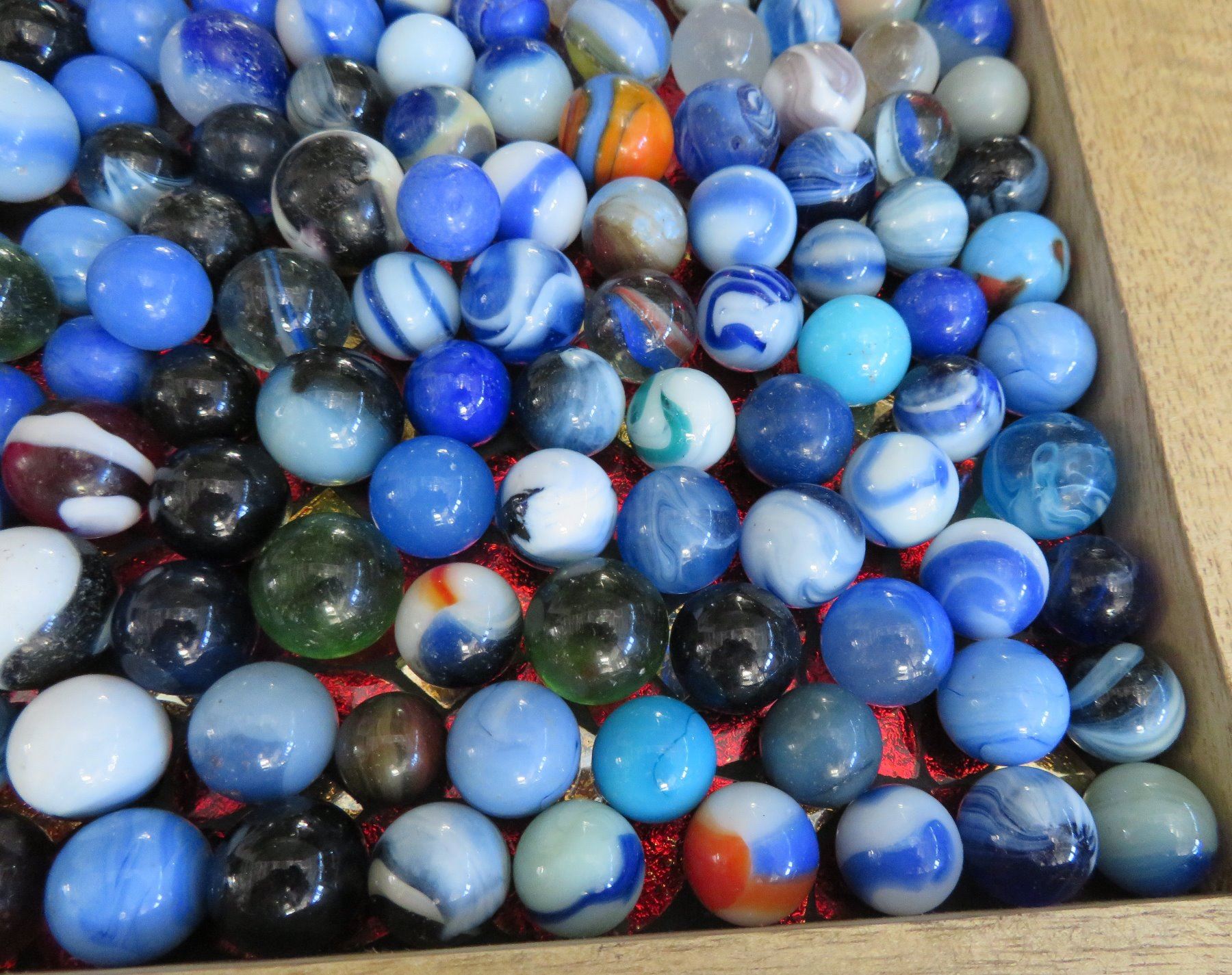 Large Collection of Marbles, c. 1900-40s. Made of glass and agate, the largest is 1 1/8". USA. Hundreds of marbles, frames not included. Condition: Good, some minor nicks, see images. Shipping: $50.00 w/insurance and signature, due to weight.