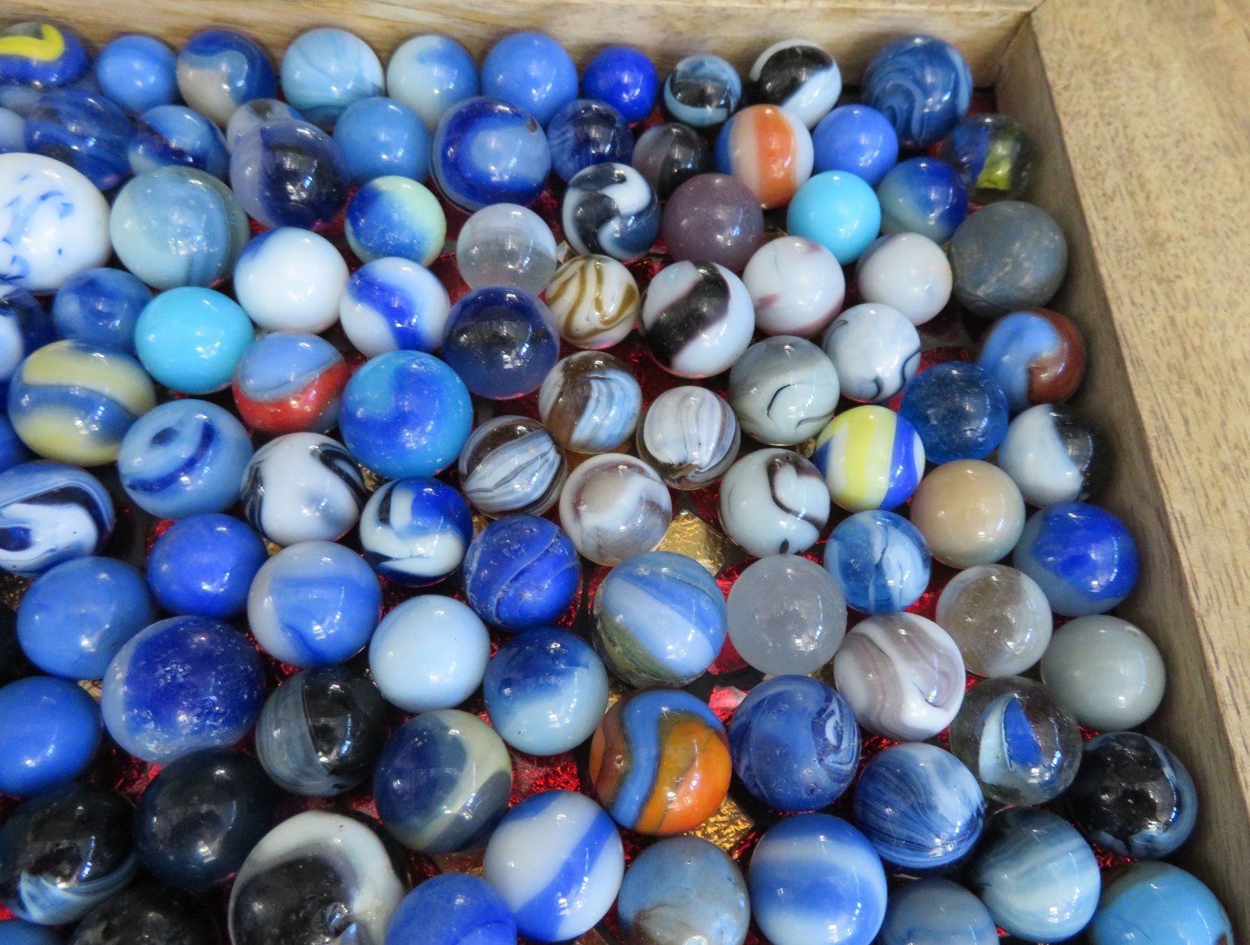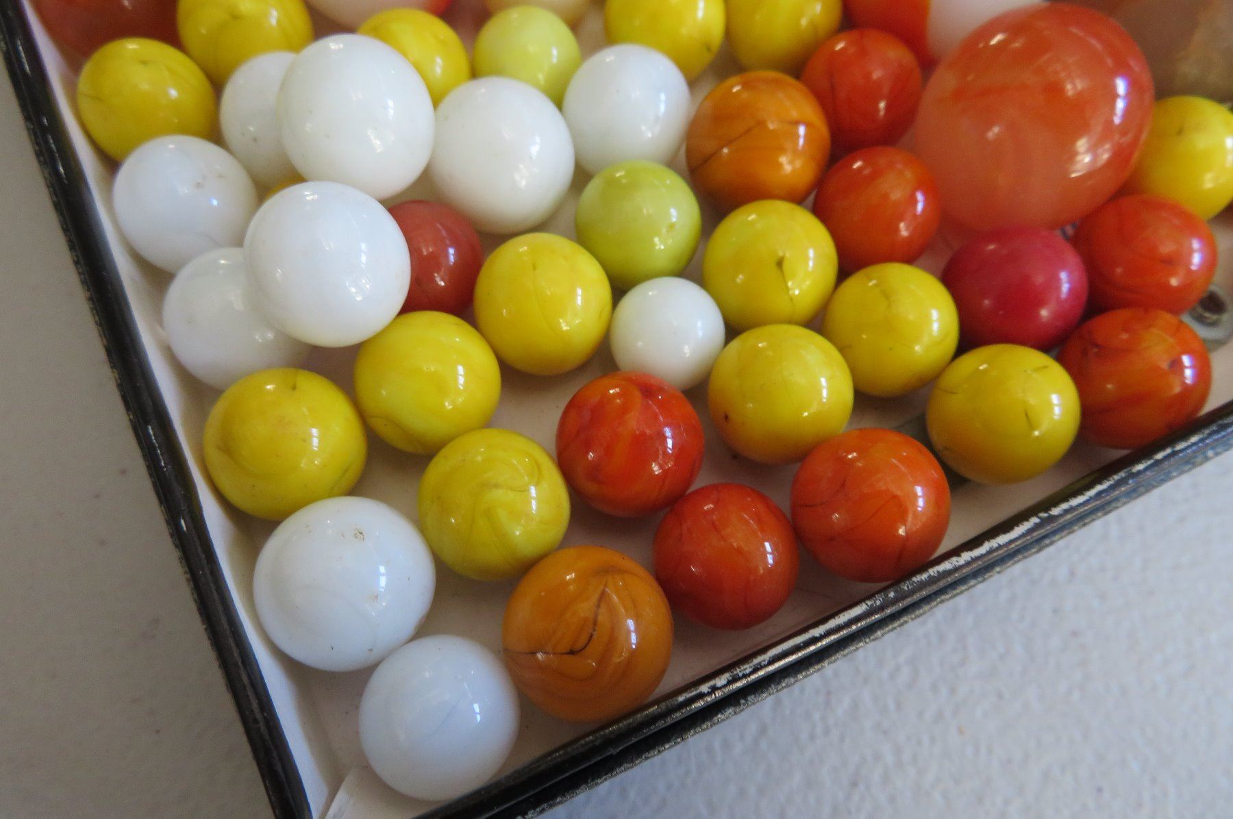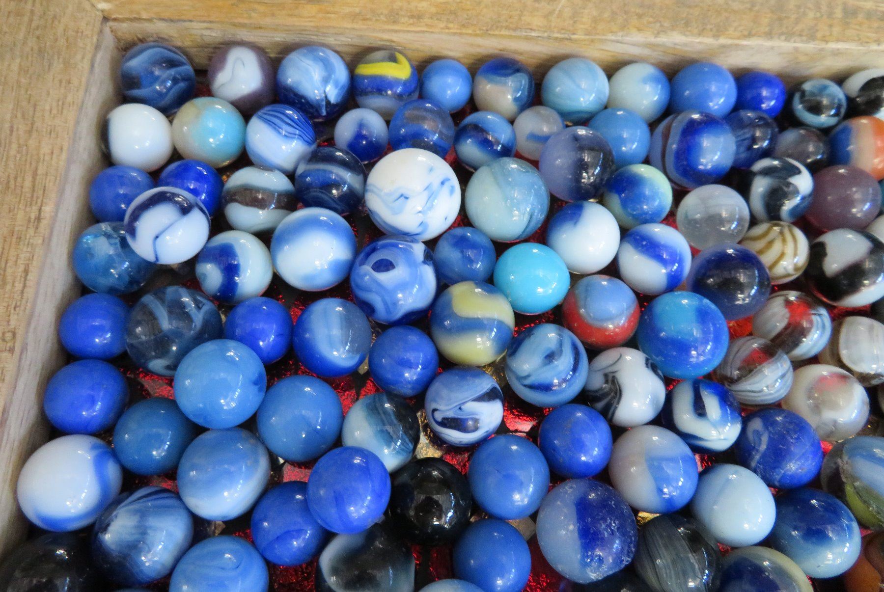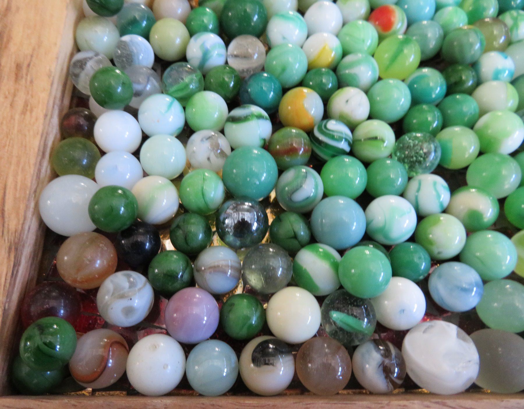 Large Collection of Marbles, c. 1900-40s. Made of glass and agate, the largest is 1 1/8". USA. Hundreds of marbles, frames not included. Condition: Good, some minor nicks, see images. Shipping: $50.00 w/insurance and signature, due to weight.