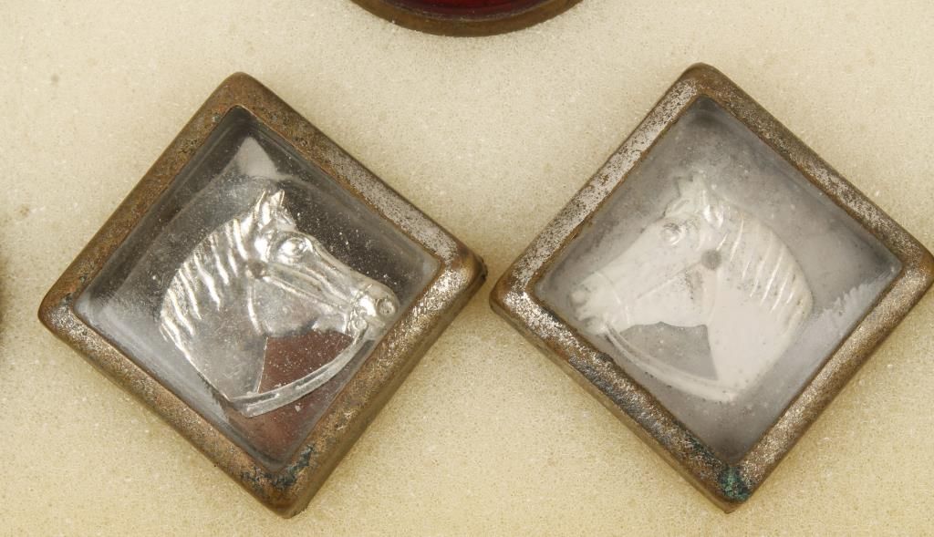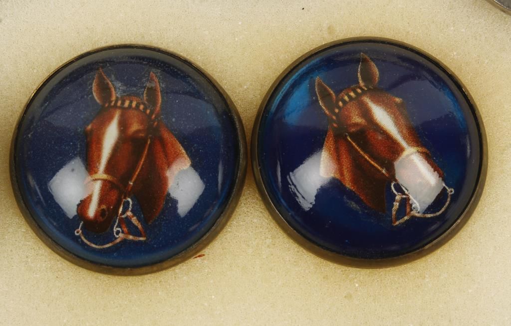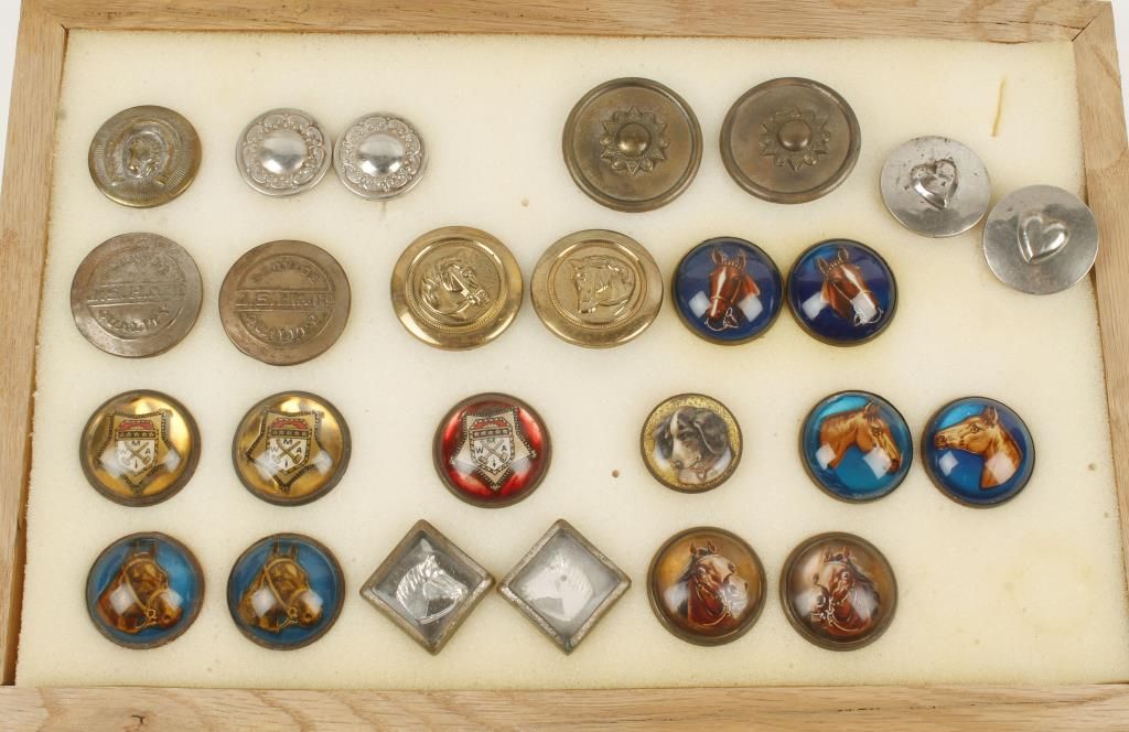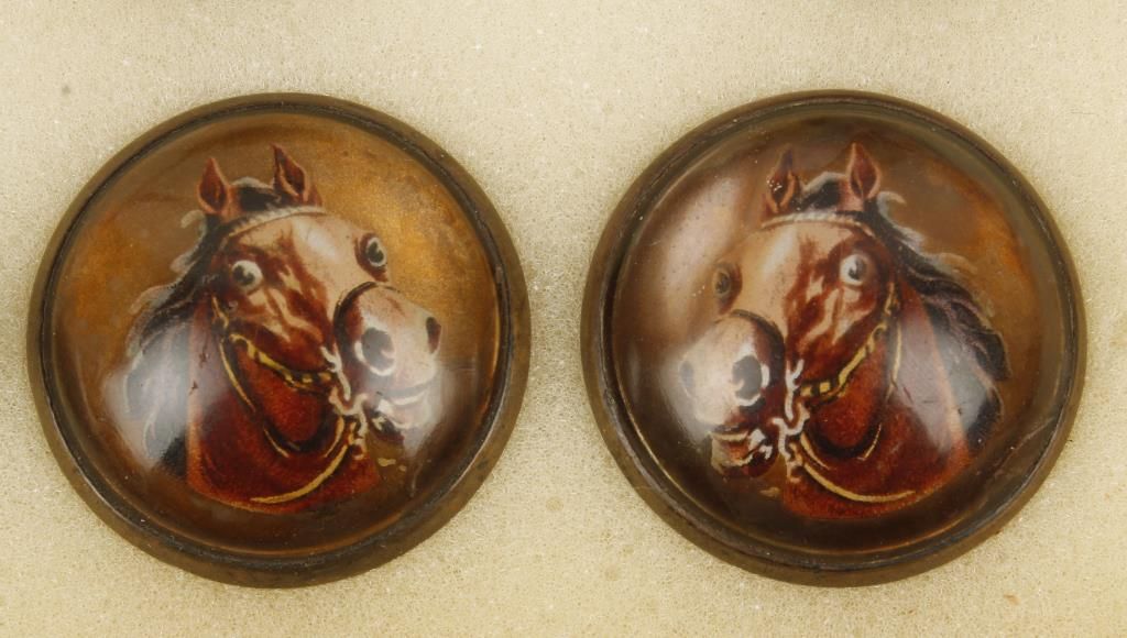 11 pairs and 3 singles. Several of which are the horse head glass type. Hearts, scroll design, and others. Circa 1860's thru 1940's. In case.