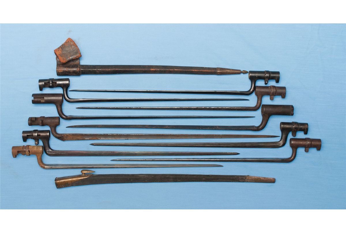 1) 20 inch blade. 2) 19 1/2 inch blade. 3) 18 1/2 inch blade. 4) 20 inch blade. 5) 18 1/2 inch blade. 6) 18 1/2 inch blade. 7) 18 1/2 inch blade. 8) 23 inch blade. 9) 19 1/2 inch blade. 10) 18 1/2 inch blade. 2 leather scabbards. CONDITION: Fair or better overall with wear and tear on leather