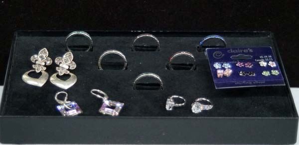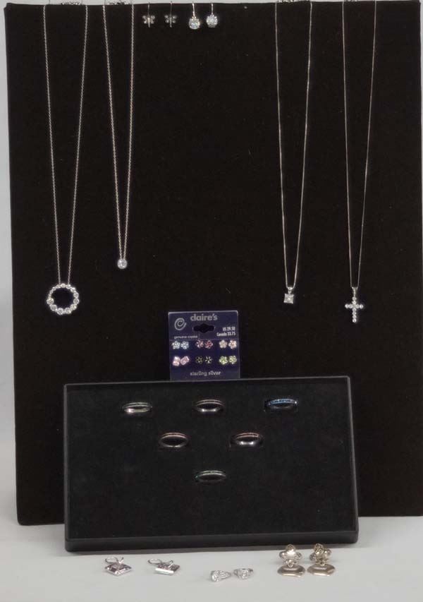Large Collection of Sterling Silver Jewelry, nice lot for resale, all are marked .925, includes 11 pairs of earrings, 4 CZ necklaces with sterling silver chains, and 6 Eternity Band Rings, largest pendant is the circle which measures 1'', longest chain measures 18'', rings range in size from 7 to 8.5