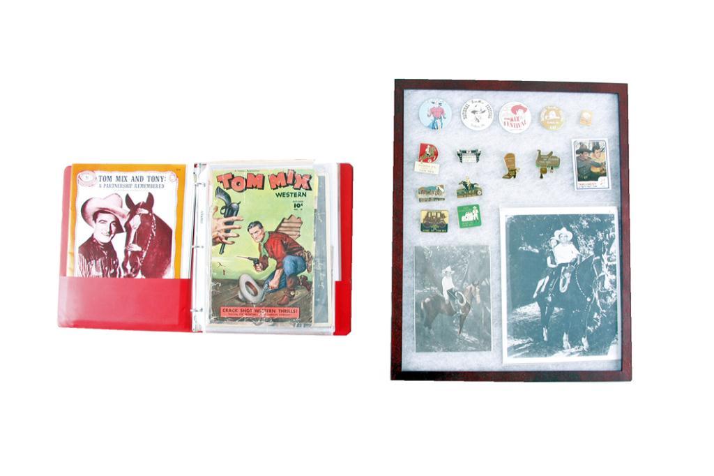 Large Collection of "Tom Mix" Memorabilia Includes a Tom Mix 1947 Fawcett Comic Book #15, shows age; a Tom Mix 1946 Fawcett Comic Book cover in overall good condition; and original signed Tom Mix "Ralston Straight Shooters" western movie action photoIncludes a Tom Mix 1947 Fawcett Comic Book #15, shows age; a Tom Mix 1946 Fawcett Comic Book cover in overall good condition; and original signed Tom Mix "Ralston Straight Shooters" western movie action photo; "The Fight at Quarter Circle WRanch" series V photo of the inside of the quarter circle ranch house with Tom Mix and his horse Pony ready to ride out after two guns; a pictorial documentary of Tom Mix and Pony "A Partnership Remembered by Richard Sieverling"; other assortedmemorabilia movie cards, western comic book sheets of Tom Mix, also includes thirteen Tom Mix buttons and pins framed.