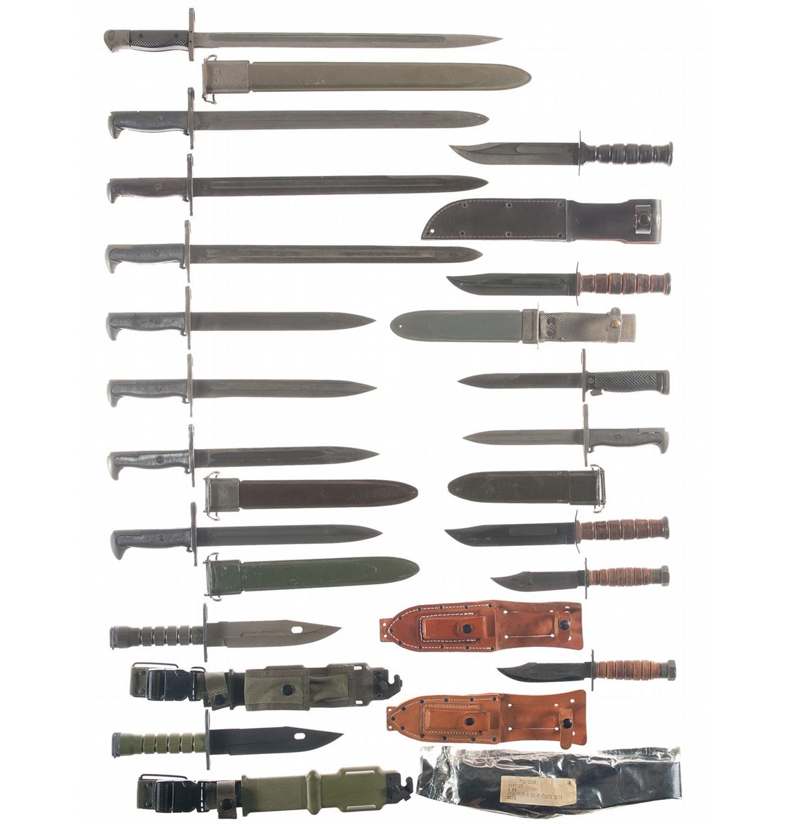 1 1942 dated U.F.H. M1942 bayonet, 1 1942 dated UC M1942 bayonet, 1 1911 dated RIA M1905, 1 unmarked M1917 style bayonet with plastic grips and fiberglass scabbard (sharpened), 1 1955 dated FKF Danish GM50 bayonet with M1, 1 U C M1 bayonet, 1 11 1/4" OAL M1905E1 style bayonet with scabbard, 1 1943 dated OL M1905E1 bayonet, 1 M1905E1 bayonet marked "60-6/KS" with scabbard, 1 U.S. M6 bayonet, 1 dark green LanCay M9 bayonet with scabbard (scabbard has pouch on the front and sharpening stone on the back), 1 light green Ontario Knife Co. M9 bayonet with scabbard, 1 U.S. M6 bayonet in original packaging, 2 WWII pilots knives with sheaths and sharpening stones, 1 Camillus Mark 2 knife with fiberglass sheath, 1 Conetta Mark 2 knife with leather sheath and 1 Camillus Mark 2 U.S.N knife.