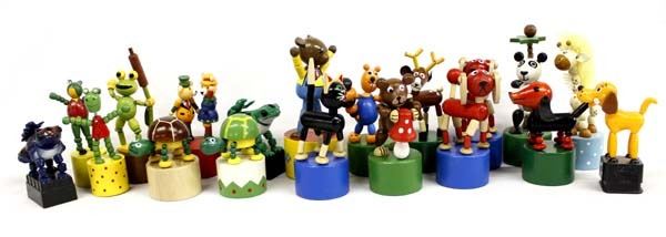 Hummert Estate: Large Collection of Vintage Animal Push Puppets, includes Ernest the Bear, most are made in the Czech Republic for Petra Toys, most are wood, however there are some plastic (Kohner for TM), largest measures 5.5'' tall, 18 pieces in all