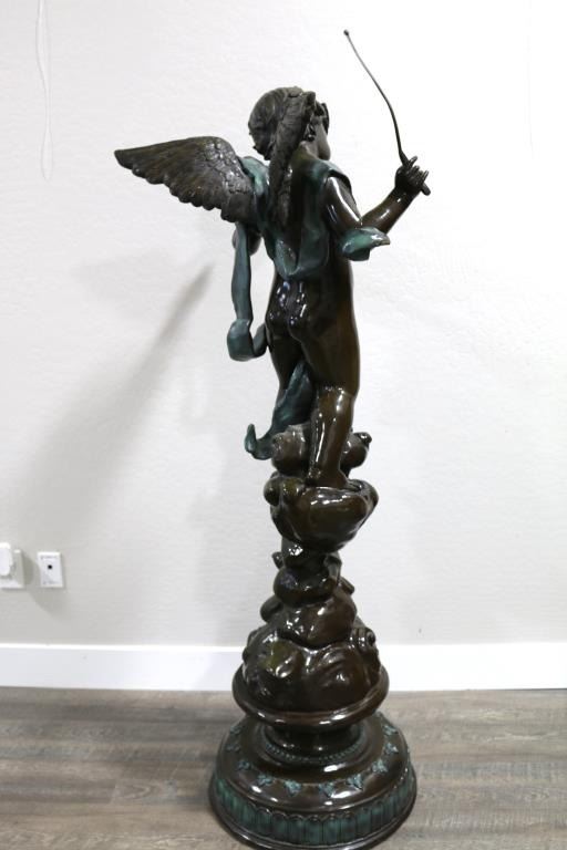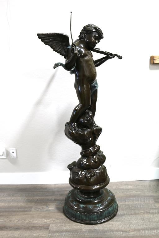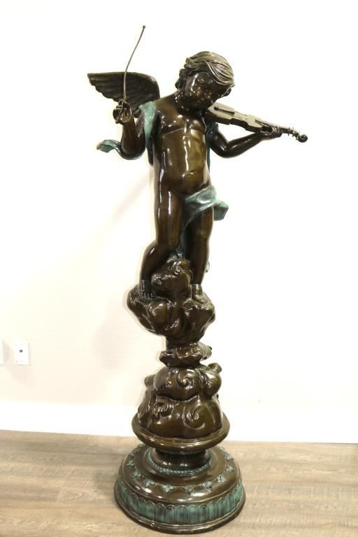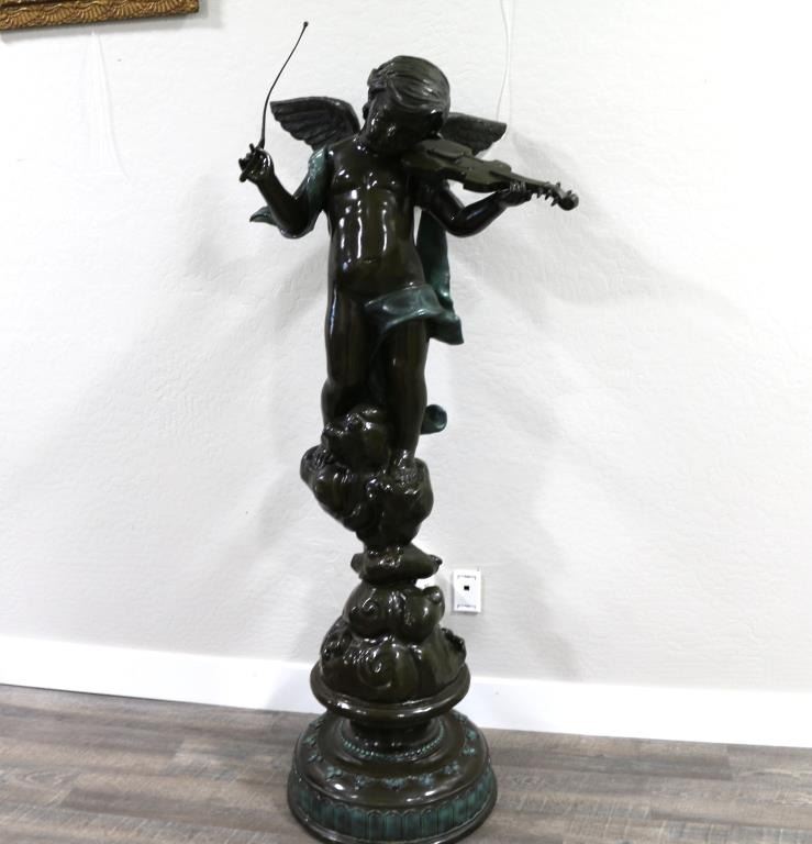 Restrike of a cherub playing fiddle. Measures 68" tall x 30". Signed. BUYER MUST ARRANGE OUTSIDE SHIPPING.