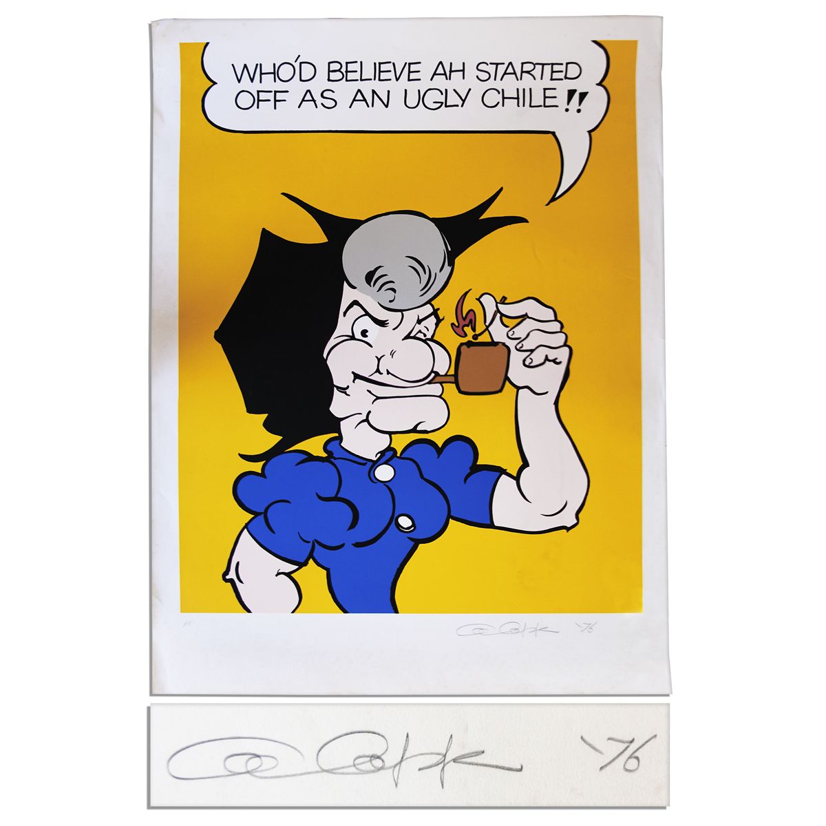 Al Capp oversize poster, likely silk-screened, depicting the famed ''Li'l Abner'' character Mammy Yokum with her signature corn cob pipe. Painted in tones of blue, black and yellow paint, poster measures 36'' x 50'' and is signed in pencil, ''Al Capp '76''. Near fine.