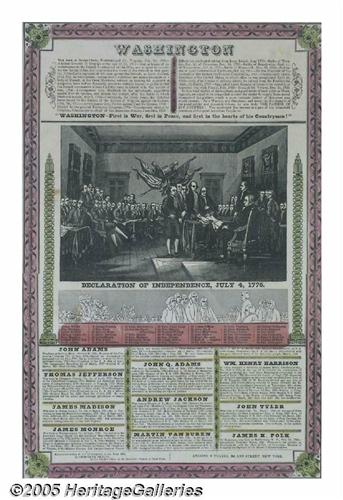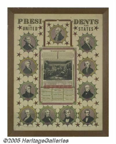 <B>Large Colorful Poster of the U.S. Presidents Up Through Incumbent James K. Polk</B></I> Dated 1846, and apparently produced by two printers for their respective markets: Rufus Blanchard, Cincinnati, and D. Needham, Buffalo, as names and addresses of both firms appear at bottom. Not to be confused with the much smaller Presidential-series prints done by Currier and others in the 1840s. This is a large poster, 25 1/2" x 34" as framed. In the center is a vignette of the signing of the Declaration of Independence, along with a short biography of each President. A very attractive and impressive display item with substantial presence. Lot:256