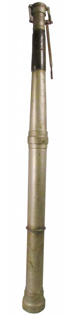 Large Completion Fire Nozzle, Ca. 1860. Cap piece on tip. Nickel over brass with leather handgrip near tip. Minor dents and separation of leather stitching otherwise good condition. 42 inches tall.
