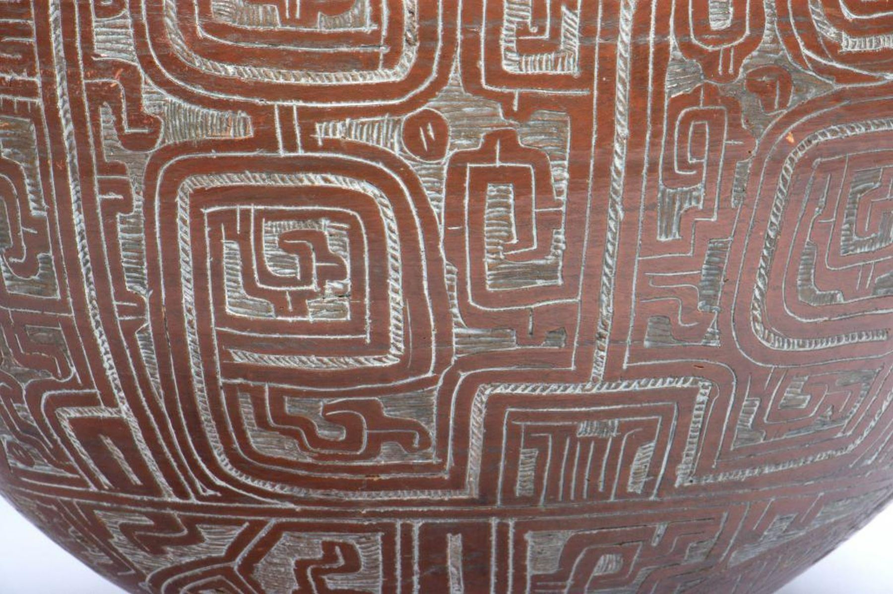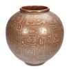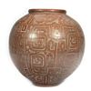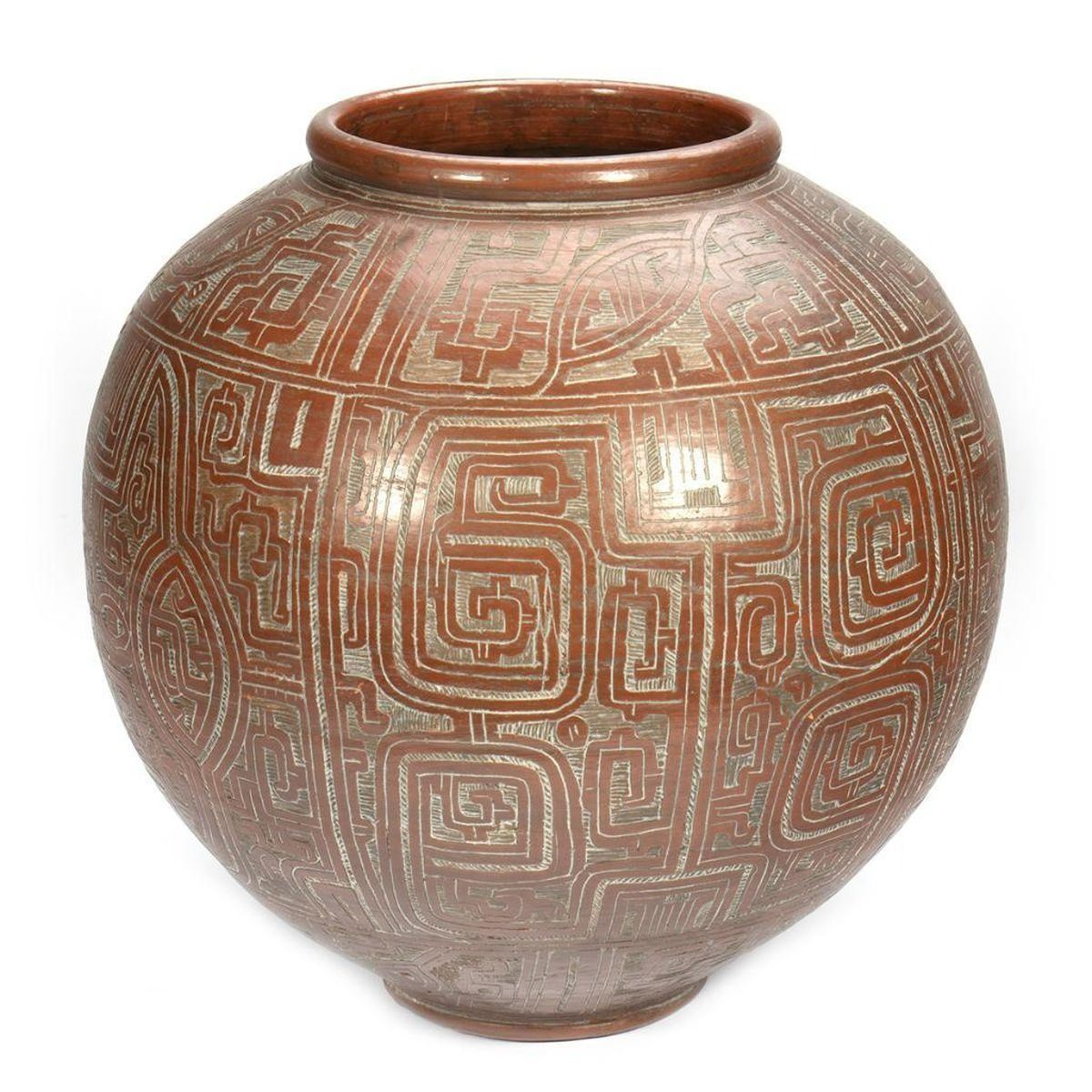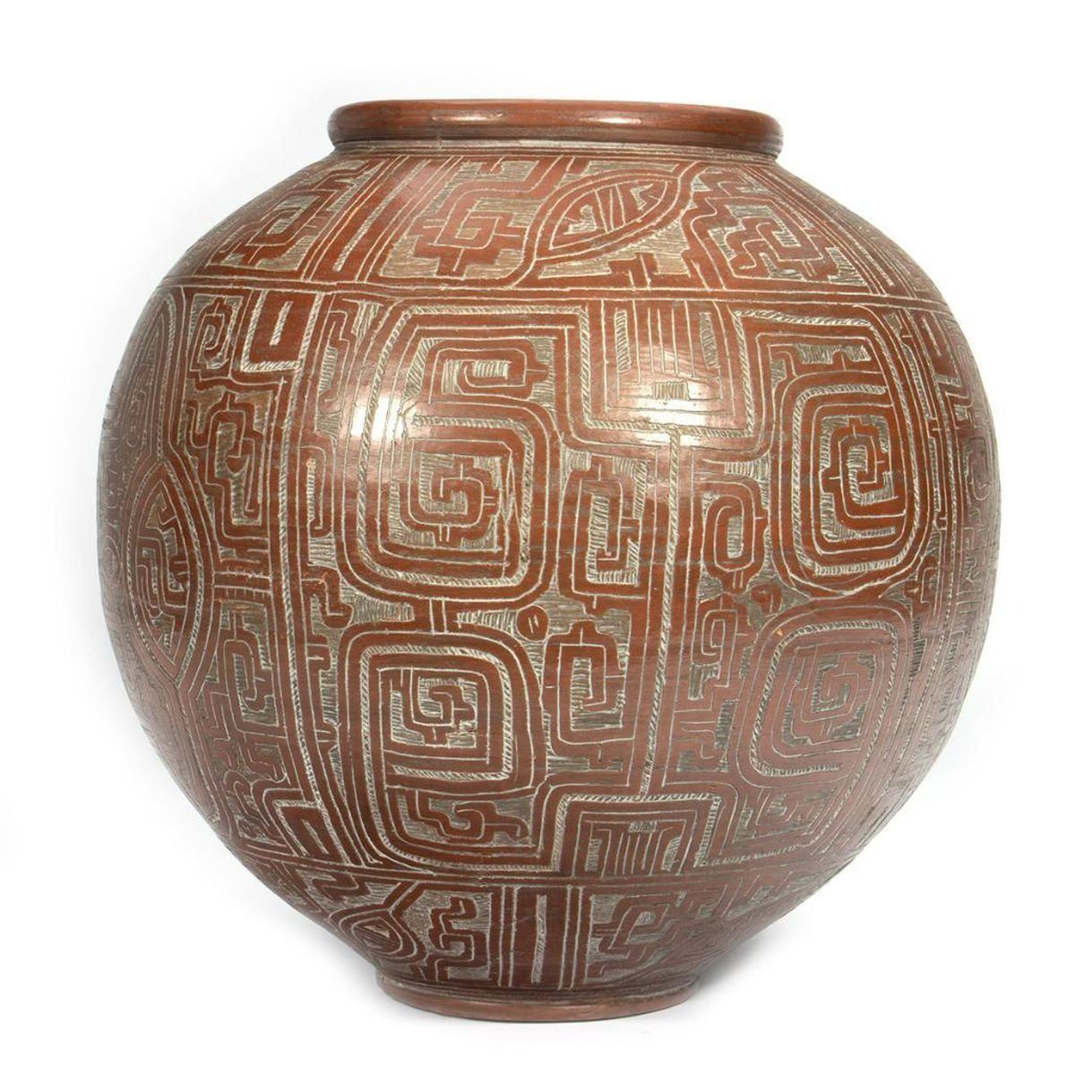 Signed/dated: R. Cardoso / [19]89. The red-glazed pot with incised geometric design. 15 3/4in. tall, approx. 16in. diam., and approx. 50 1/2in. circumference. Good condition. Note: Large for shipping.
