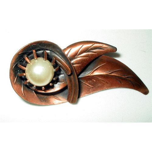 A very pretty copper brooch of swirling leaves with a really large claw set pearl color bead of 15m. Excellent and flawless condition, measures 2-1/2" x 1-1/4" Highly detailed and etched. Just lovely.