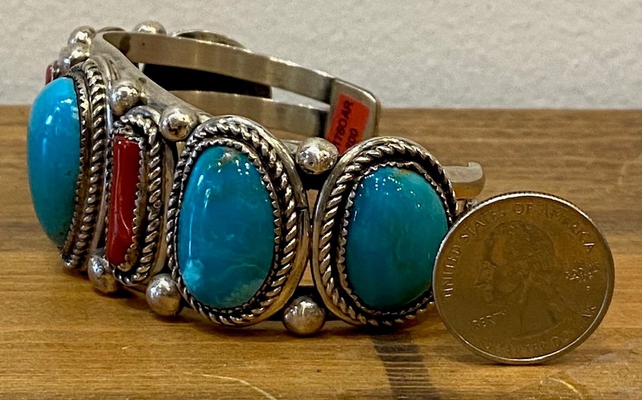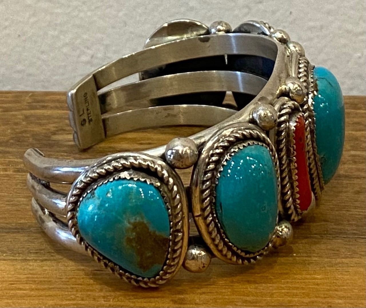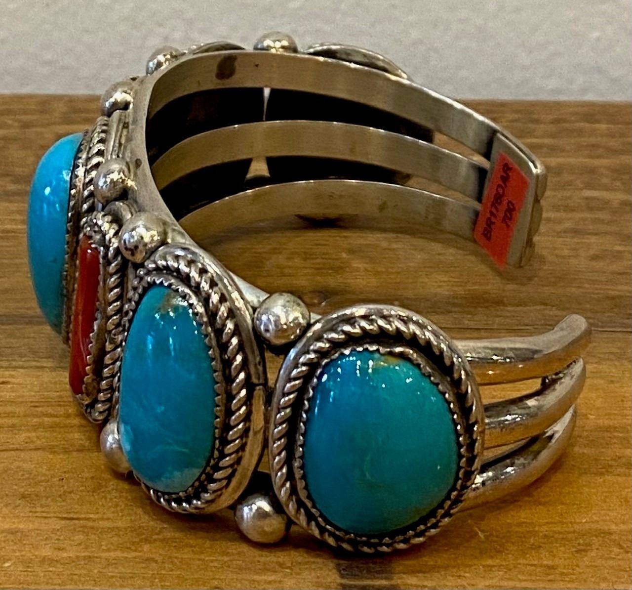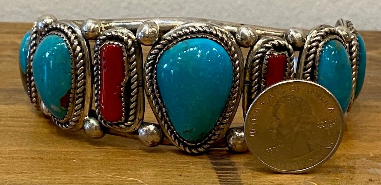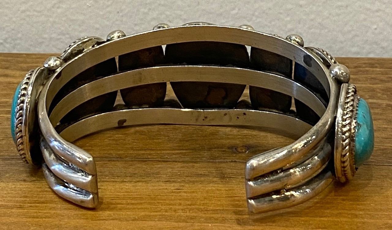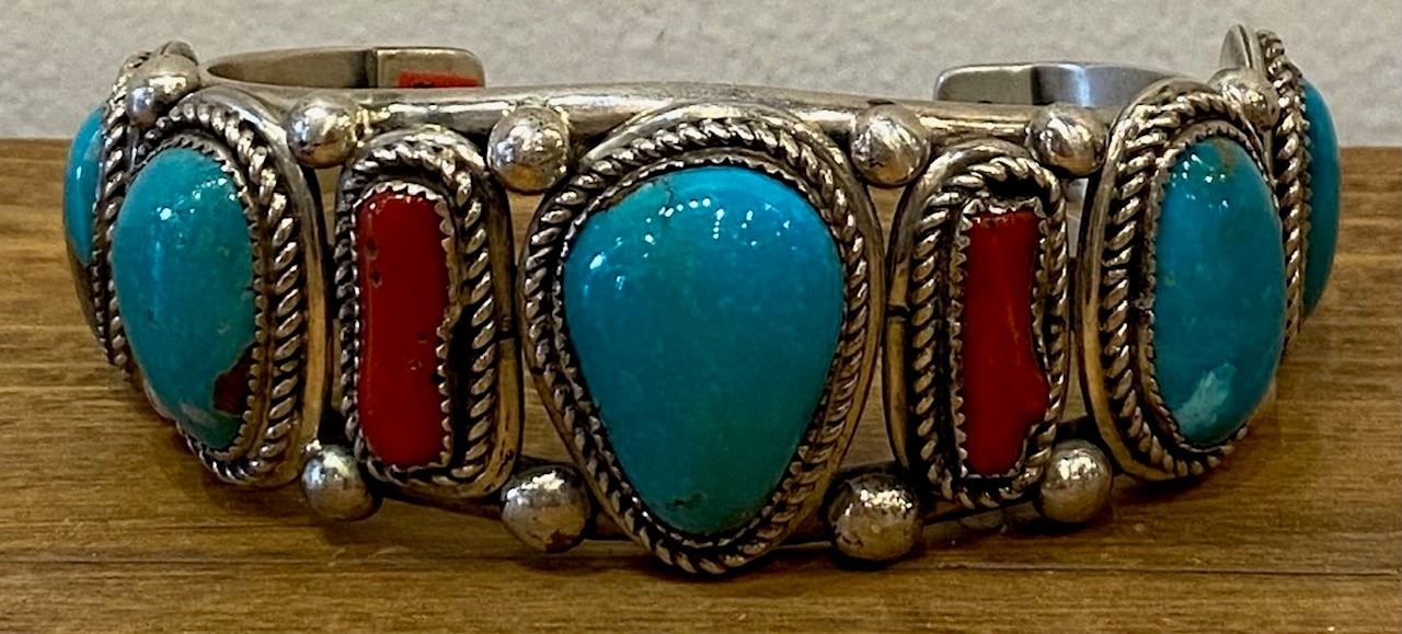 Bracelets measurements are opening, inside circumference, height. Weights are in Grams and are weighed to the best of our ability. The term signed means that, in our opinion, the signature is by the artist. All dating, Turquoise and hallmark attributions are to the best of our knowledge. Attributions are subjective and should be taken as such. Attributions in the description of any lot is left to the buyer to determine accuracy and the gallery is not responsible for any errors or omissions.