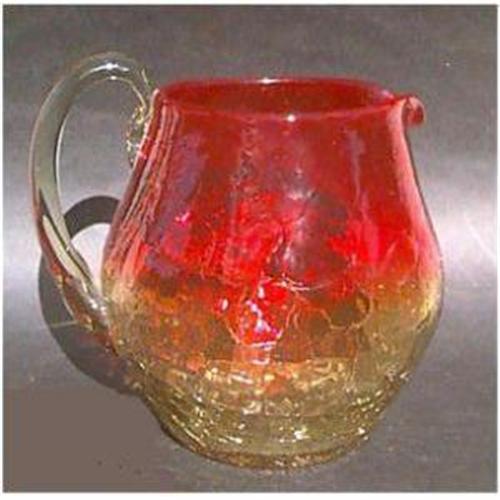 Large Crackle Glass Pitcher in amberina. This is a nice water pitcher, with large cracks. Blenko Glass Company. Hand made with pontil mark. Large handle to hold the contents. 5 1/2"" tall and 4"" cross.