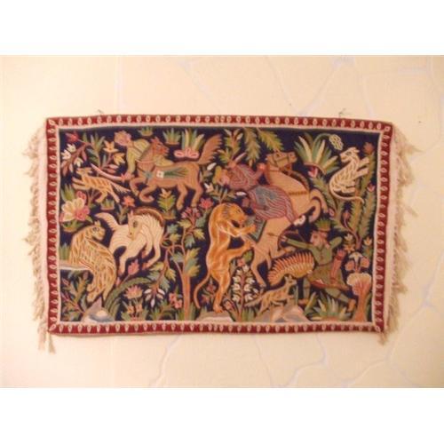 This sampler is truely a work of art. Depicting a hunting scene. I am unsure of it's age or origin but it has an India feel.Made of all wool. This entire piece is hand done crewel stitching. Measures 37 inches by 21 inches. There is some insect damage but I had to get close to see it, this does not detract from it's beauty. More pictures are available upon .request.