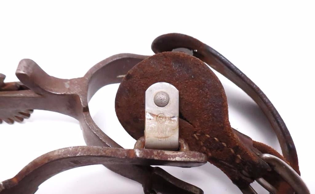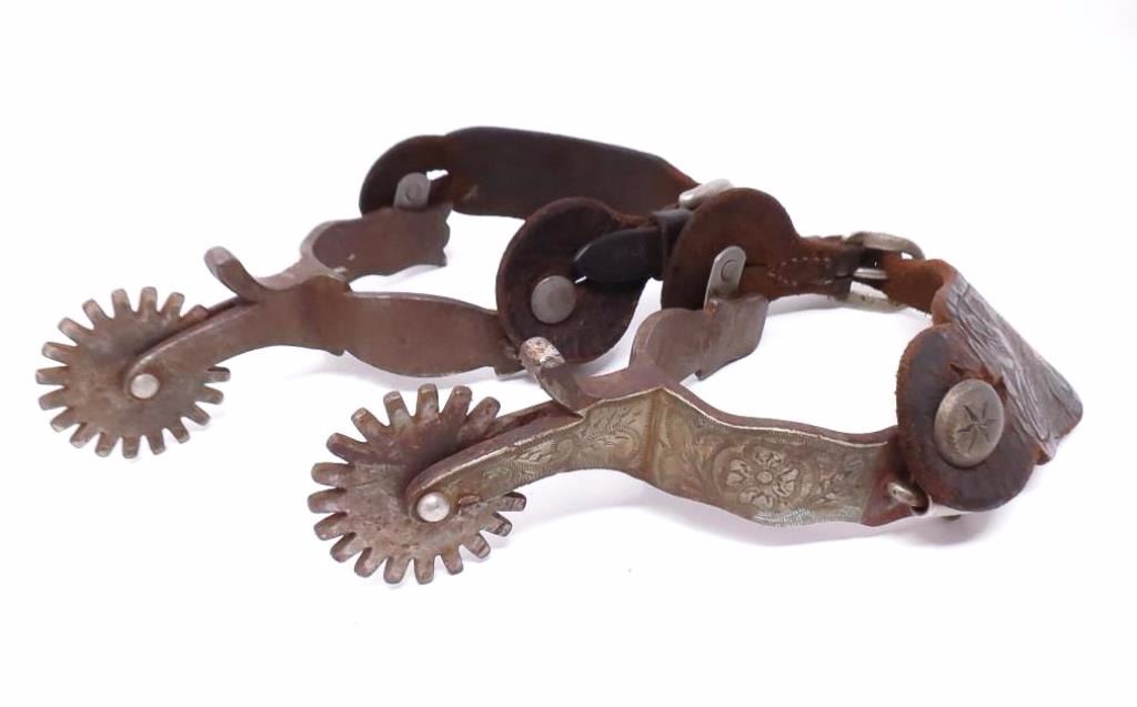Single mounted with engraved silver. 2" rowels, swinging buttons, chap guard and original stamped straps.