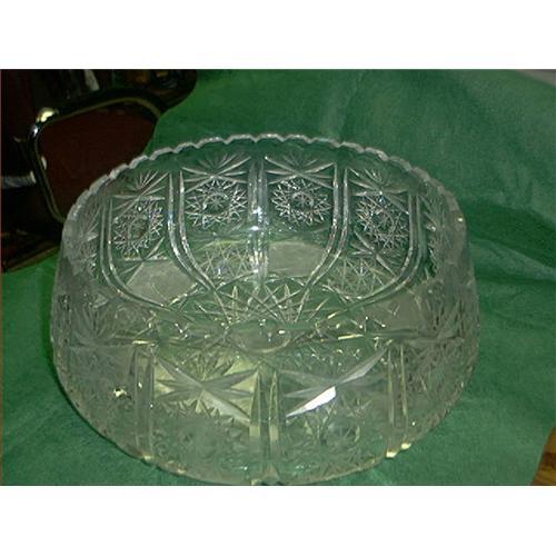 Large Cut Crystal Center Dish. Rim to rim is 10" L. 4" Depth. Base is approx. 12" L. Very heavy piece. Has some small minor chips around lip. Very minor though. Very beautiful piece. I'm surprised not to see a signature on it.