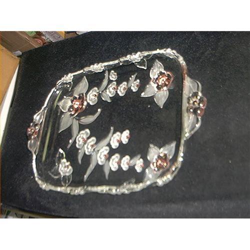 Large Crystal Platter with clear to frosted to red flowers. It is truly one of the most beautiful platters I have ever seen. The designed flowers and leaves are standing out of the bottom making it the base to sit on. Simply unreal and the frosted and clear colored rose handles are a work of art. A show piece that you will be proud to show it off. They will comment on how beautiful it is. I do not see any marking on it, and am surprised about that, as it is so fantastic and colorful, you would figured that it be signed somewhere. It is 16 1/2" long and 11 1/4" Wide and 2" High. In perfect condition and this is one piece you will be proud you bought. A great gift item, for sure, and a great add to any collection of beautiful art colored platters you may have. Hope you enjoy it.