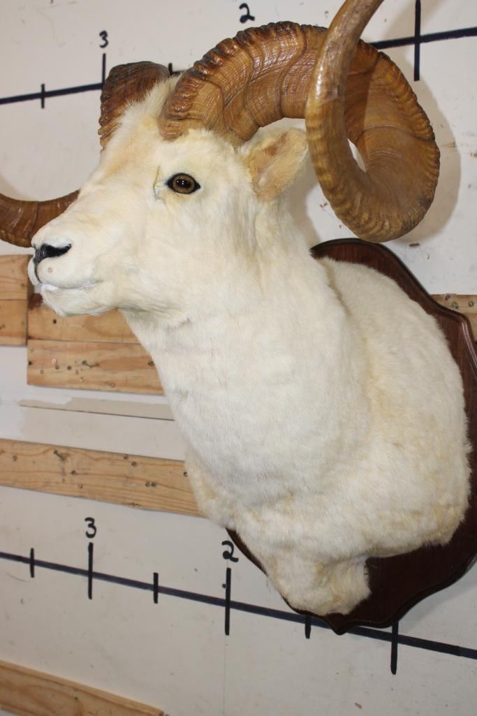 Large DALL SHEEP Ram Shoulder Mount on a Wood Plaque. It has *Real Horns* with reproduction Horn Tips. The owner of this mount had the Horns extended. The Left Horn measures 37 3/8" Long and 13" around the Horn Base. The Right Horn measures 37.75" Long and 11.75" around the Horn Base. *This was sold in our last auction, the bidder did not pay. It is being resold*. TAXIDERMY