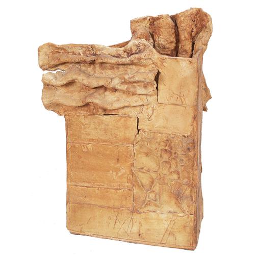 Large Daniel Rhodes block vase, slab-built form in unglazed stoneware, incised signature, 25"w x 34"h, minor repairs