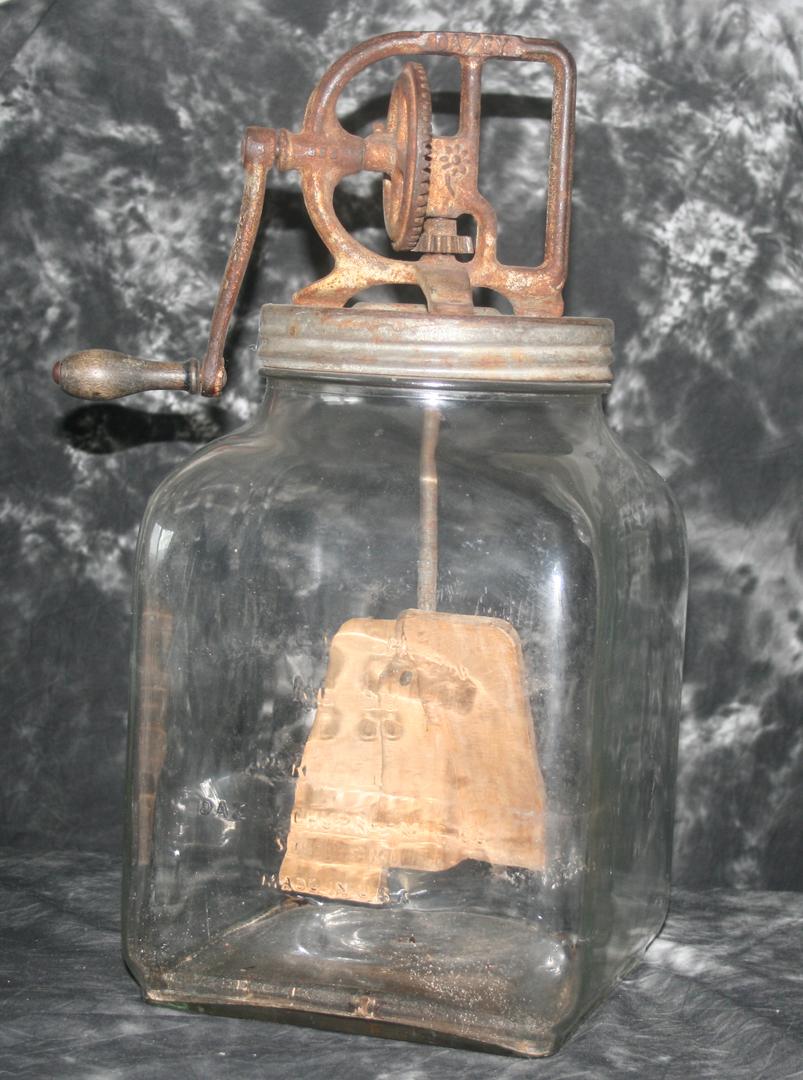 Large Dazey Butter Churn #80. Embossed letters on the glass read "Dazey Churn, No. 80, Patented Fen 1922, Dazey Churn & MFG CO., St. Louis MO, Made in USA". Mechanics still working smoothly. Handle marked 60H. 16" tall. Great primitive piece!