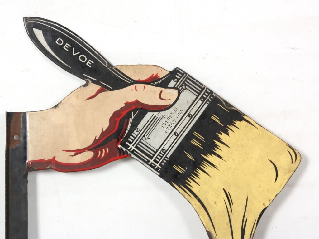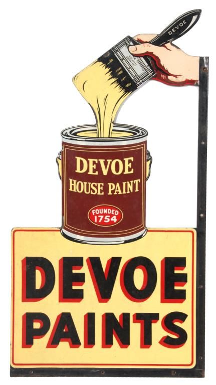Large Devoe Paint 2 Sided Porcelain Sign. Wall mounted porcelain sign has a hand at the top dipping a paint brush into a can of Devoe House Paint, Founded 1754; over a banner that reads Devoe Paints. In overall very good condition, has some minor chipping around the edges. 46.5 in high x 25.25 in. wide.