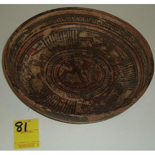 Large Dish, 10 wide x 3, luna type, polychromo, highly decorated inside, monkey in center and around inside edges plus other decorations, one crack neatly repaired with contemporary material 800-1200 AD