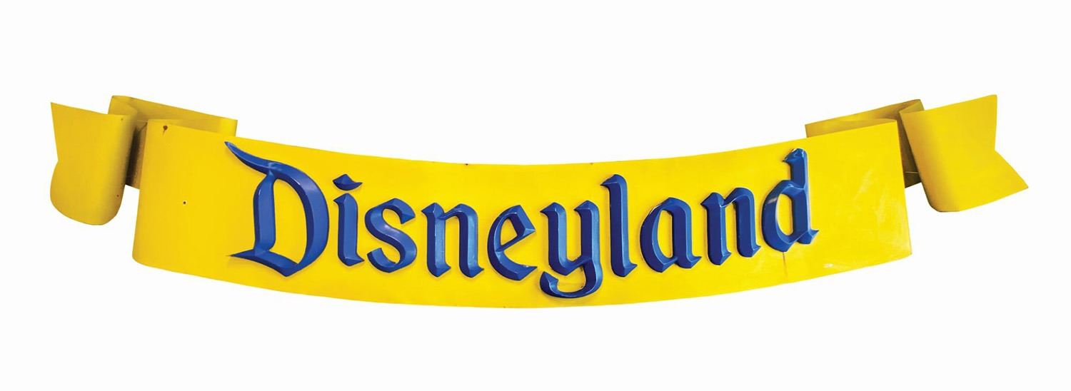 (Disneyland, 2005) A very large sign used at Disneyland during the park's milestone 50th anniversary celebration. The sign is composed of metal, with dimensional letters that spell out "Disneyland" around a curved metal body. Only a few signs of this size were created for the anniversary event, and were placed at key locations throughout the park. It is difficult to imagine an item that more perfectly captures the overall experience of the park's historic 50th anniversary than this large park-used sign. Measuring an astonishing 25ft in length, the condition is fair, with surface wear throughout from the sign's use and removal, including some chips to the paint and small spots of rusting. This item may require special shipping arrangements. Please inquire for details and estimates.