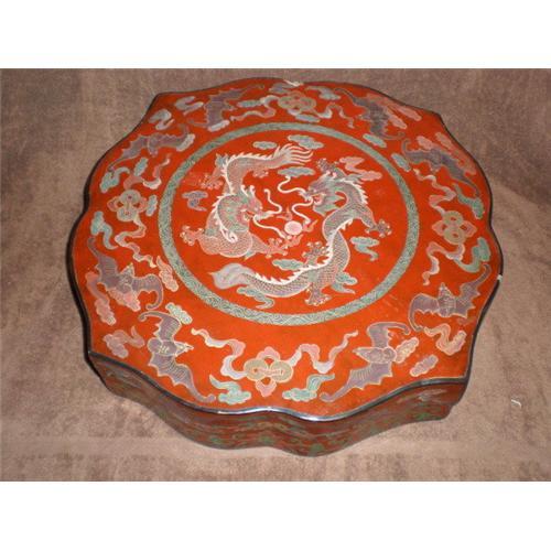 Large Double Dragon Poly Chrome Lacquer Box. This lacquer box up for auction is a real beauty. It is a double imperial dragon design with other various symbolic Chinese designs. The central design of two 5 claw imperial dragons is simply stunning. Designs that also include bats, clouds, coins and other designs along the side. It is done in the Chinese lacquer red with other vibrant colors. This lacquer box is between 50-75 years old. It does have a few spots of damage, all of which have been pictured. With that said it still retains is original beauty and elegance. This box measures 18" by 18" by 5". Excellent addition to any collection. Perfect gift for that Chinese art collector. Check this one out! VERY UNIQUE SIZE, WERE CAN YOU FIND THEM LIKE THIS. VERY CLASSY & BEAUTIFUL BOX. Happy Holiday to all.