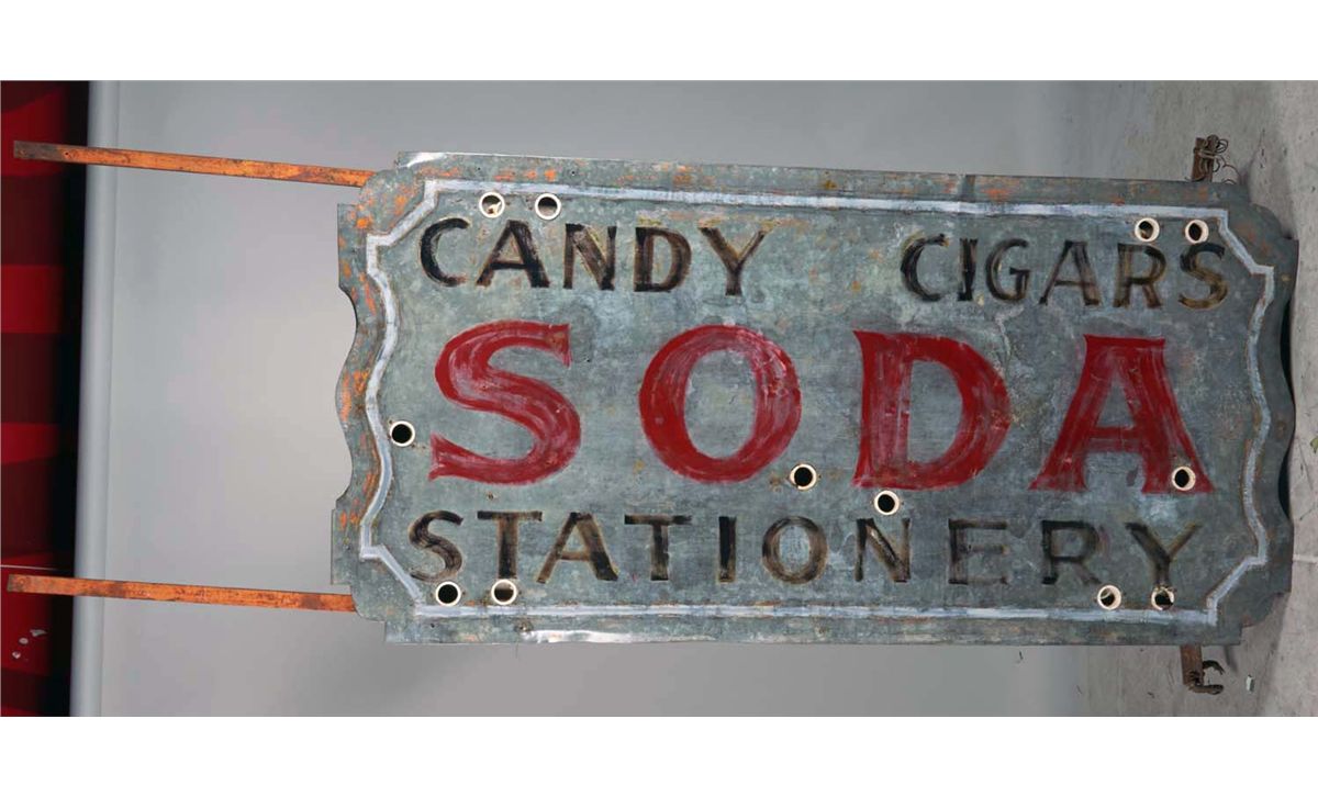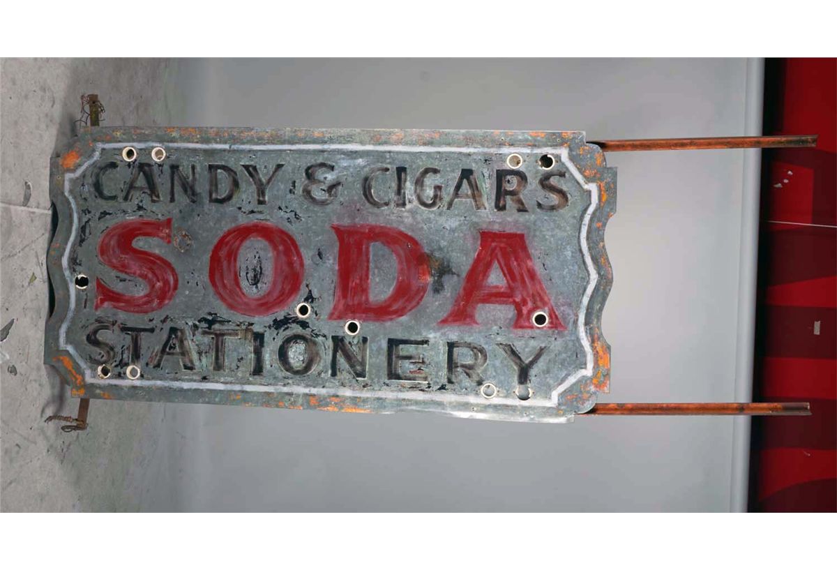 "Candy & Cigars - Soda - Stationery" from Tonopah, Nevada c1930s, On metal brackets (size with brackets increases to 7' 11" x 3' 8"), There is no neon included with this sign - it is the metal box only Condition Fair Size 6' x 2' 10"