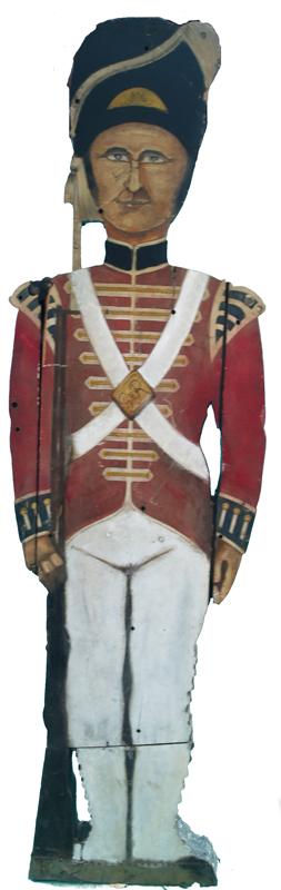 Large Double Sided Painted Wood Soldier Statue Display, from Beefeaters Steakhouse in Phoenix, AZ. c1950's - 90" tall