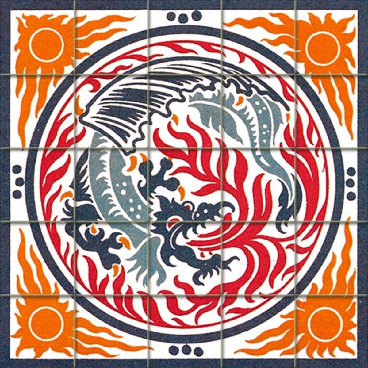Large Dragon Symbols tumbled marble tile mural, consisting of 25 glossy tiles ( 4" X 4" square ). Overall size of mural 20" X 20".Â