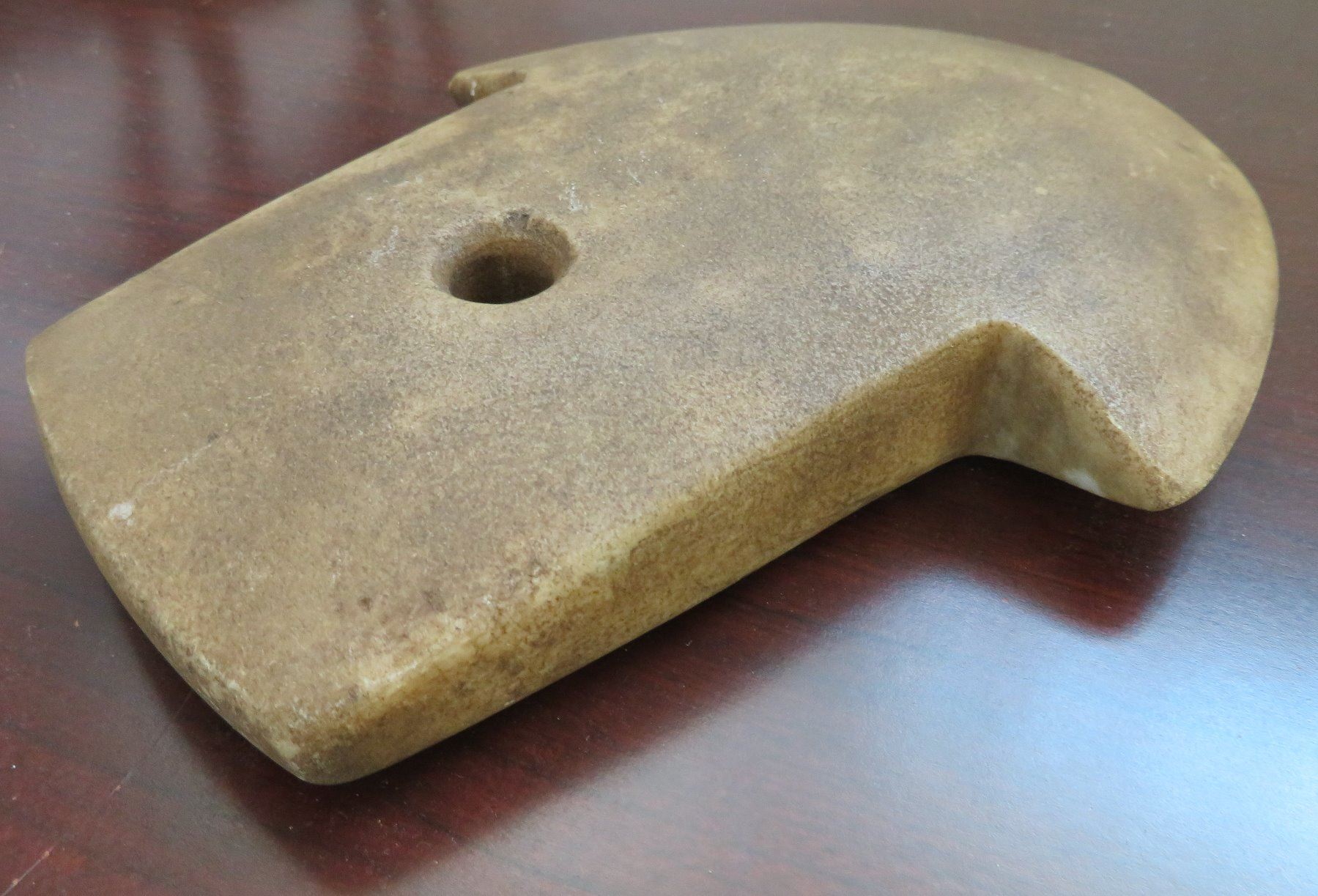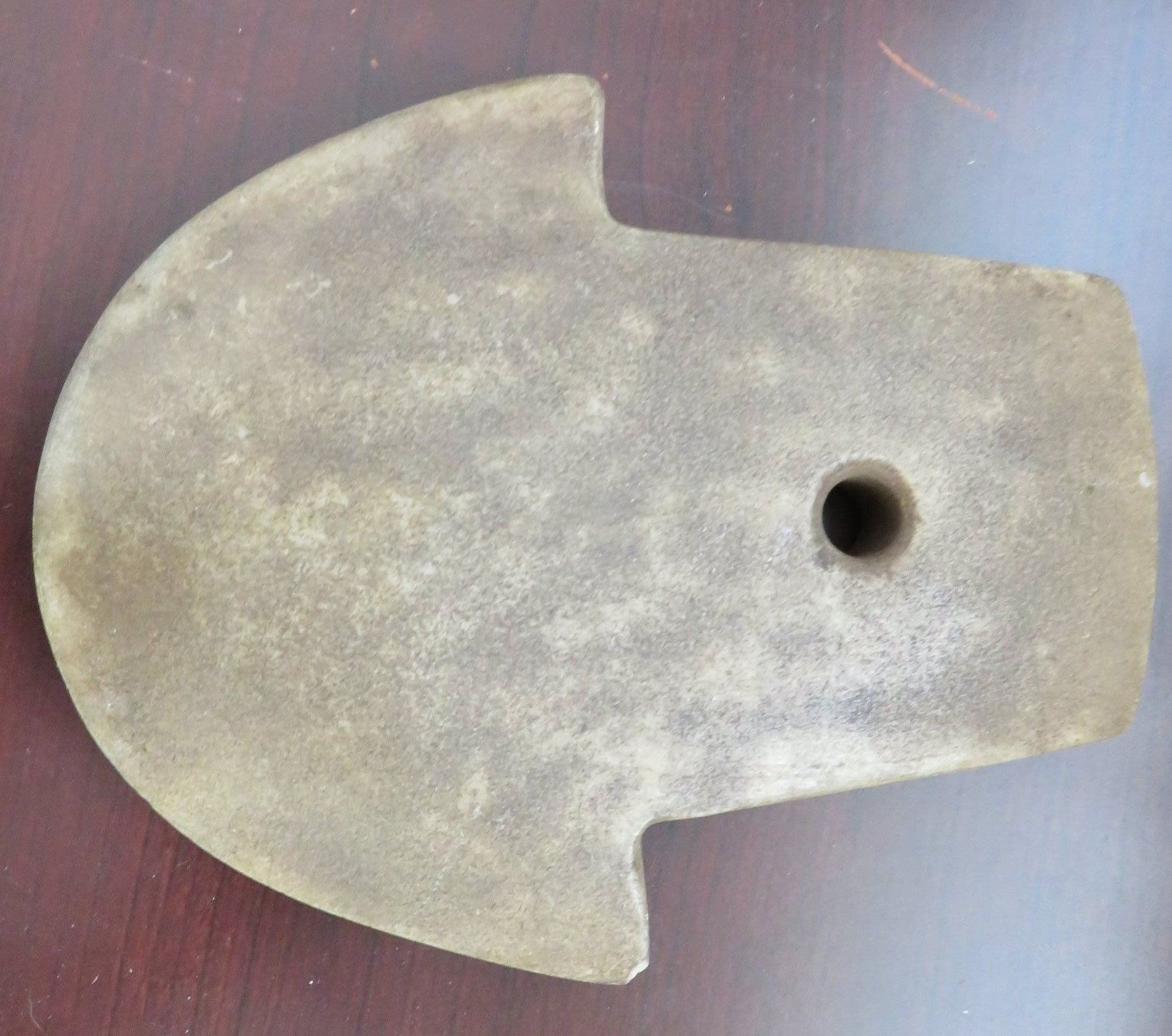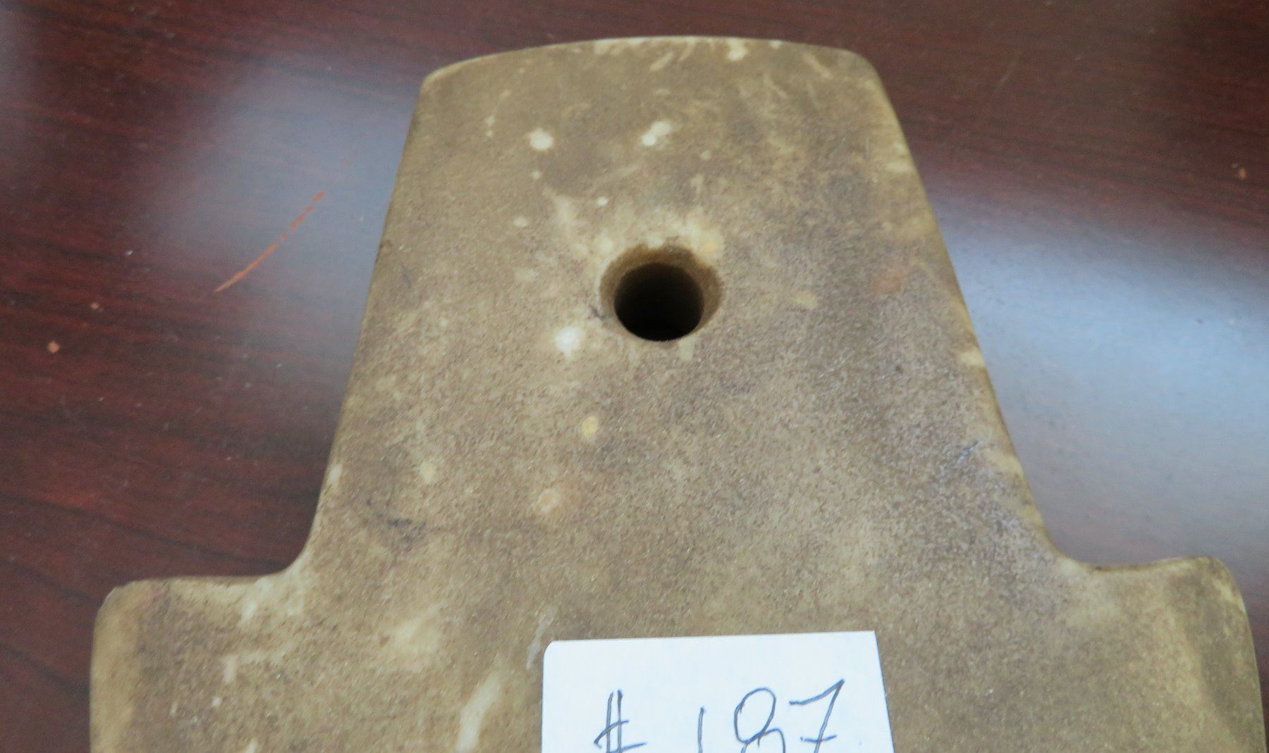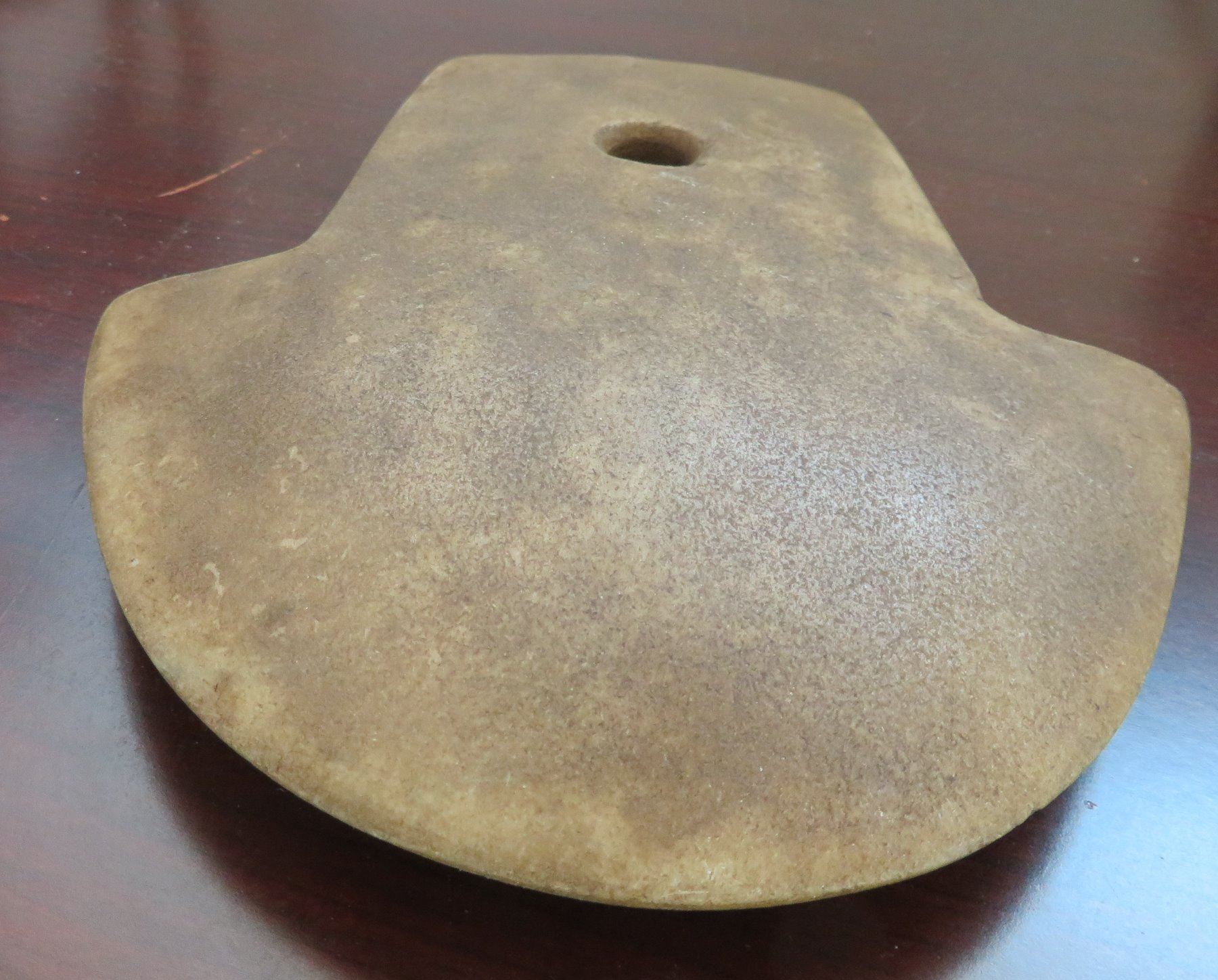 Large Drilled Spud, pre-historic item. Made of quartzite, the item measures 7 1/2" x 6" x 1". Randolph County, Indiana. Condition: Minor nicks and scrapes, see images. Shipping: $35.00 w/insurance and signature, double-boxed, due to value.