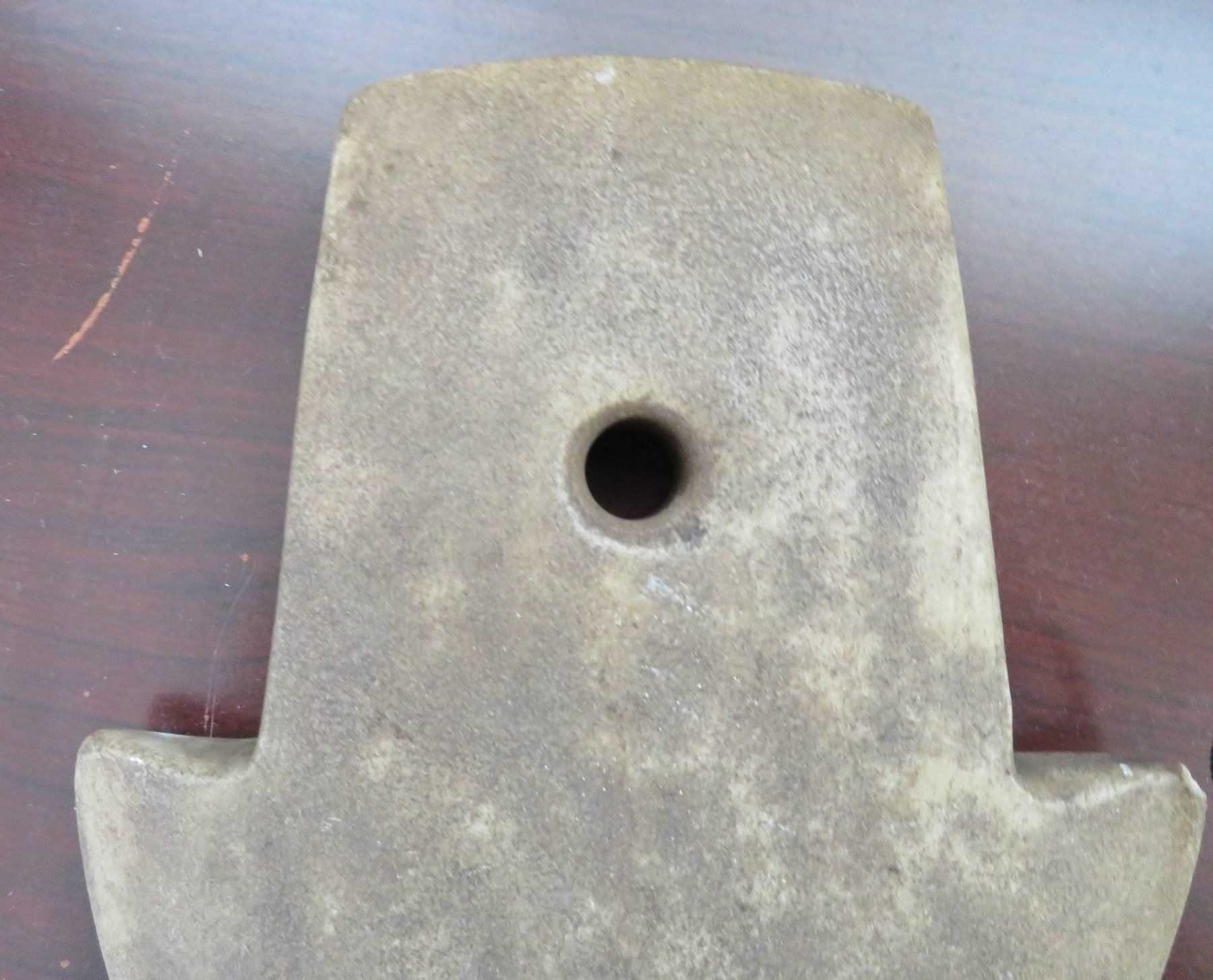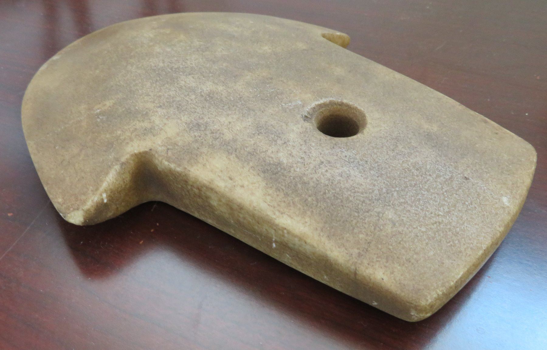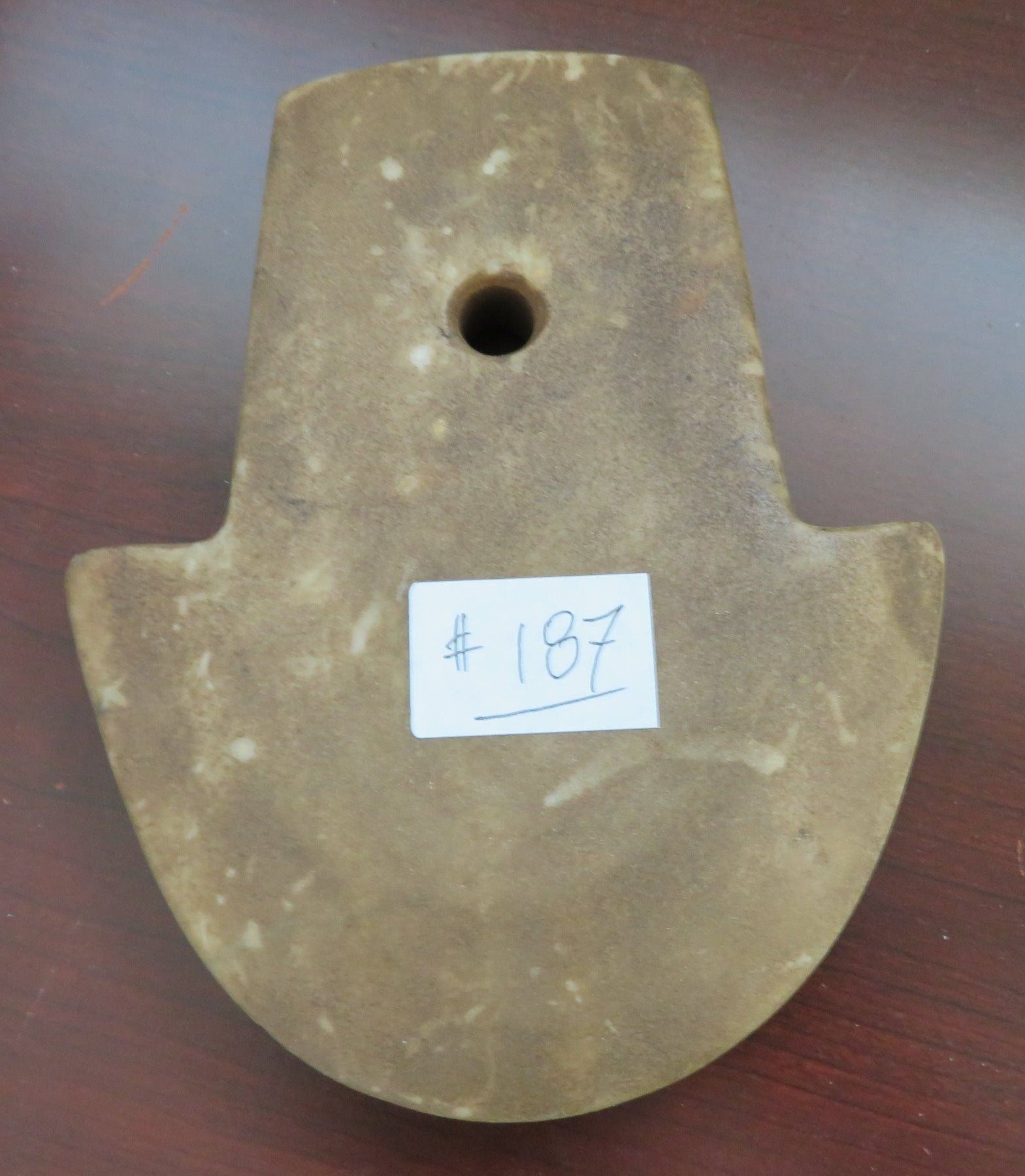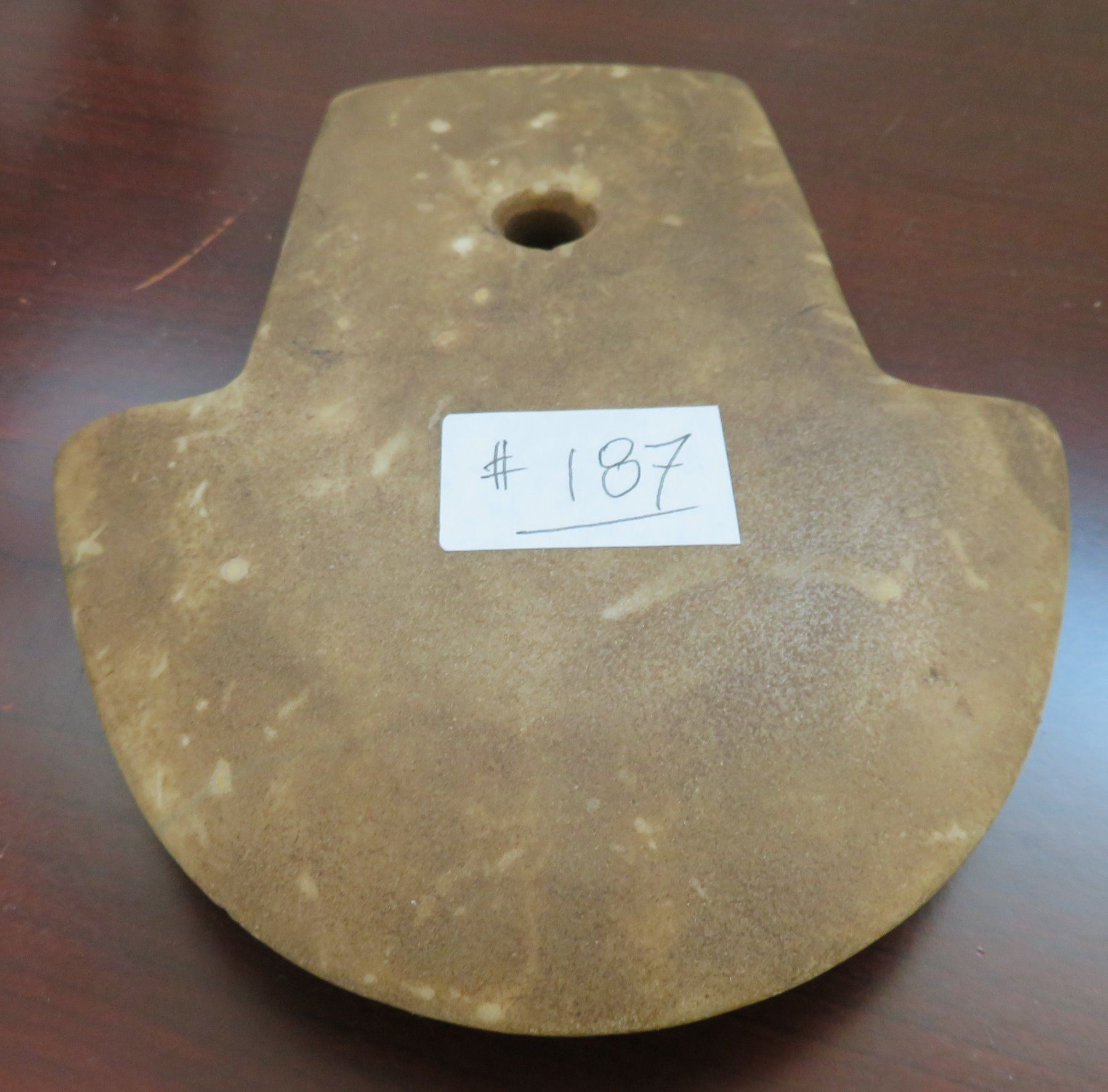 Large Drilled Spud, pre-historic item. Made of quartzite, the item measures 7 1/2" x 6" x 1". Randolph County, Indiana. Condition: Minor nicks and scrapes, see images. Shipping: $35.00 w/insurance and signature, double-boxed, due to value.